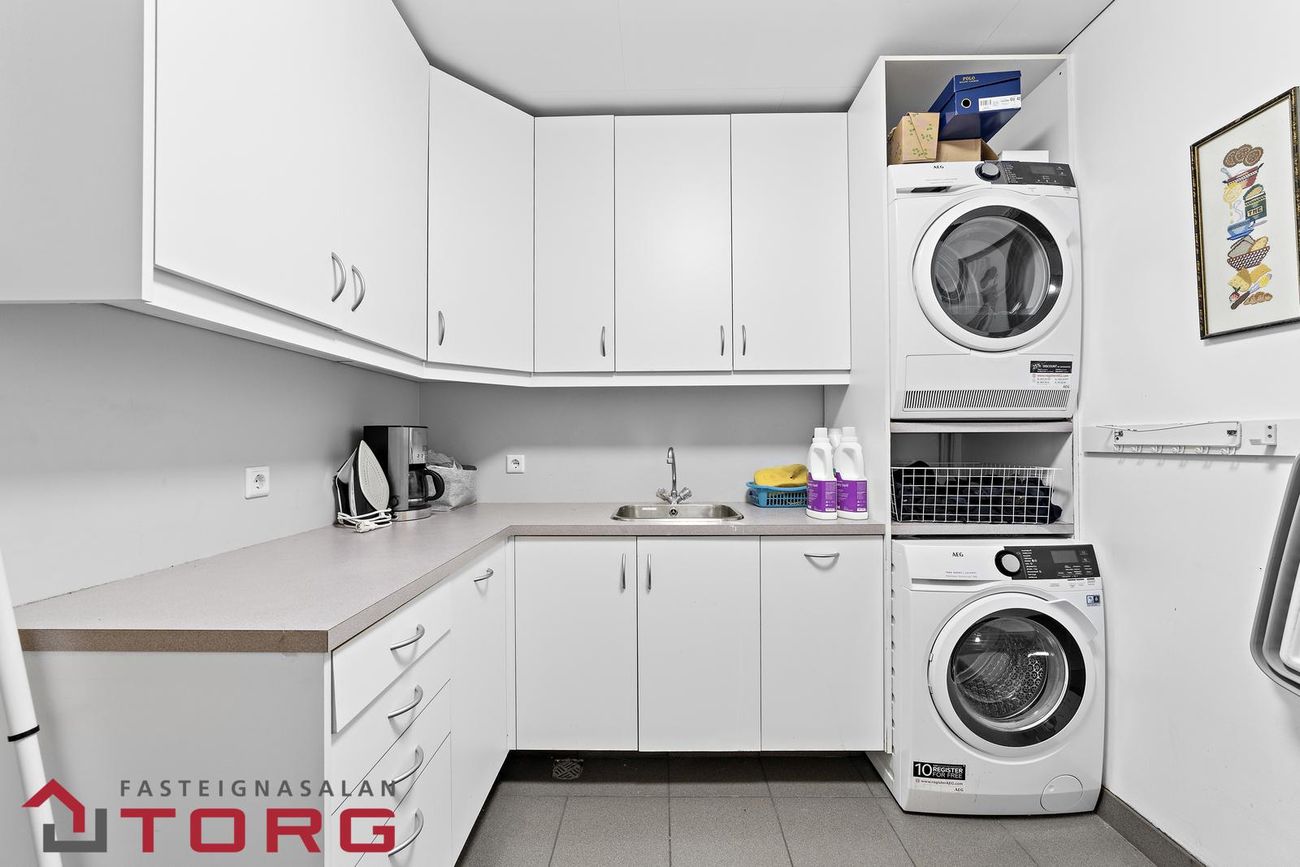 Þvottahúsið er flísalagt með rúmgóðri innréttingu og góðu skápaplássi. Aðstaða er fyrir þvottavél og þurrkara í vinnuhæð og gengið þaðan inn í bílskúr.