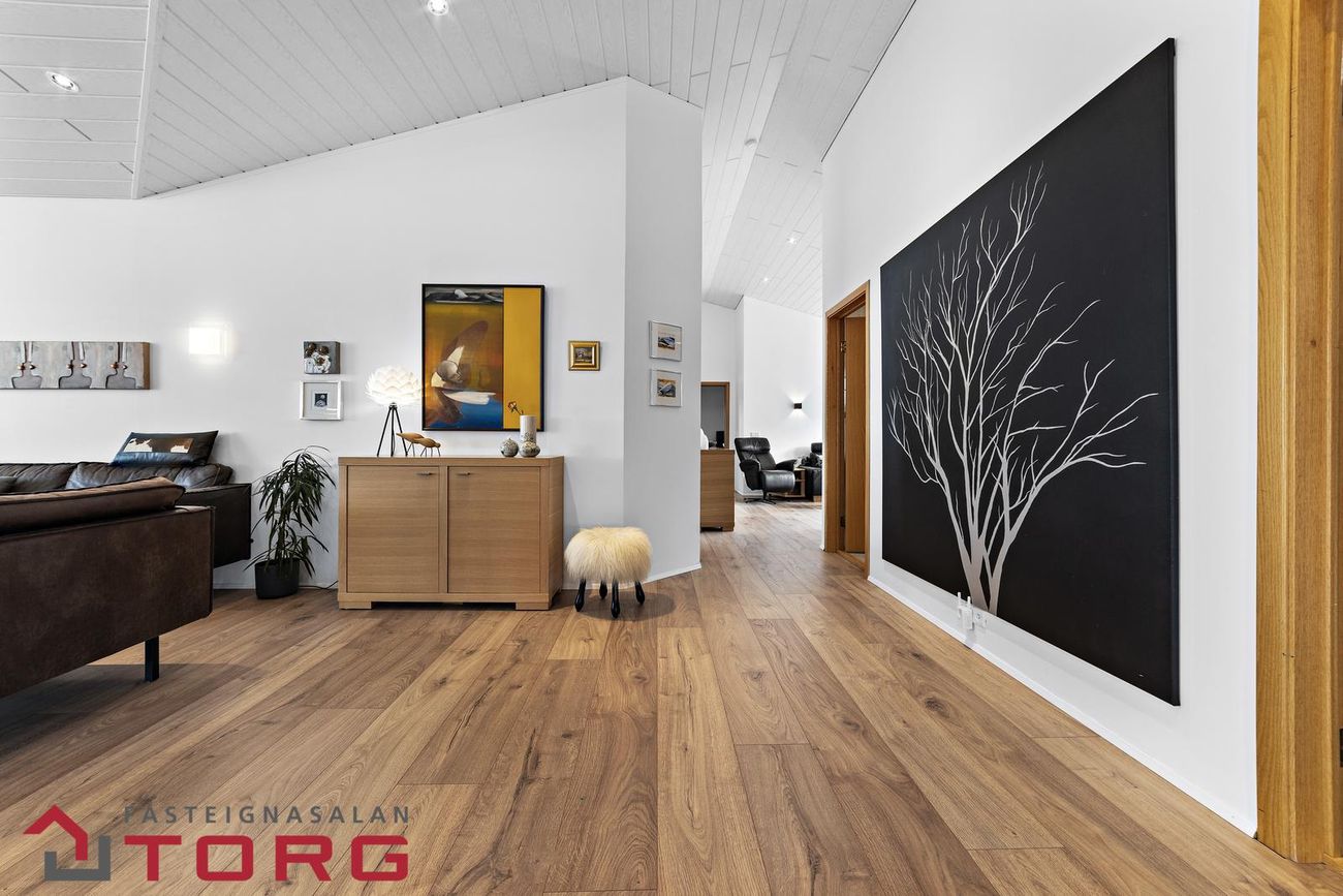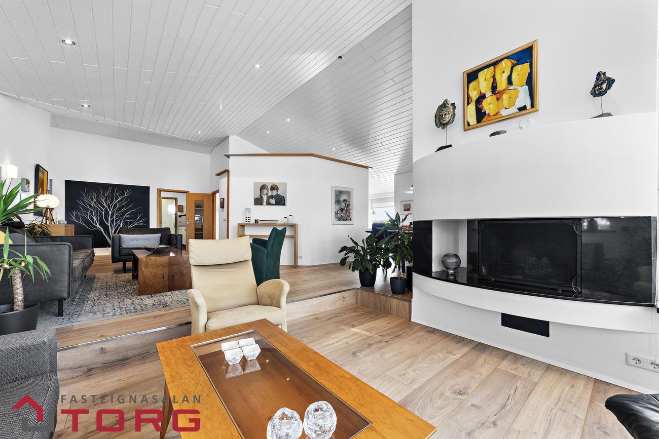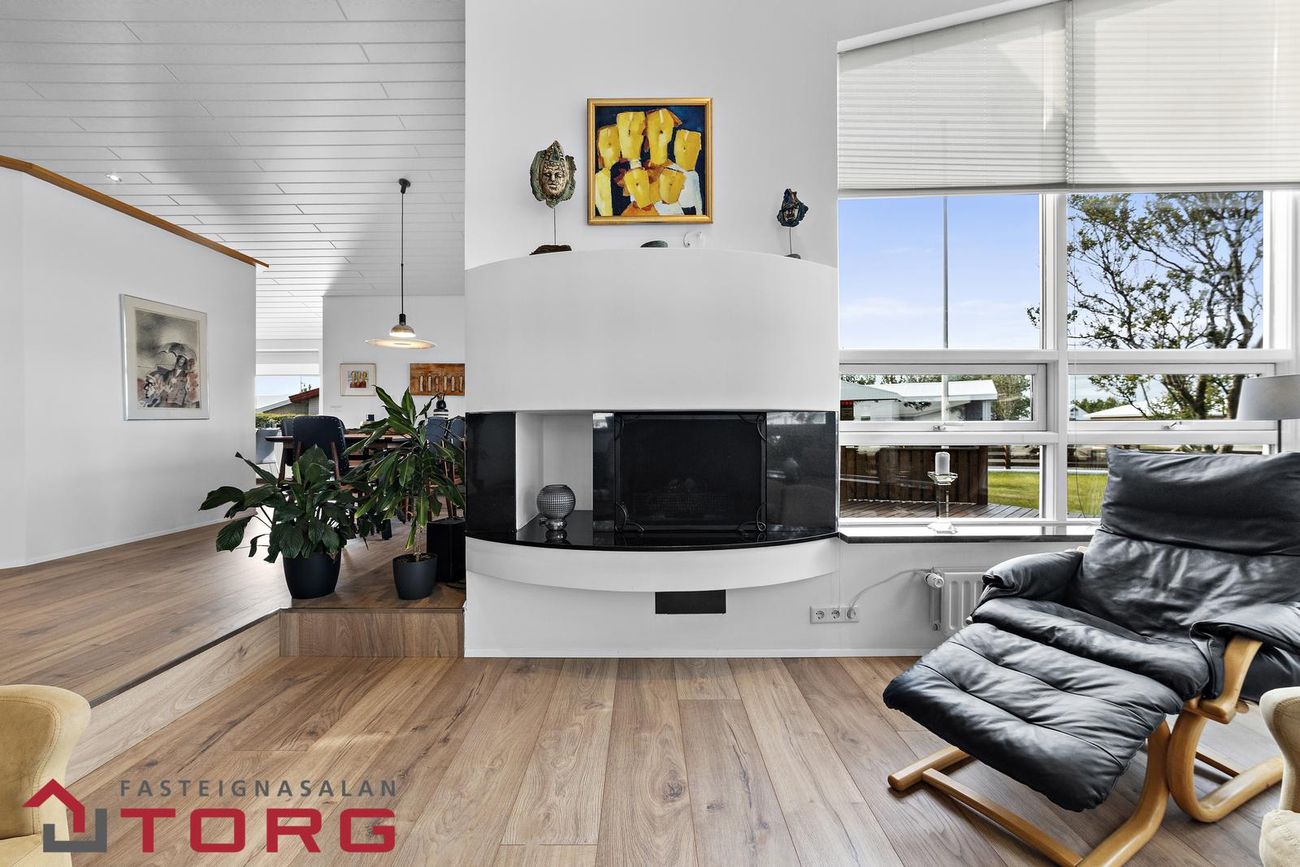 Stofan er björt og rúmgóð með mikilli lofthæð og stórum gluggum sem hleypa inn góðri birtu. Þar er einnig arinn og sjónvarpsrými með útgengi út á verönd.