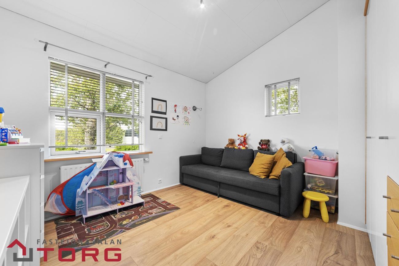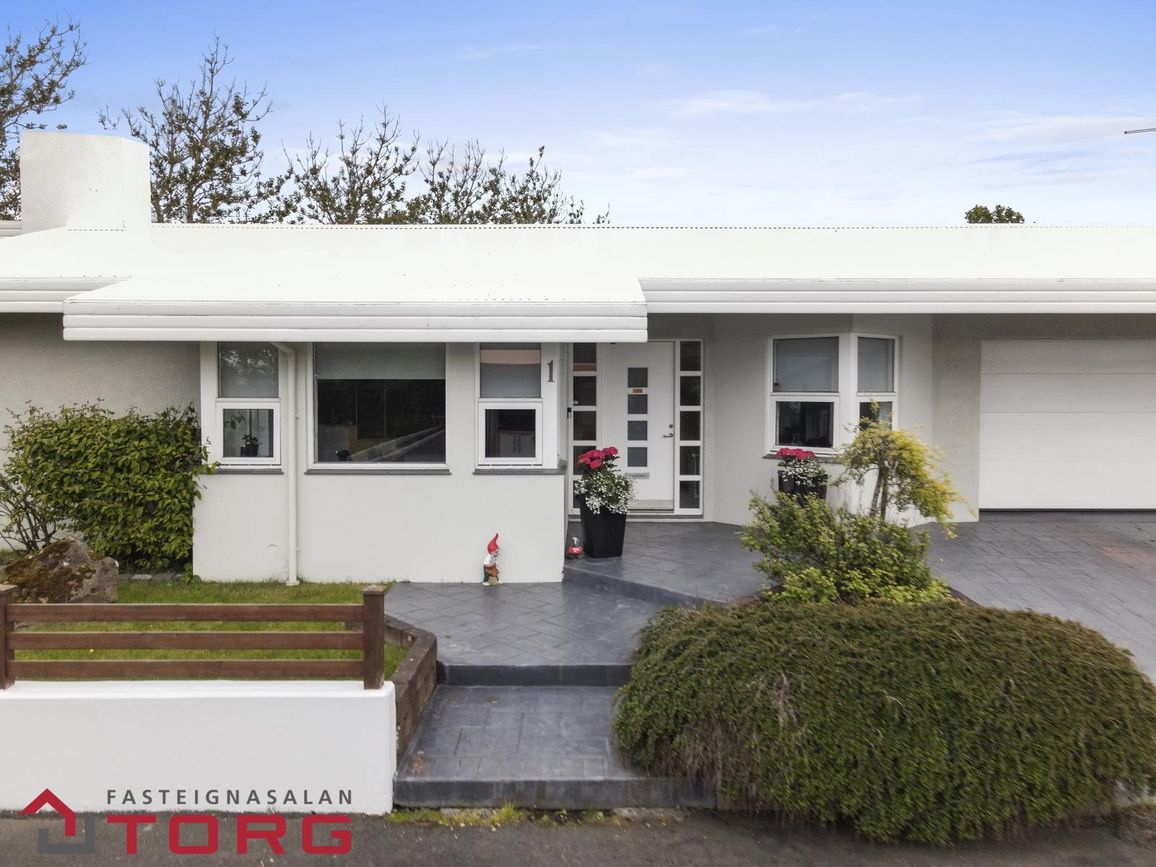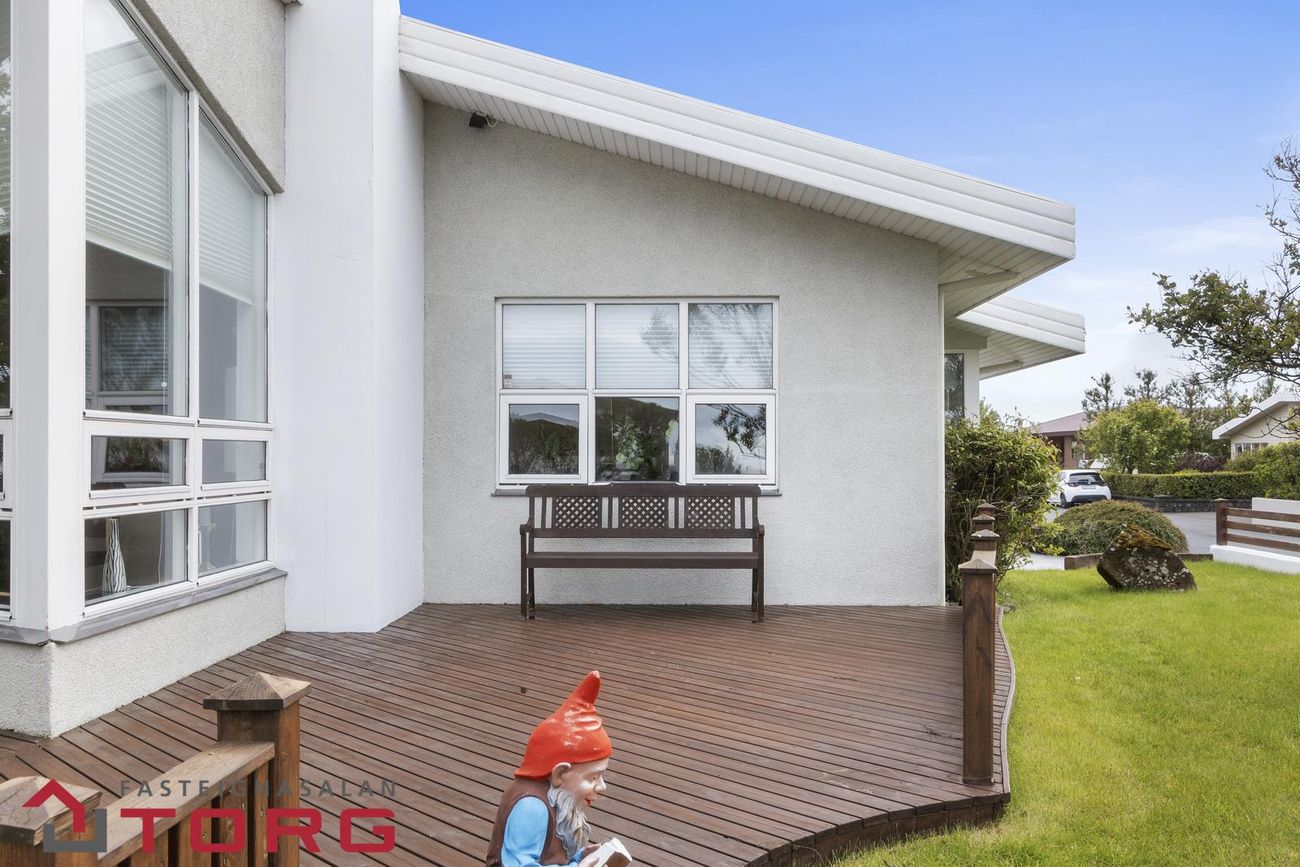 Húsið skiptist í forstofu, fimm svefnherbergi, tvö baðherbergi, eldhús, stofu, borðstofu, þvottahús og bílskúr. Eignin einkennist af fallegri hönnun, sérhönnuðum innréttingum og góðri lofthæð sem gefur rýmistilfinningu.