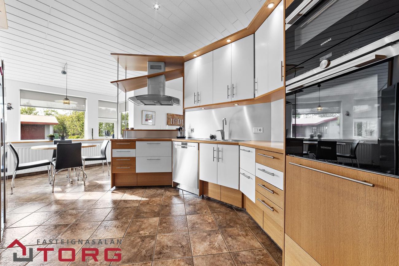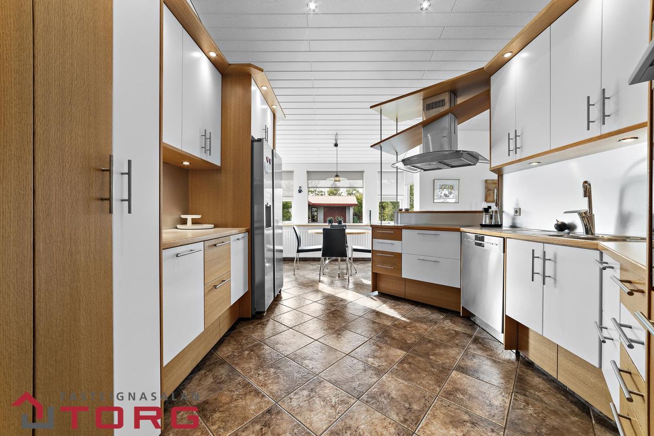 Eldhúsið er flísalagt og með vandaðri, sérsmíðaðri innréttingu með miklu skápaplássi ásamt góðum tækjum. Þar er einnig notalegur borðkrókur.