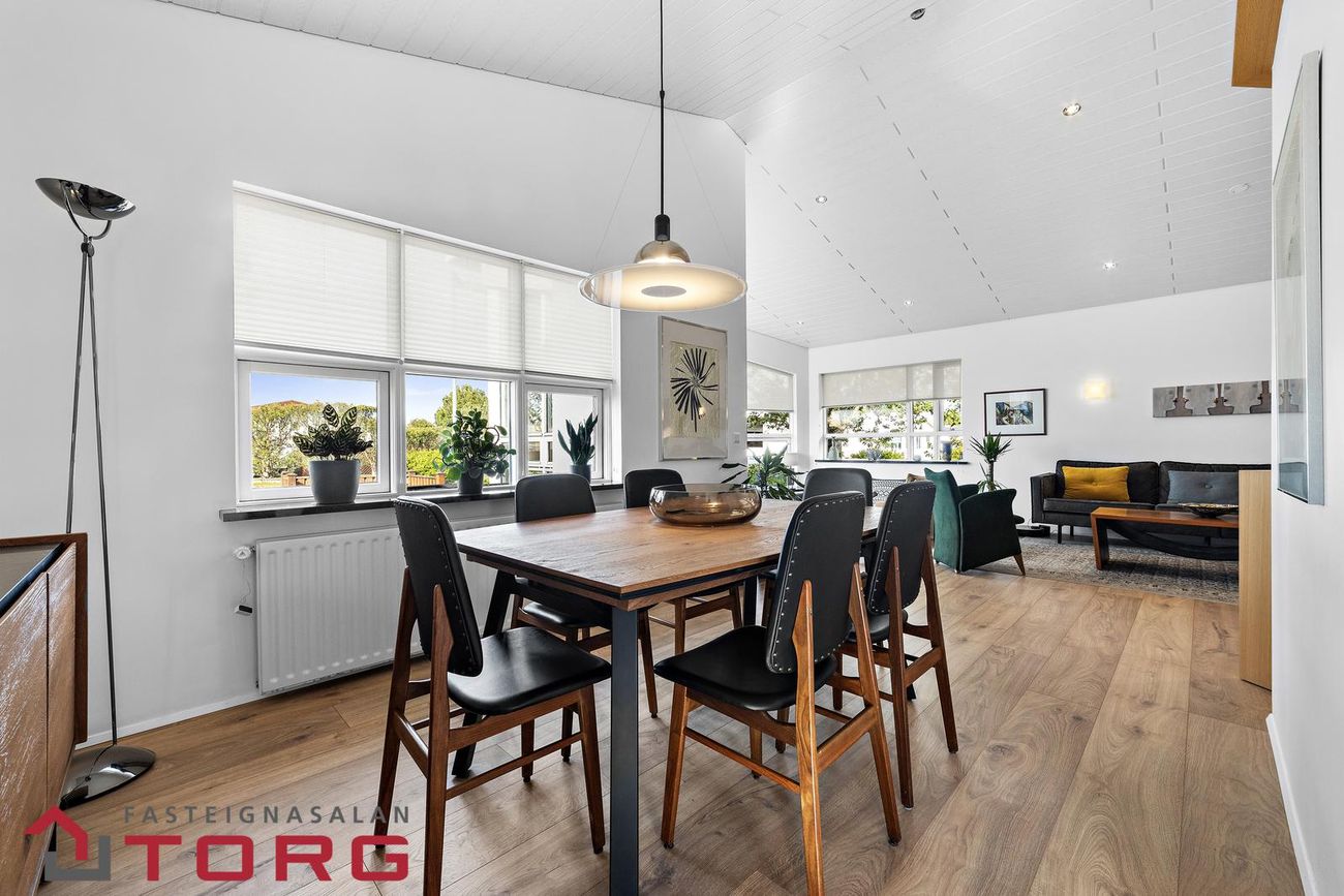 Borðstofa er í opnu rými og parketlögð, hentug fyrir stærri samverustundir.