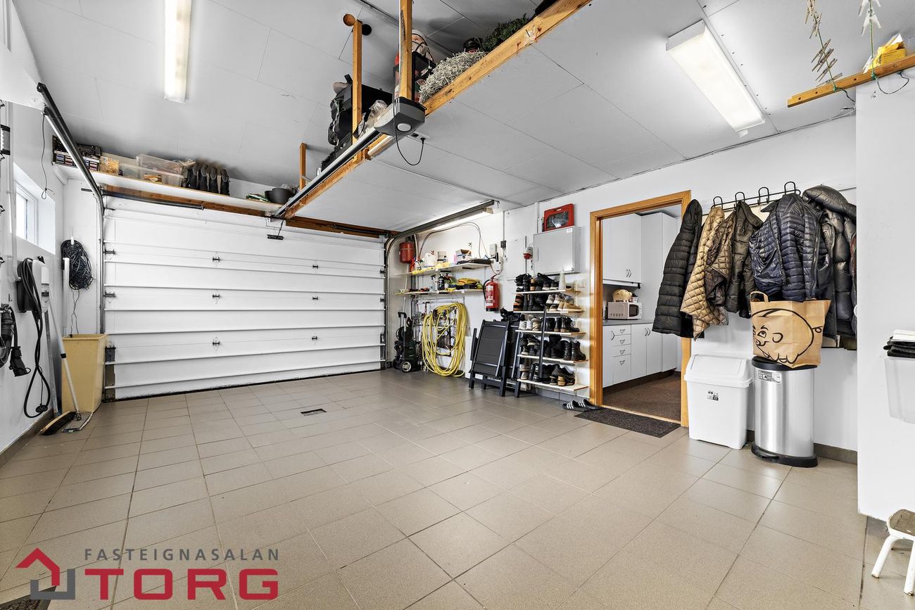 Bílskúrinn er flísalagður með rafdrifinni hurð og geymslulofti. Þar eru einnig gluggar og útgönguhurð út á bílaplan.