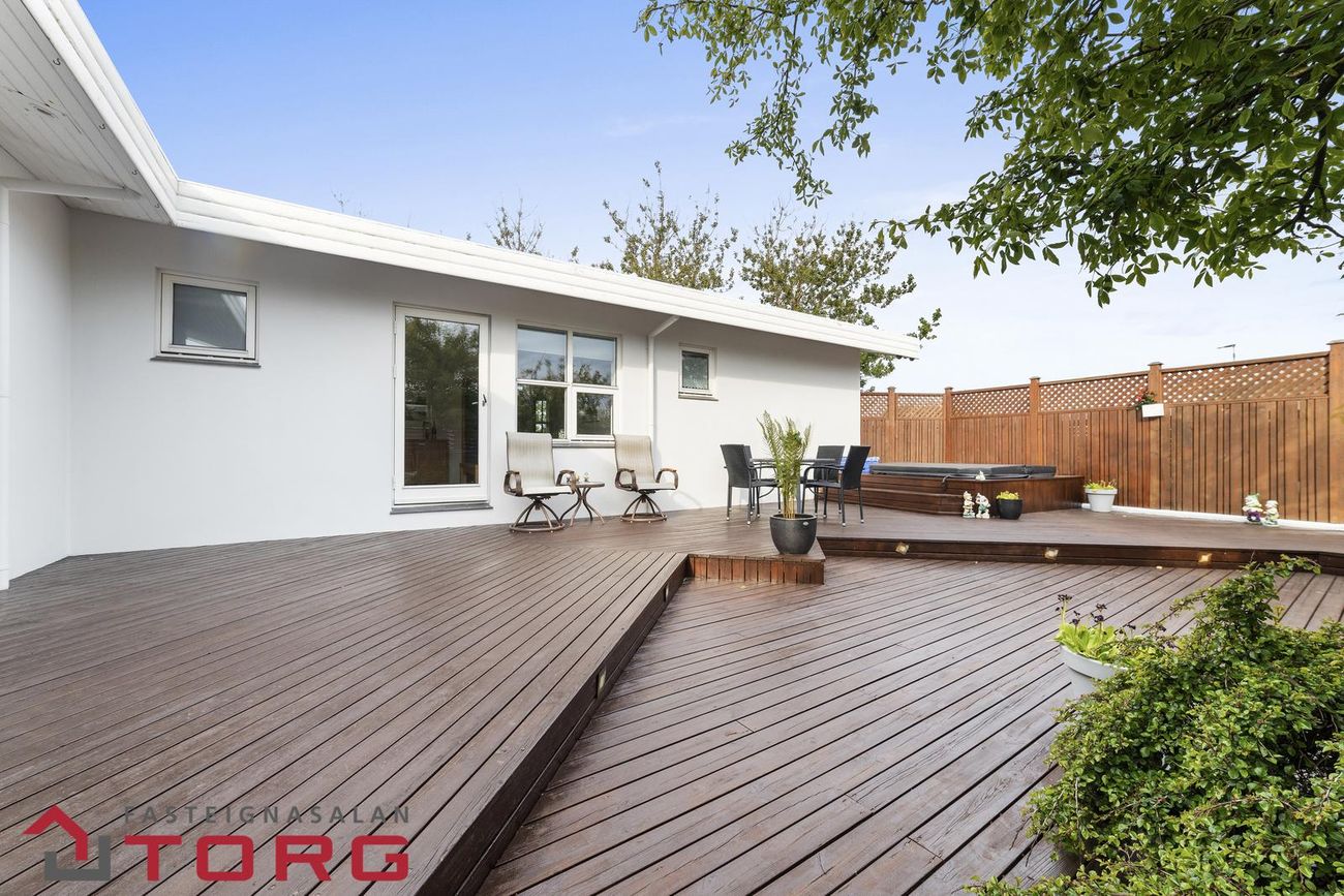 Að utan er stór og afgirt verönd með fallegum viðarpalli og heitum potti.
