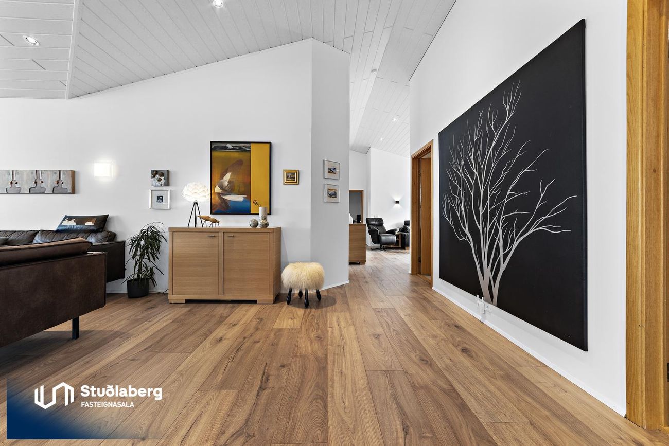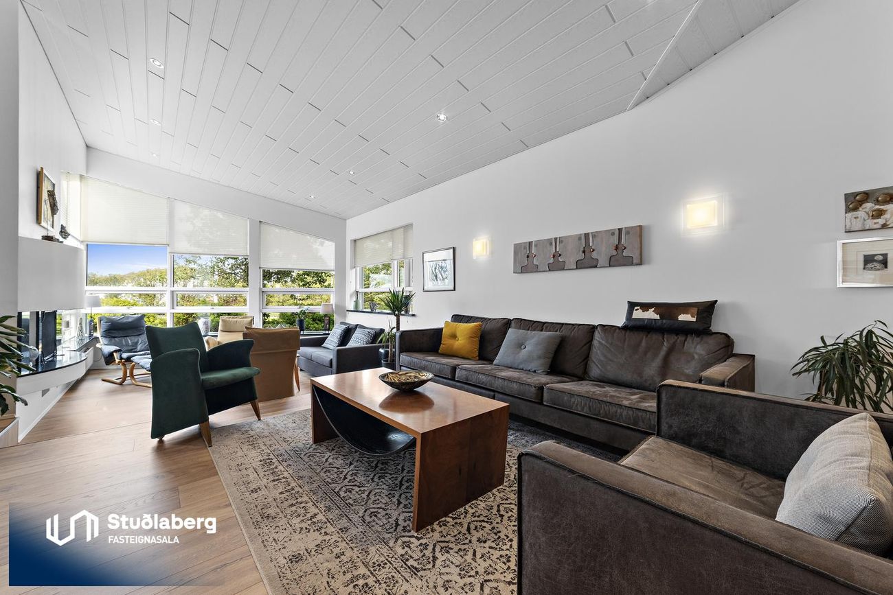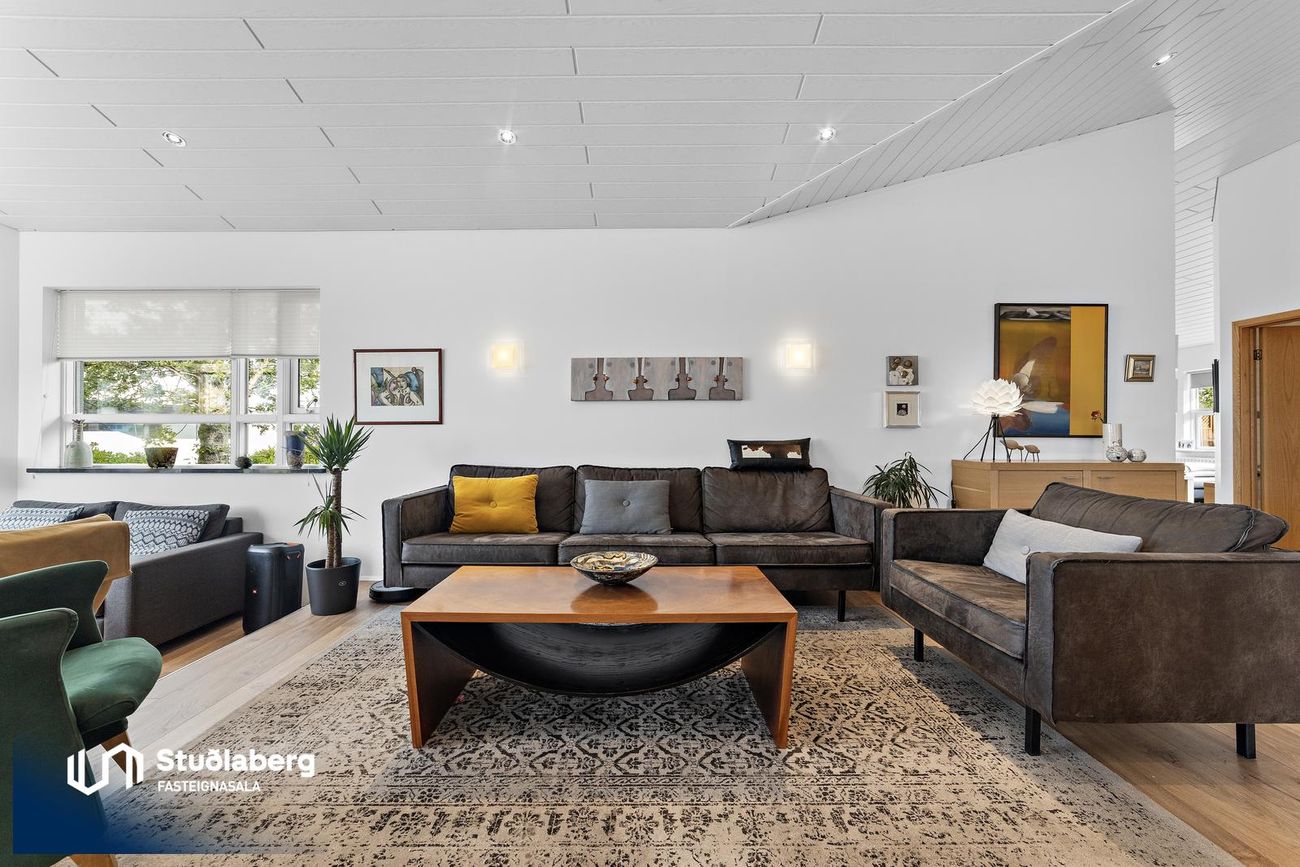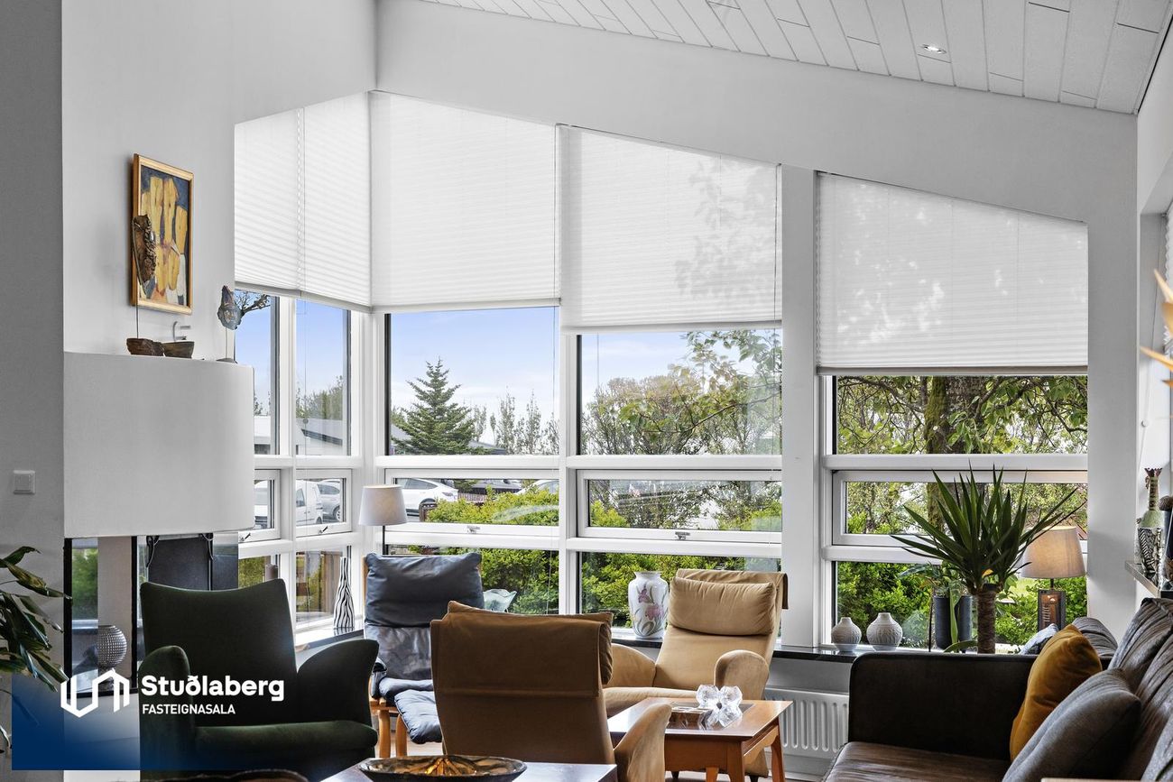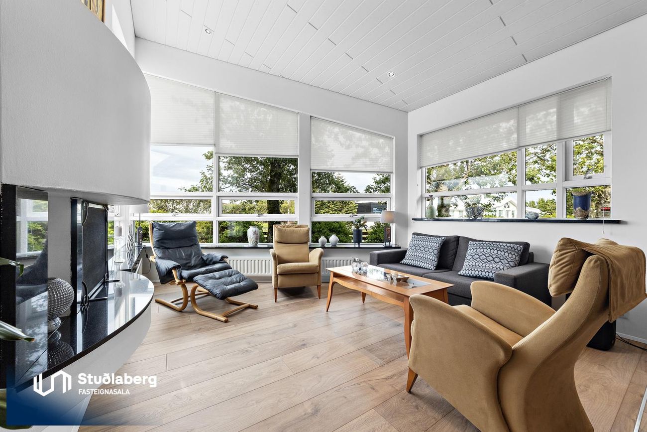 Stofa / Setustofa hefur parket á gólfi, mikil lofthæð og stórir gluggar sem gera hana bjarta og fallega, þar er stór arinn, stór sjónvarpsskáli með hurð út á verönd.