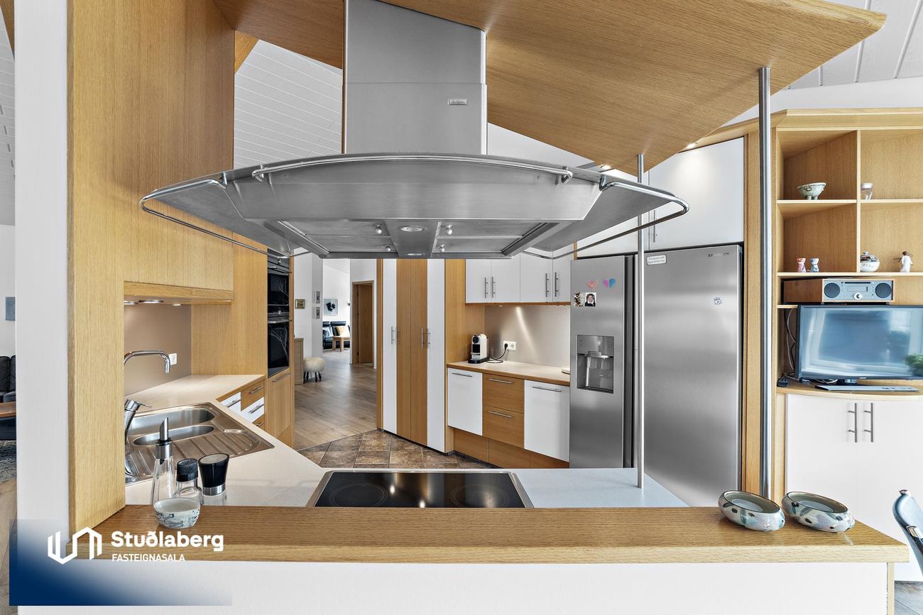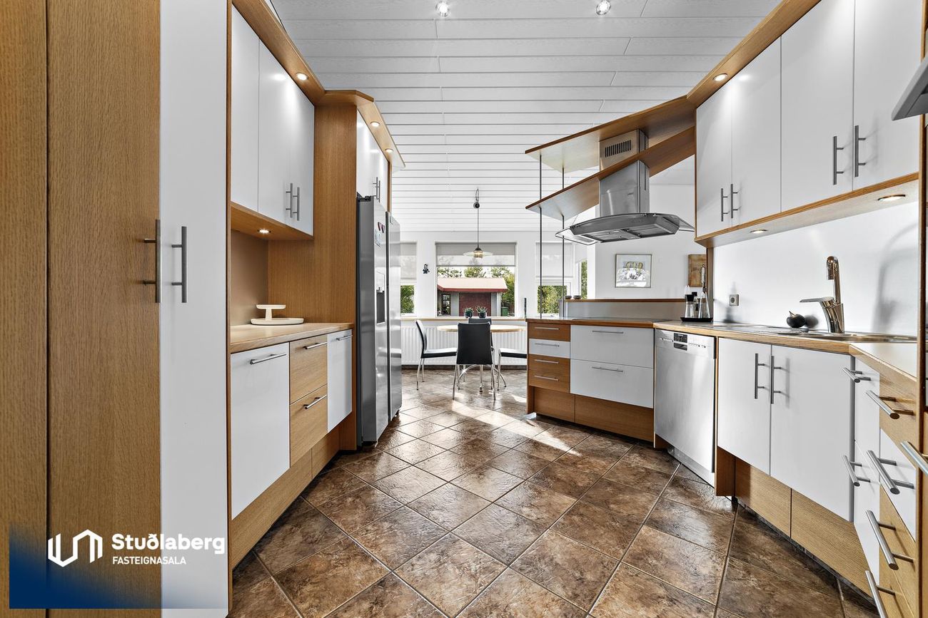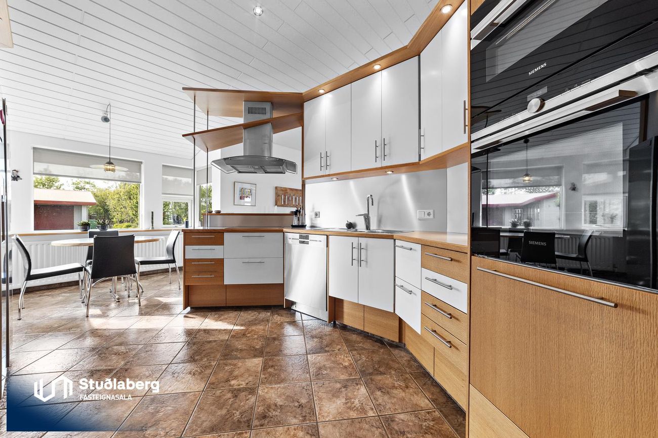 Eldhús hefur flísar á gólfi, vönduð sérsmíðuð innrétting með miklu skápaplássi og góð eldhústæki. Borðkrókur er í eldhúsinu.