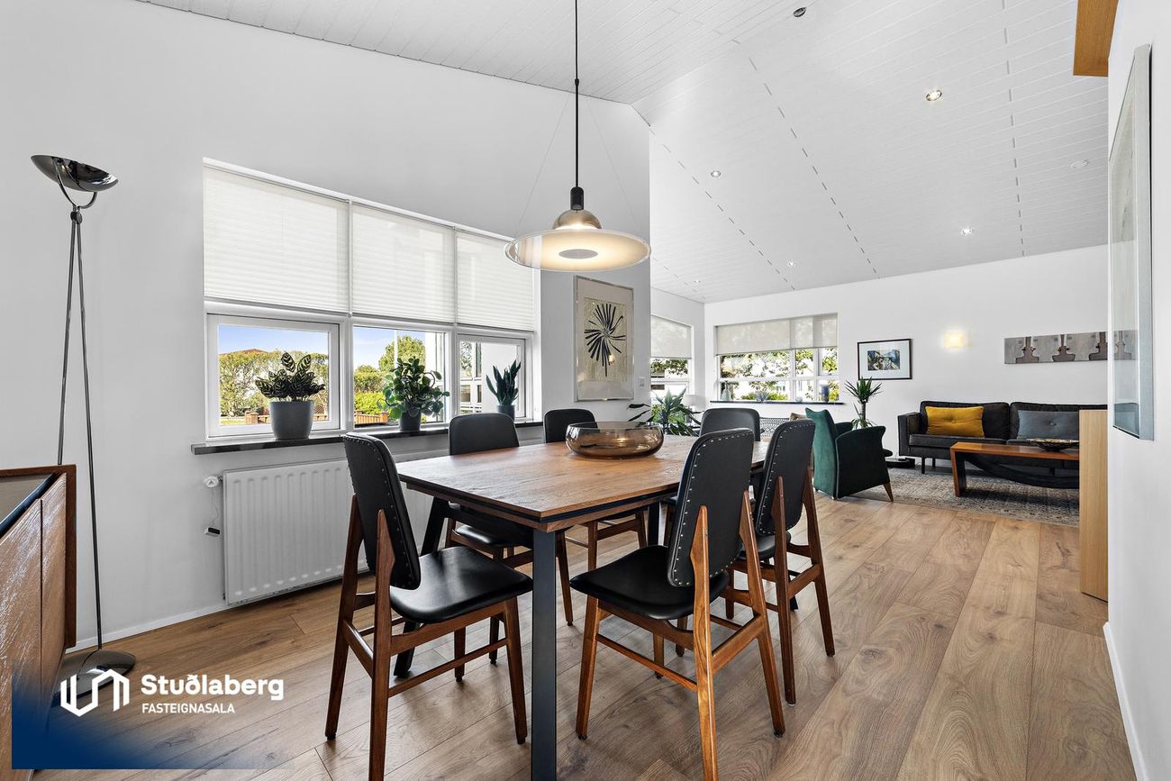 Borðstofa er rúmgóð með parket á gólfi.