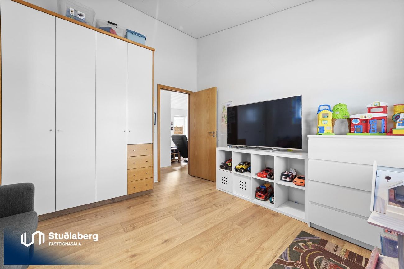 Svefnherbergin eru fimm talsins, öll parketlögð með fataskápum. Innaf hjónaherbergi er baðherbergi með flísum á gólfi, upphengt salerni, góð innrétting, sturta og handklæðaofn.