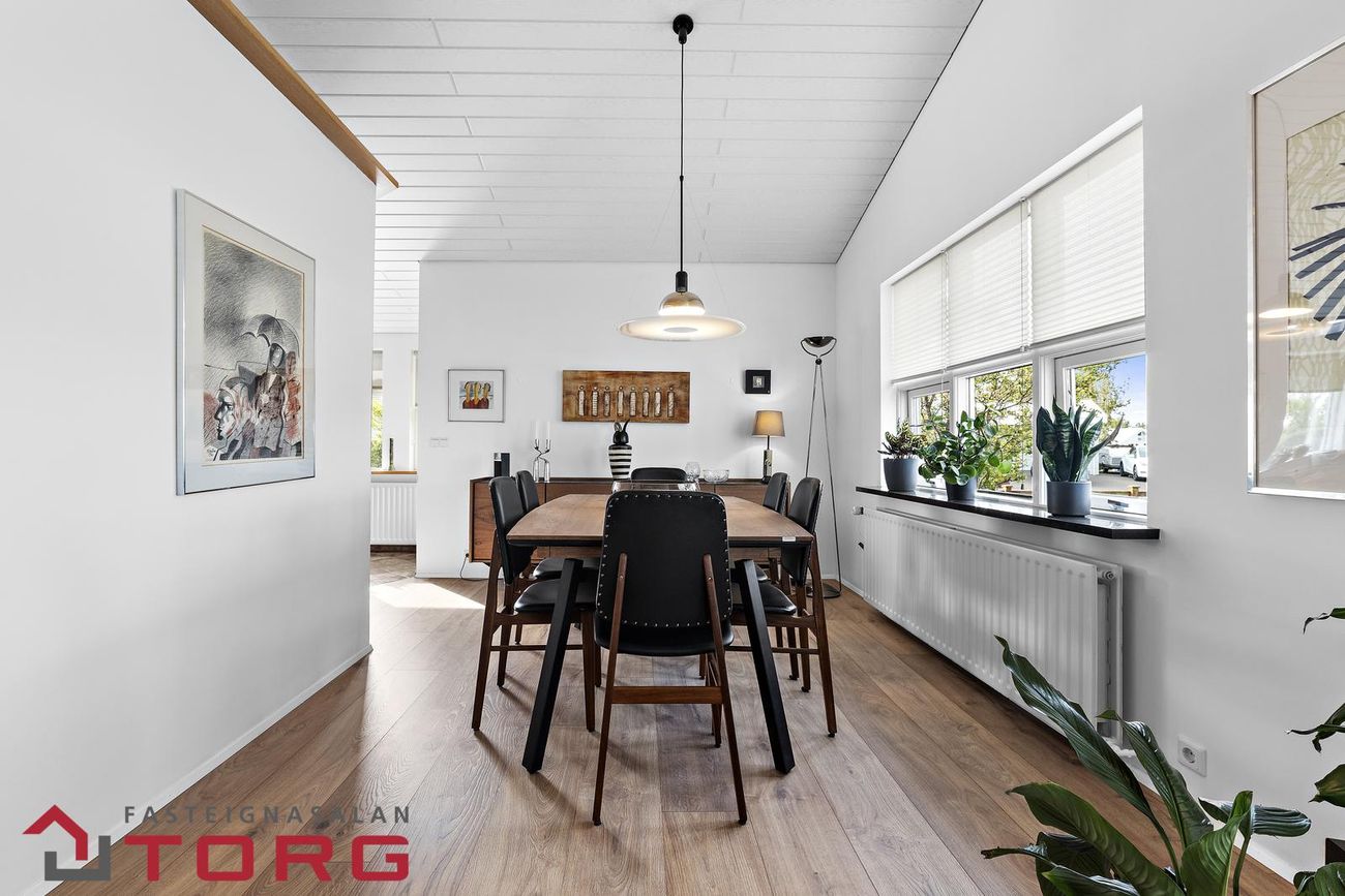 Borðstofa er í opnu rými og parketlögð, hentug fyrir stærri samverustundir.