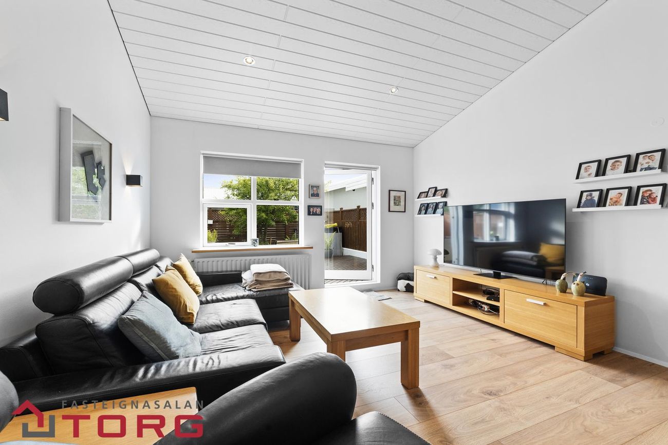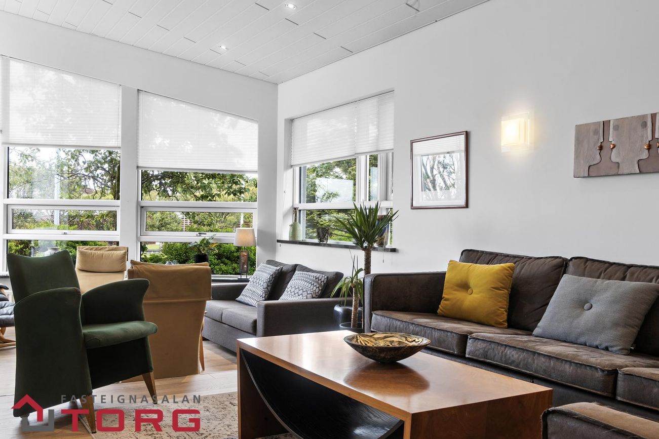Stofan er björt og rúmgóð með mikilli lofthæð og stórum gluggum sem hleypa inn góðri birtu. Þar er einnig arinn og sjónvarpsrými með útgengi út á verönd.