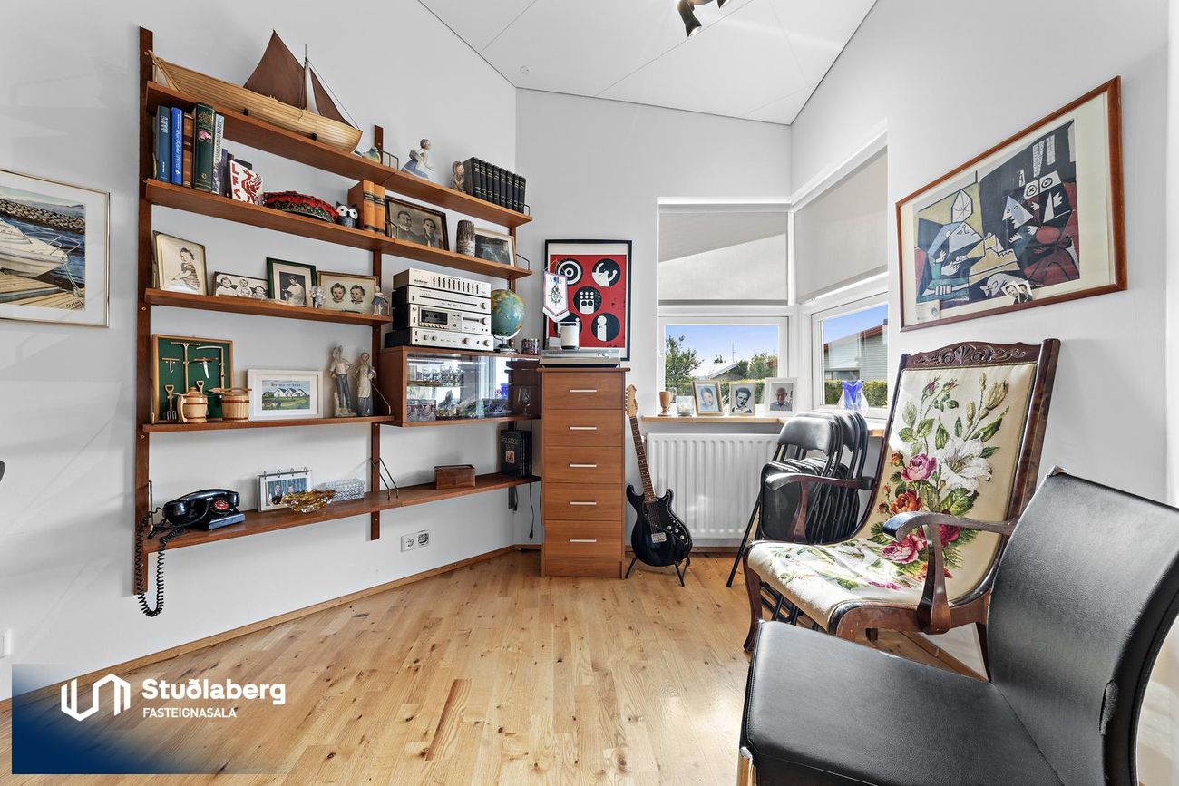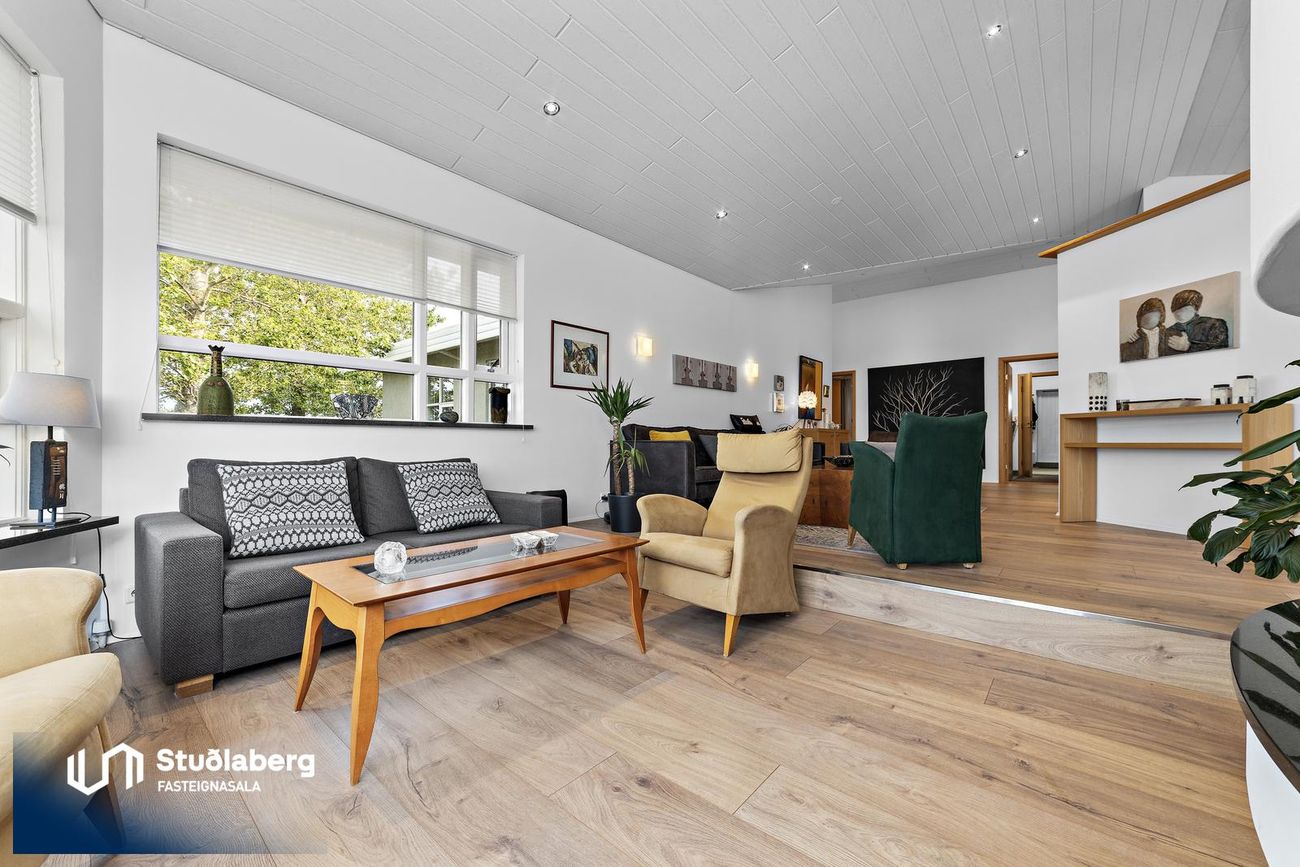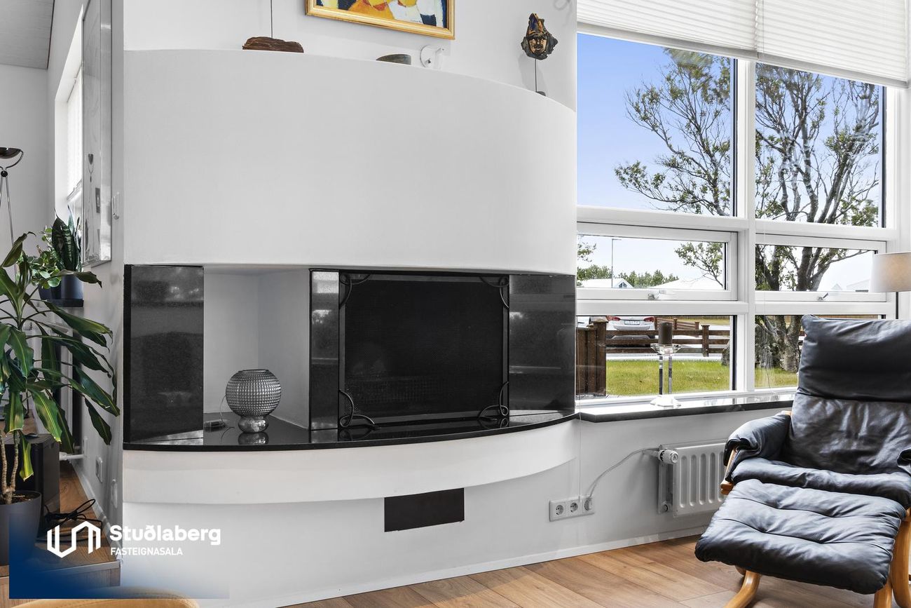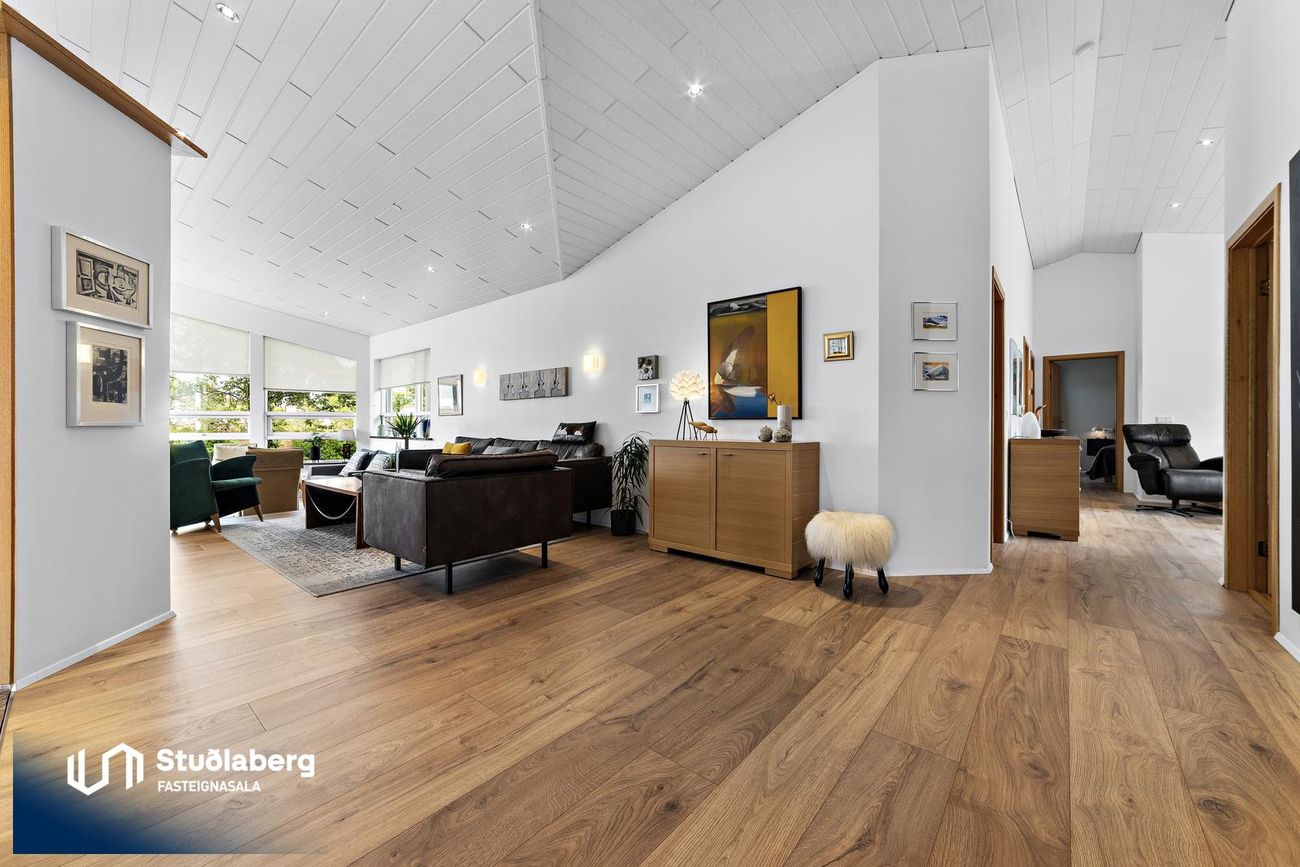 Stofa / Setustofa hefur parket á gólfi, mikil lofthæð og stórir gluggar sem gera hana bjarta og fallega, þar er stór arinn, stór sjónvarpsskáli með hurð út á verönd.