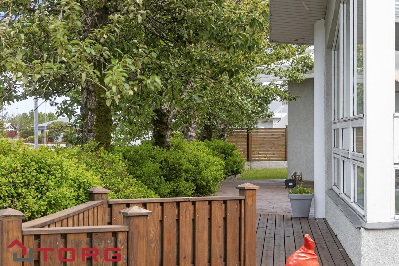 Húsið skiptist í forstofu, fimm svefnherbergi, tvö baðherbergi, eldhús, stofu, borðstofu, þvottahús og bílskúr. Eignin einkennist af fallegri hönnun, sérhönnuðum innréttingum og góðri lofthæð sem gefur rýmistilfinningu.