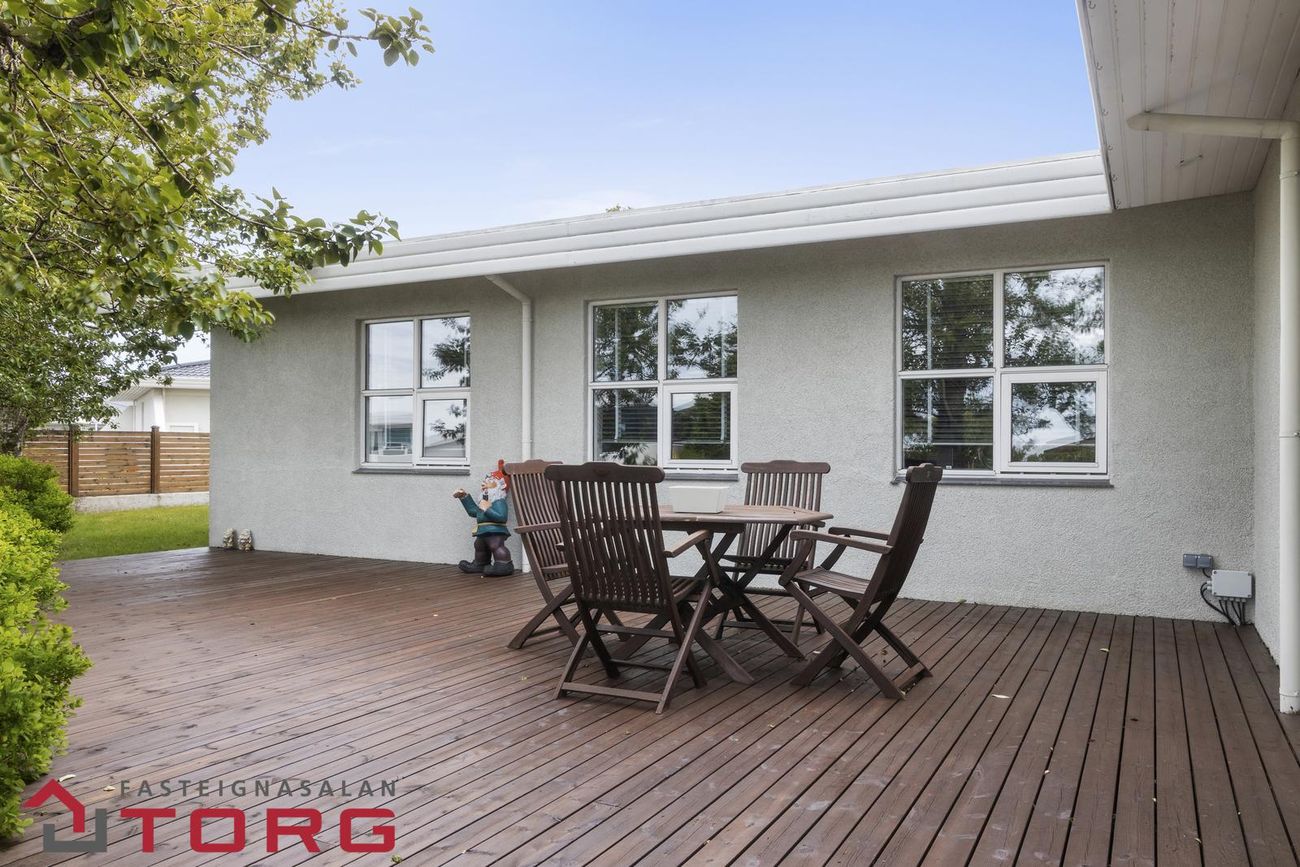 Bílskúrinn er flísalagður með rafdrifinni hurð og geymslulofti. Þar eru einnig gluggar og útgönguhurð út á bílaplan.