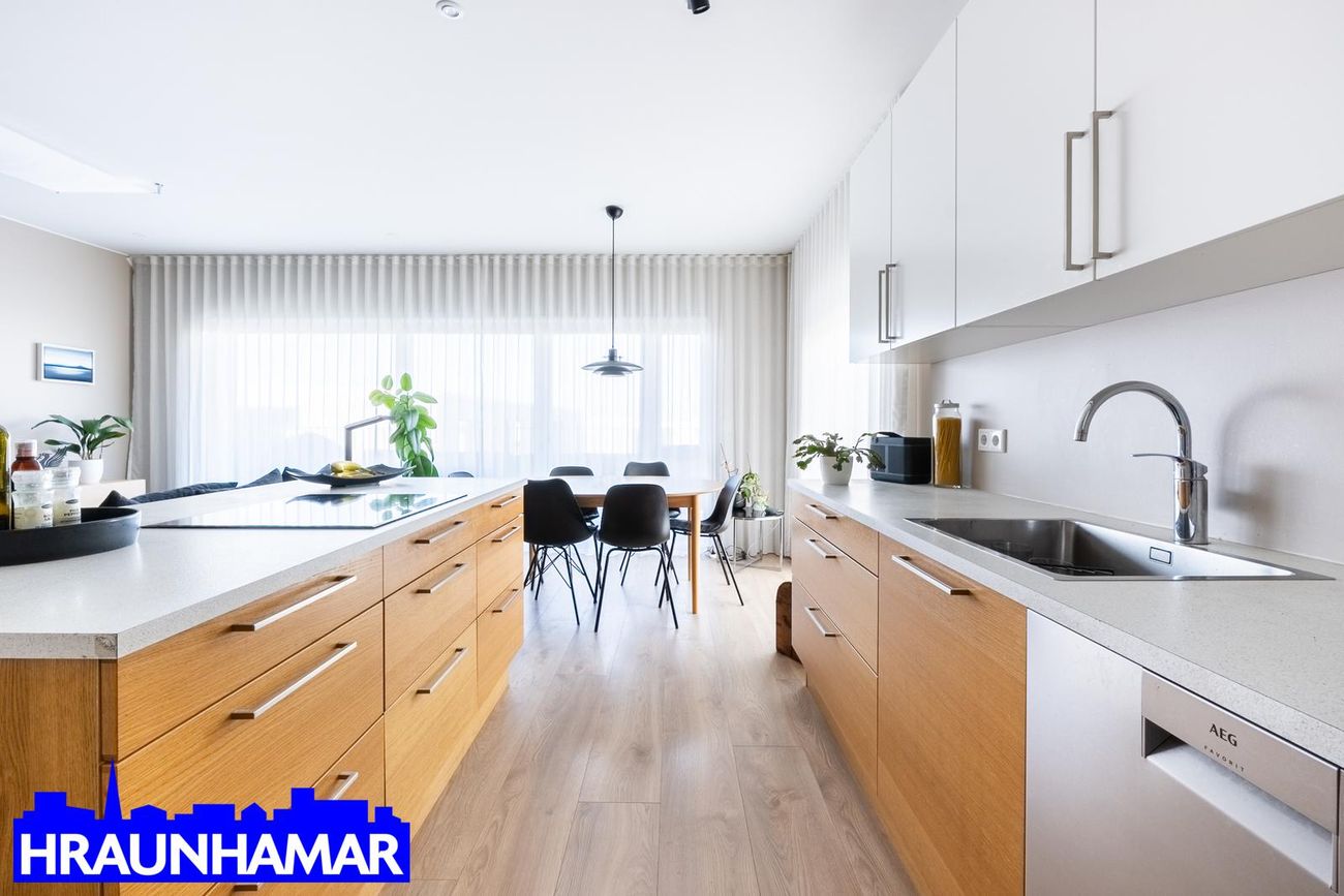 Eldhús með vandaðri innréttingu frá HTH, AEG tækjum og Duropaal borðplötu.