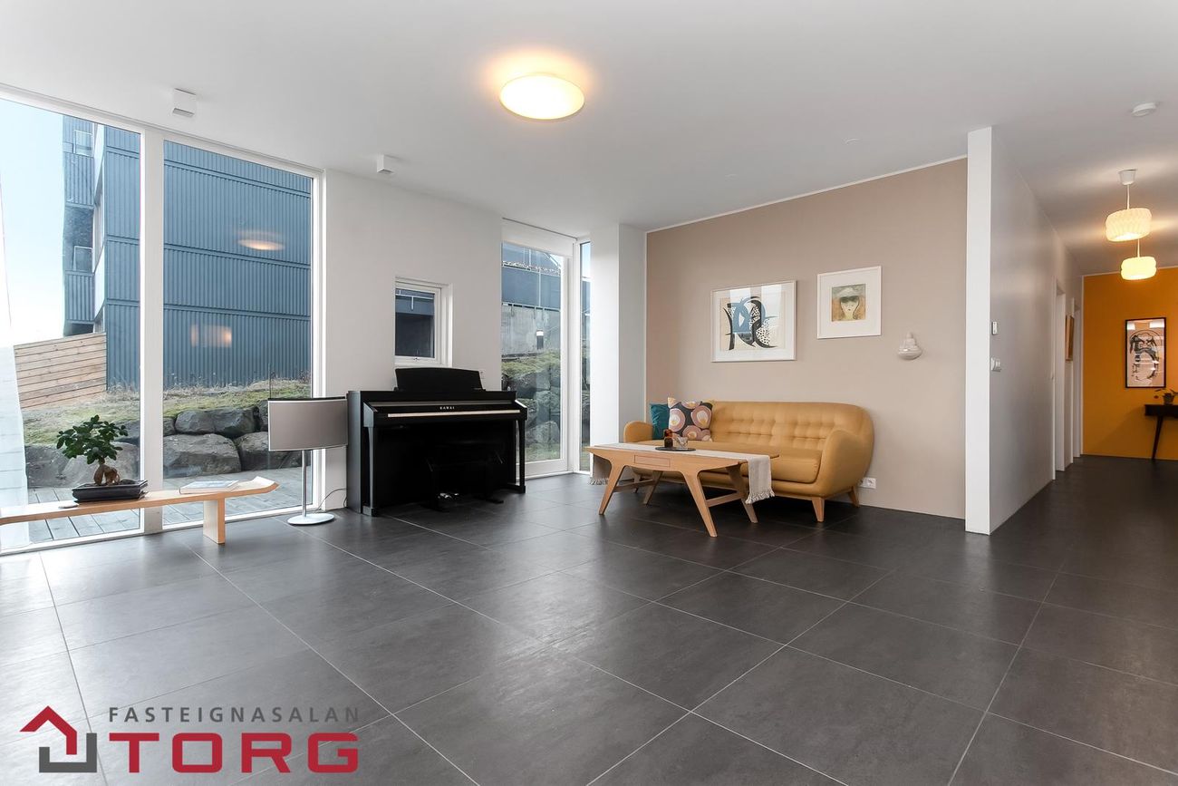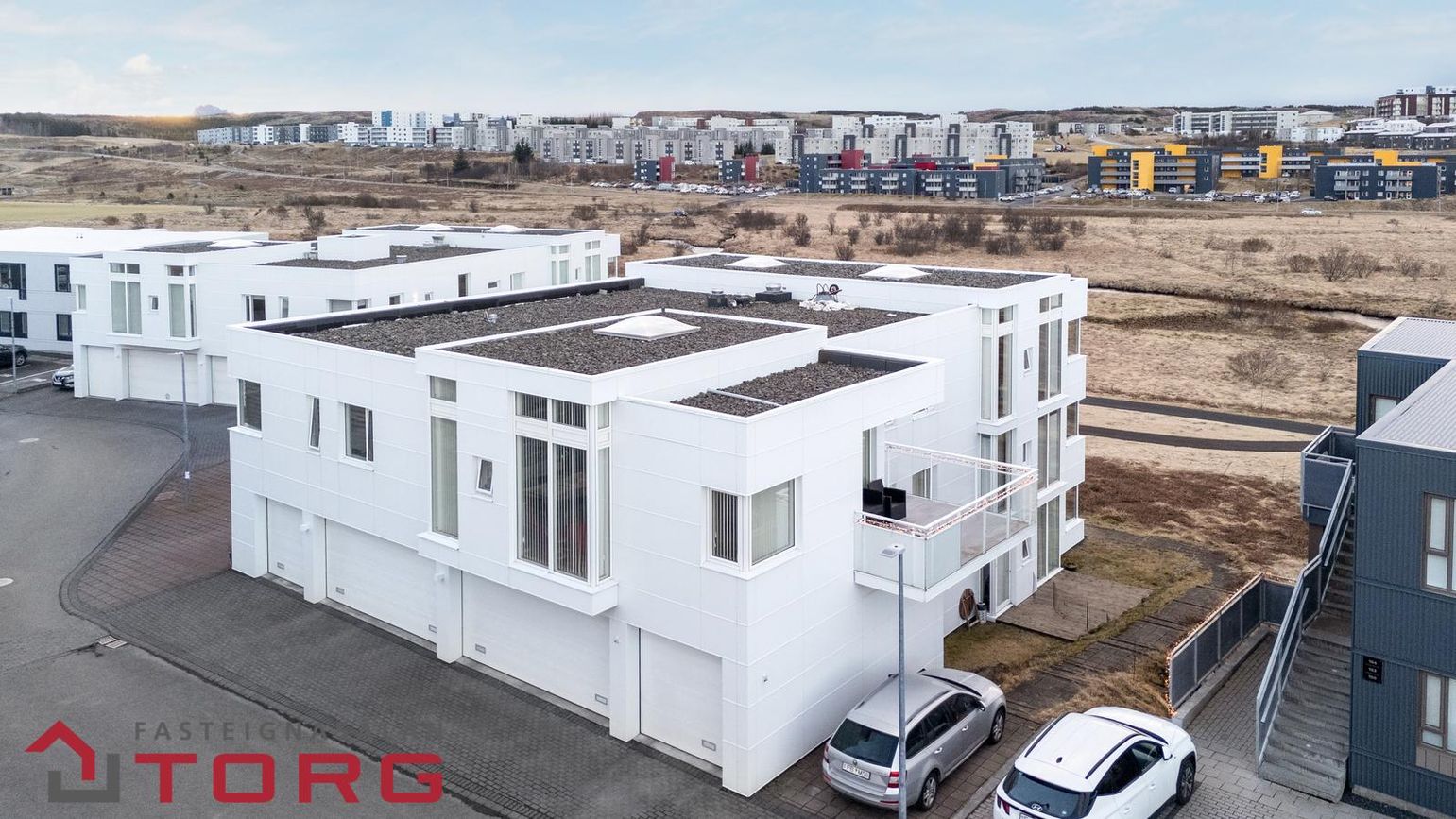 Íbúðinni fylgir rúmgott stæði í bílskýli með sér innkeyrslu . Íbúðin er skráð samkvæmt Þjóðskrá samtals 132,1 fm með sér geymslunni sem er skráð 11,6 fm með góðum glugga. Á gólfum eru fallegar flísar sem gefa rýmunum vandað og hlýlegt yfirbragð. Fallegar og vandaðar innréttingar prýða eldhús og baðherbergi og skapa nútímalegt og stílhreint heildarútlit.