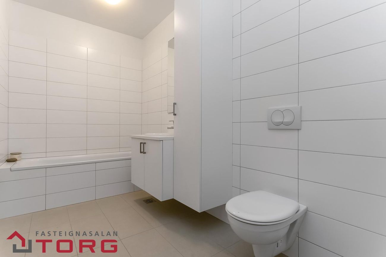 Baðherbergi: Rúmgott og flísalagt. Hvít vaskinnrétting, upphengt salerni, sturta og baðkar.