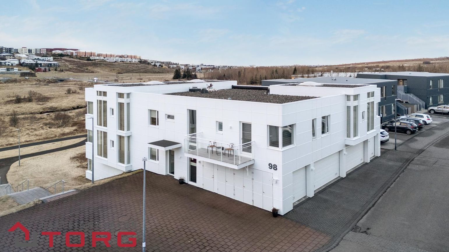 Sér merkt stæði í lokuðu bílskýli með hita og rafhleðslu.