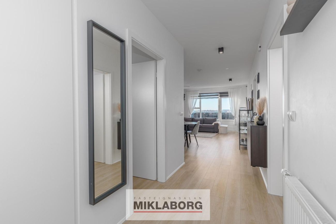 Harðparketi í herbergjum, flísaleg gólf í forstofu, flísaleg hólf og gólf í baðherbergi, hvít háglans innrétting í eldhúsi með Silestone borðplötum.