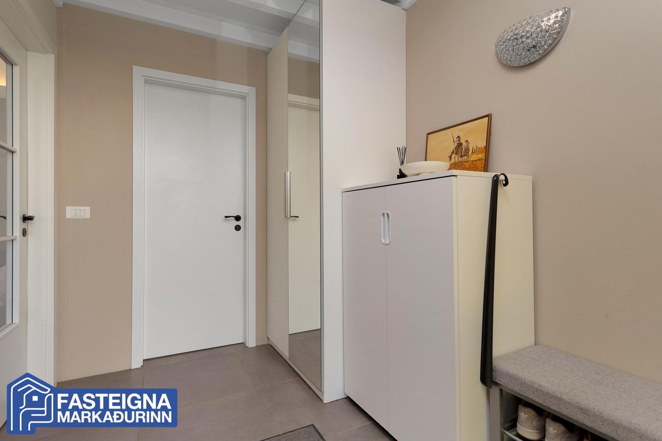 Stórt geymsluloft í þvottaherbergi og fataskápar í gangi.