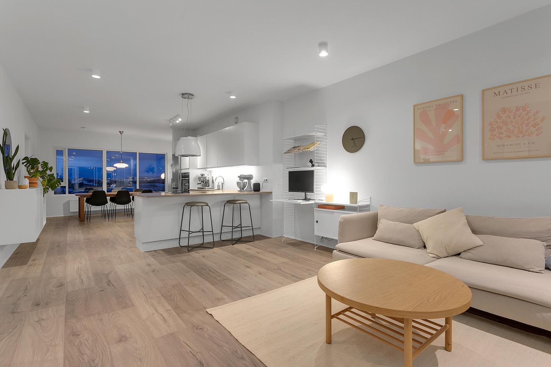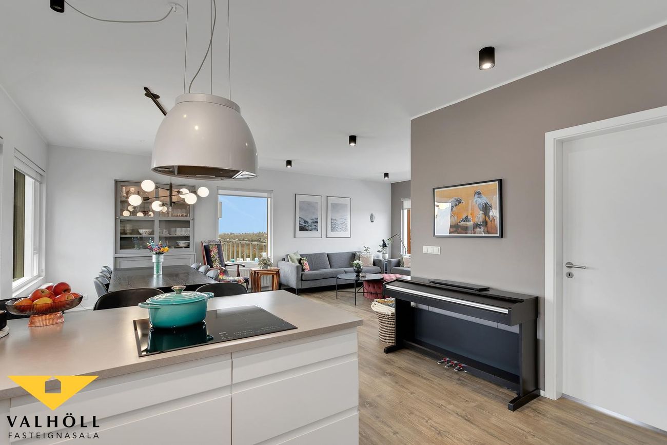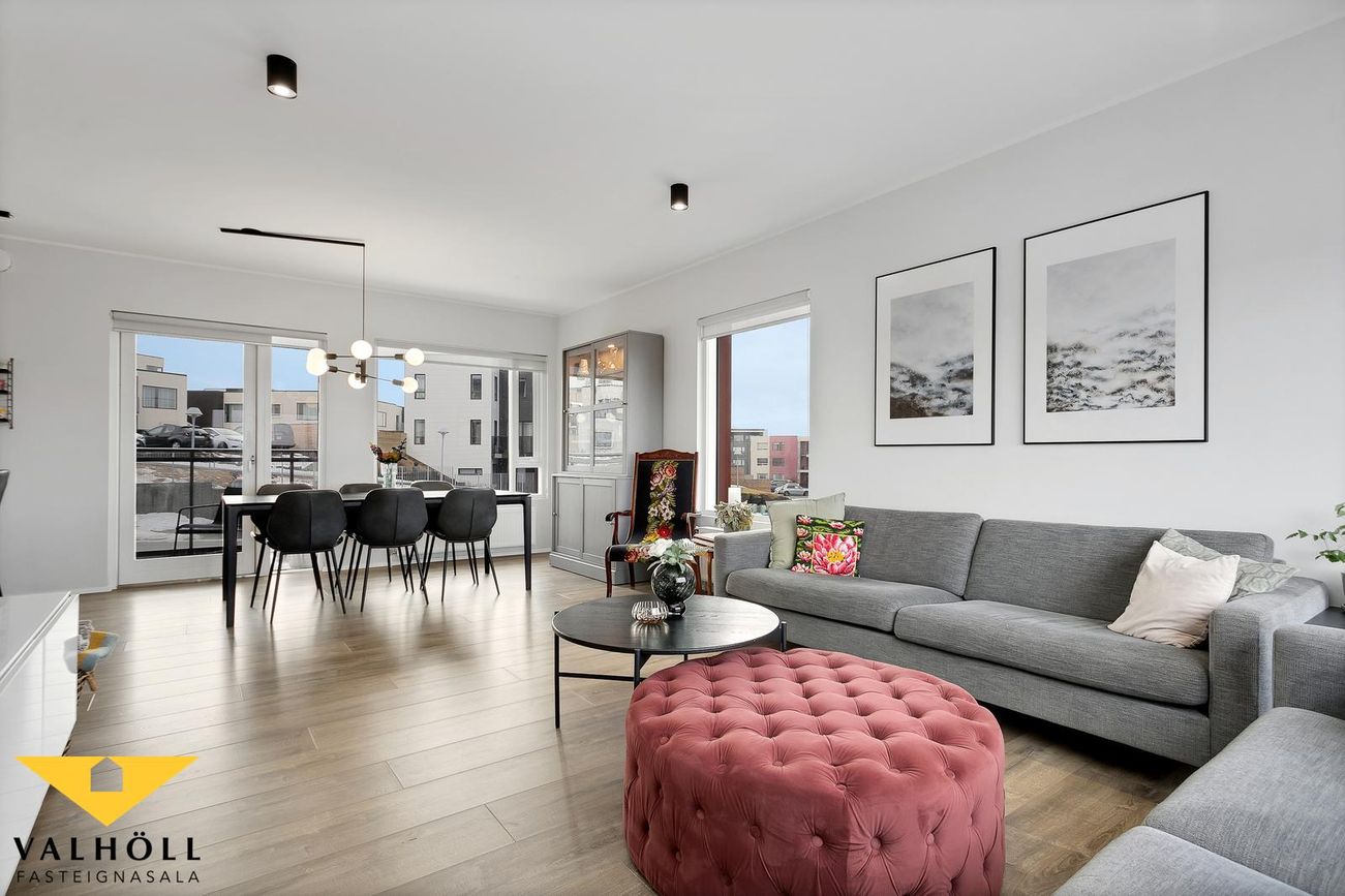 Stofa er opin og björt og útgegnt út suðursvalir.