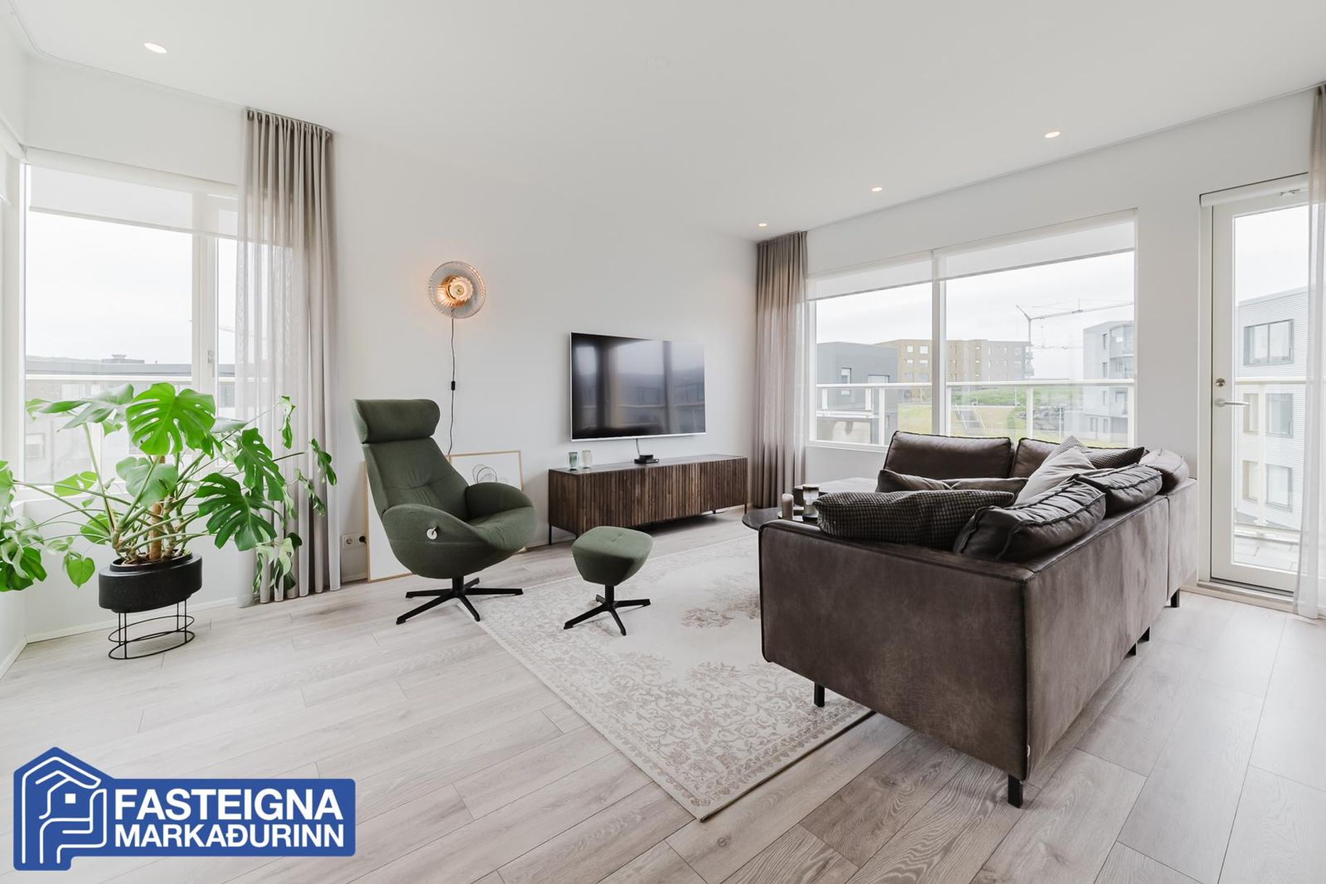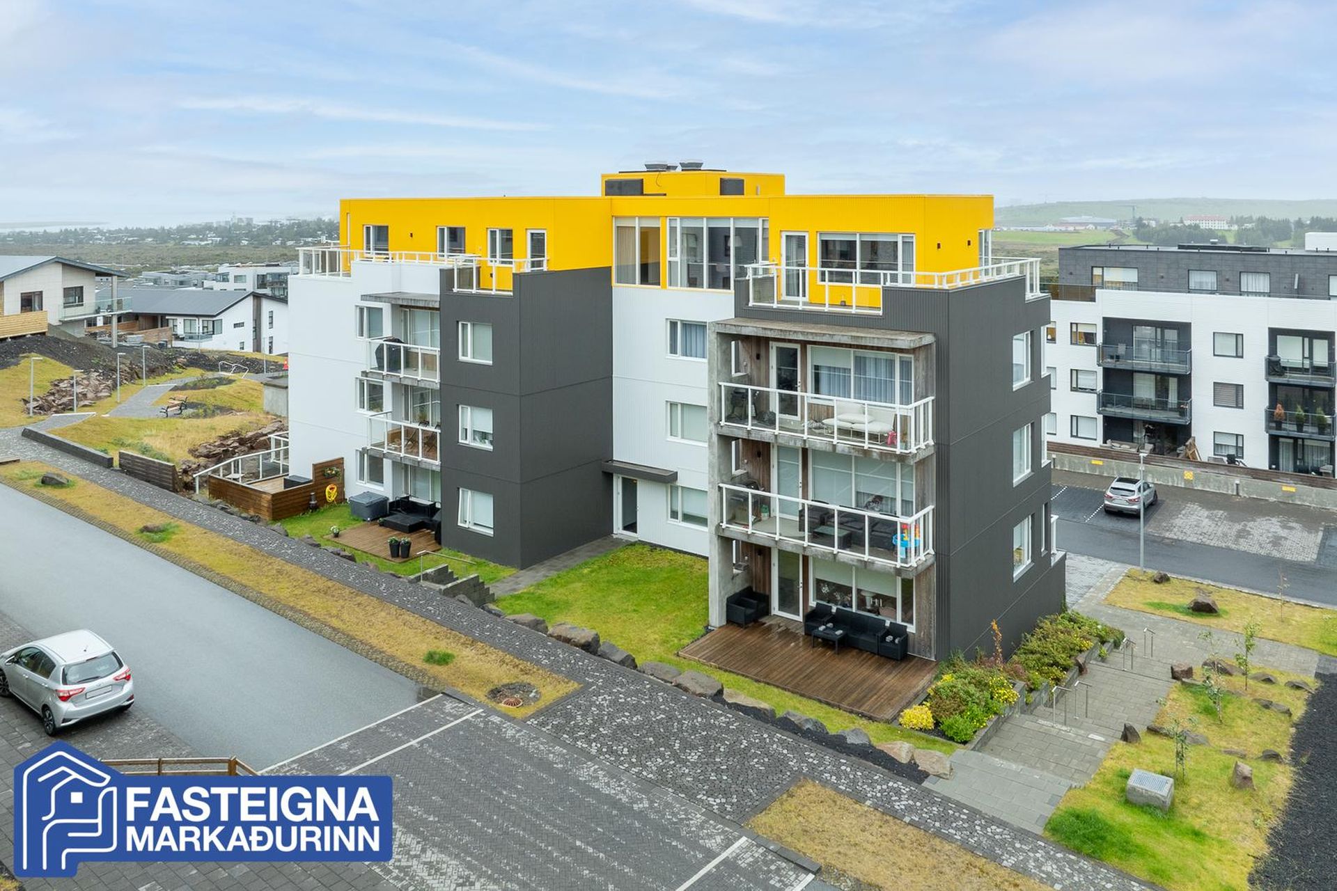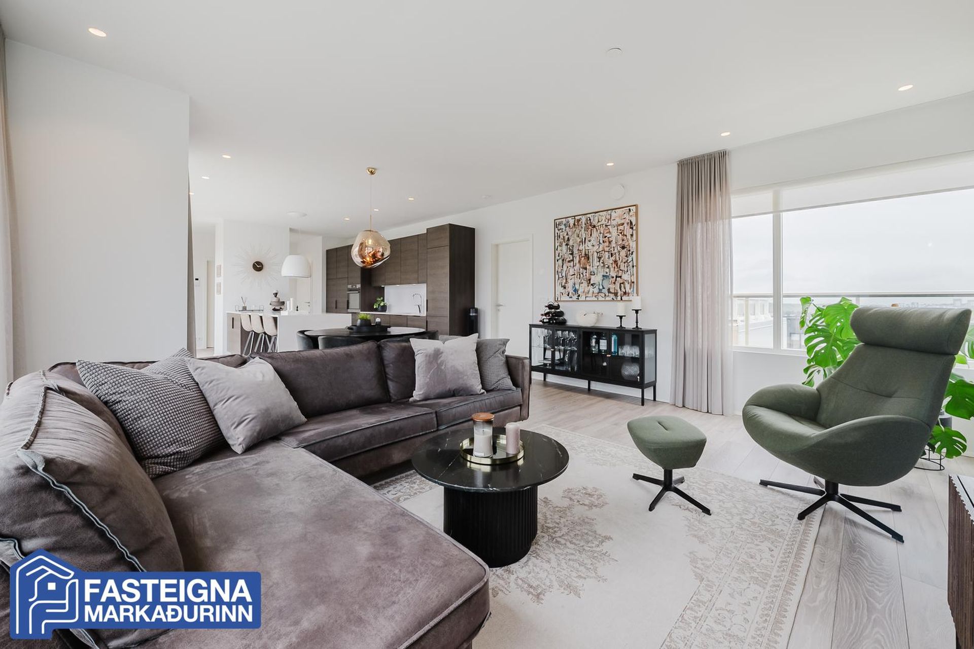 Fasteignamarkaðurinn ehf. s: 570-4500 kynnir til sölu vandaða og glæsilega 118,8 fermetra 3ja herbergja íbúð á efstu hæð með gluggum í þrjár áttir, stórkostlegu útsýni, tveimur baðherbergjum, suðursvölum og mjög stórum þaksvölum í þrjár áttir auk sér bílastæðis í bílakjallara þar sem lagt hefur verið fyrir rafhleðslustöð. Aðeins tvær íbúðir eru á hæðinni. Verulega aukin lofthæð er í eigninni, vandaðar innréttingar með kvartsteini á borðum, tvö baðherbergi, stórt barnaherbergi, stórt hjónaherbergi með baðherbergi innaf, innfelld lýsing í loftum, gólfsíðir gluggar að hluta, gólfhitalagnir og mjög falleg eldhúsinnrétting og eyja með miklu skápaplássi. Lýsing eignar:Forstofa, parketlögð og með fataskápum.Baðherbergi I, mjög rúmgott, flísalagt gólf og veggir, innrétting, speglaskápar með lýsingu í, vegghengt wc, handklæðaofn, flísalögð sturta með sturtugleri og innrétting með stæðum fyrir þvottavél og þurrkara.Barnaherbergi, mjög stórt, parketlagt og með fataskápum. Úr barnaherbergi er útgengi á svalir til suðurs þaðan sem nýtur mjög fallegs útsýnis að Snæfellsjökli, yfir Álftanes, að Seltjarnarnesi og víðar.Eldhús, opið við stofu og hol, parketlagt og mjög bjart með gólfsíðum gluggum til suðurs. Mjög fallegar dökkbæsaðar eikarinnréttingar með kvartsteini á borði, miklu skápaplássi, innbyggðri uppþvottavél og innbyggðum ísskáp með frysti. Stór eyja með kvartsteini á borði, góðu skápaplássi, áfastri borðaðstöðu, spanhelluborði og hangandi háfi yfir.Stofa, parketlögð, björt og rúmgóð með gluggum í þrjár áttir. Úr stofu er útgengi á þaksvalir til suðurs, austurs og norðurs með stórkostlegu útsýni yfir borgina, að Esju, Akrafjalli, Snæfellsjökli, yfir borgina, upp í Heiðmörk og víðar.Hjónaherbergi, stórt, parketlagt og með fataskápum á heilum vegg. Frá hjónaherbergi er frábært útsýni til norðurs.Baðherbergi II, innaf hjónaherbergi er með glugga, flísalagt gólf og veggir, innrétting, speglaskápar með lýsingu í, vegghengt wc. handklæðaofn og flísalögð sturta með sturtugleri.Á jarðhæð hússins eru:Sér bílastæði í lokaðri og upphitaðri bílageymslu þar sem búið er að setja upp tengi fyrir rafhleðslustöð.Sérgeymsla, sem er 6,8 fermetrar að stærð.Sameiginleg hjólageymsla.Sameign hússins er öll mjög snyrtileg og vel umgengin.Húsið að utan er klætt með áli og lítur mjög vel út.Lóðin er fullfrágengin með tyrfðum flötum, lágum gróðri og góðri aðkomu með fjölda bílastæða við húsið.Hússjóður pr mánuð er 26.000 kr og er allt innifalið í þeirri fjárhæð, þ.e. þrif á sameign og sorpgeymslu, allur rekstur á sameign, húseigendatrygging og rekstur bílskýlis. Engar framkvæmdir eru fyrirhugaðar við eignina.Staðsetning eignarinnar er mjög góð á eftirsóttum stað í Urriðaholtinu í Garðabæ þaðan sem stutt er í leikskóla, barnaskóla, verslanir, þjónustu, Golklúbbinn Odd og falleg útivistarsvæði og gönguleiðir í Heiðmörk.Allar nánari upplýsingar veittar á skrifstofu Fasteignamarkaðarins ehf. í síma 570-4500 eða á netfanginu