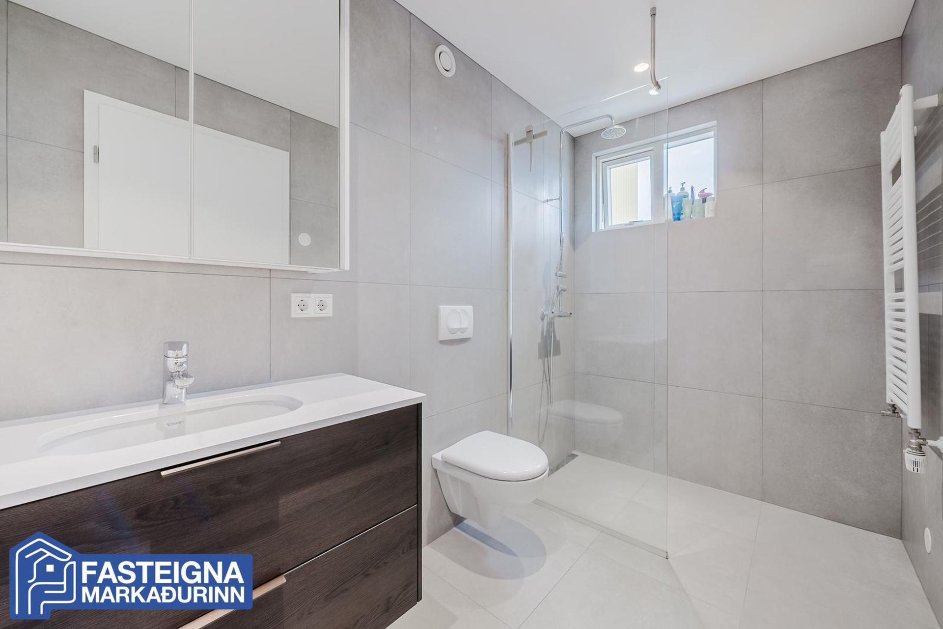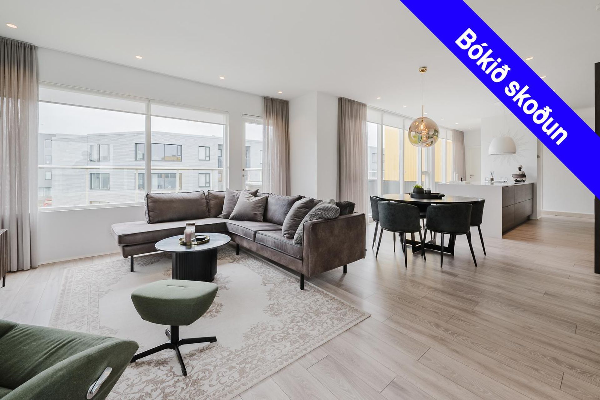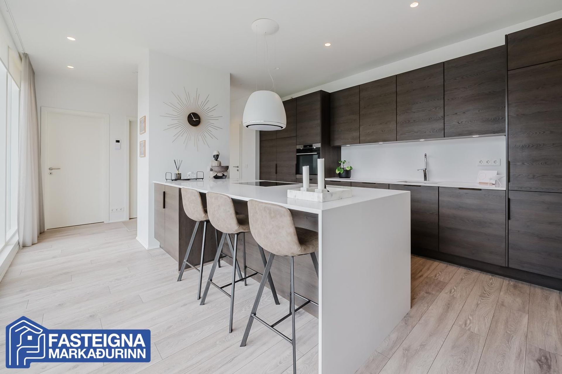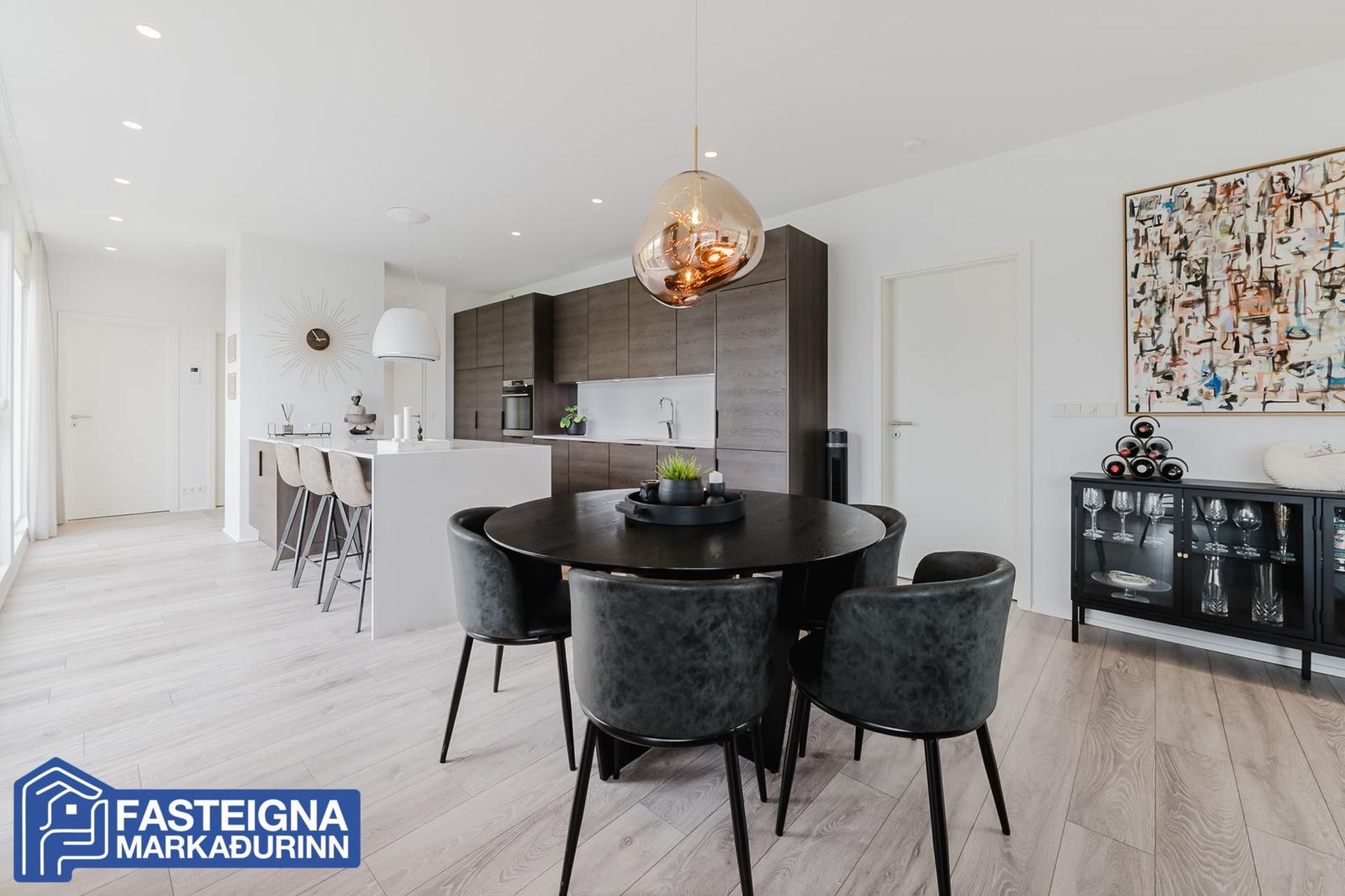 Fasteignamarkaðurinn ehf. s: 570-4500 kynnir til sölu vandaða og glæsilega 118,8 fermetra 3ja herbergja íbúð á efstu hæð með gluggum í þrjár áttir, stórkostlegu útsýni, tveimur baðherbergjum, suðursvölum og mjög stórum þaksvölum í þrjár áttir auk sér bílastæðis í bílakjallara þar sem lagt hefur verið fyrir rafhleðslustöð. Aðeins tvær íbúðir eru á hæðinni. Verulega aukin lofthæð er í eigninni, vandaðar innréttingar með kvartsteini á borðum, tvö baðherbergi, stórt barnaherbergi, stórt hjónaherbergi með baðherbergi innaf, innfelld lýsing í loftum, gólfsíðir gluggar að hluta, gólfhitalagnir og mjög falleg eldhúsinnrétting og eyja með miklu skápaplássi. Lýsing eignar:Forstofa, parketlögð og með fataskápum.Baðherbergi I, mjög rúmgott, flísalagt gólf og veggir, innrétting, speglaskápar með lýsingu í, vegghengt wc, handklæðaofn, flísalögð sturta með sturtugleri og innrétting með stæðum fyrir þvottavél og þurrkara.Barnaherbergi, mjög stórt, parketlagt og með fataskápum. Úr barnaherbergi er útgengi á svalir til suðurs þaðan sem nýtur mjög fallegs útsýnis að Snæfellsjökli, yfir Álftanes, að Seltjarnarnesi og víðar.Eldhús, opið við stofu og hol, parketlagt og mjög bjart með gólfsíðum gluggum til suðurs. Mjög fallegar dökkbæsaðar eikarinnréttingar með kvartsteini á borði, miklu skápaplássi, innbyggðri uppþvottavél og innbyggðum ísskáp með frysti. Stór eyja með kvartsteini á borði, góðu skápaplássi, áfastri borðaðstöðu, spanhelluborði og hangandi háfi yfir.Stofa, parketlögð, björt og rúmgóð með gluggum í þrjár áttir. Úr stofu er útgengi á þaksvalir til suðurs, austurs og norðurs með stórkostlegu útsýni yfir borgina, að Esju, Akrafjalli, Snæfellsjökli, yfir borgina, upp í Heiðmörk og víðar.Hjónaherbergi, stórt, parketlagt og með fataskápum á heilum vegg. Frá hjónaherbergi er frábært útsýni til norðurs.Baðherbergi II, innaf hjónaherbergi er með glugga, flísalagt gólf og veggir, innrétting, speglaskápar með lýsingu í, vegghengt wc. handklæðaofn og flísalögð sturta með sturtugleri.Á jarðhæð hússins eru:Sér bílastæði í lokaðri og upphitaðri bílageymslu þar sem búið er að setja upp tengi fyrir rafhleðslustöð.Sérgeymsla, sem er 6,8 fermetrar að stærð.Sameiginleg hjólageymsla.Sameign hússins er öll mjög snyrtileg og vel umgengin.Húsið að utan er klætt með áli og lítur mjög vel út.Lóðin er fullfrágengin með tyrfðum flötum, lágum gróðri og góðri aðkomu með fjölda bílastæða við húsið.Hússjóður pr mánuð er 26.000 kr og er allt innifalið í þeirri fjárhæð, þ.e. þrif á sameign og sorpgeymslu, allur rekstur á sameign, húseigendatrygging og rekstur bílskýlis. Engar framkvæmdir eru fyrirhugaðar við eignina.Staðsetning eignarinnar er mjög góð á eftirsóttum stað í Urriðaholtinu í Garðabæ þaðan sem stutt er í leikskóla, barnaskóla, verslanir, þjónustu, Golklúbbinn Odd og falleg útivistarsvæði og gönguleiðir í Heiðmörk.Allar nánari upplýsingar veittar á skrifstofu Fasteignamarkaðarins ehf. í síma 570-4500 eða á netfanginu