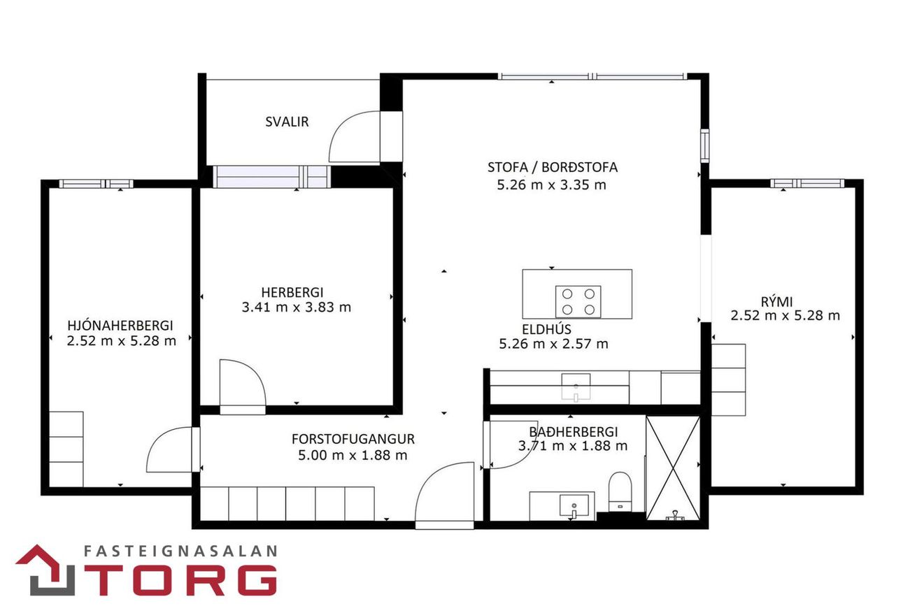 Stofa og borðstofa er í opnu alrými með eldhúsi. Þriðja