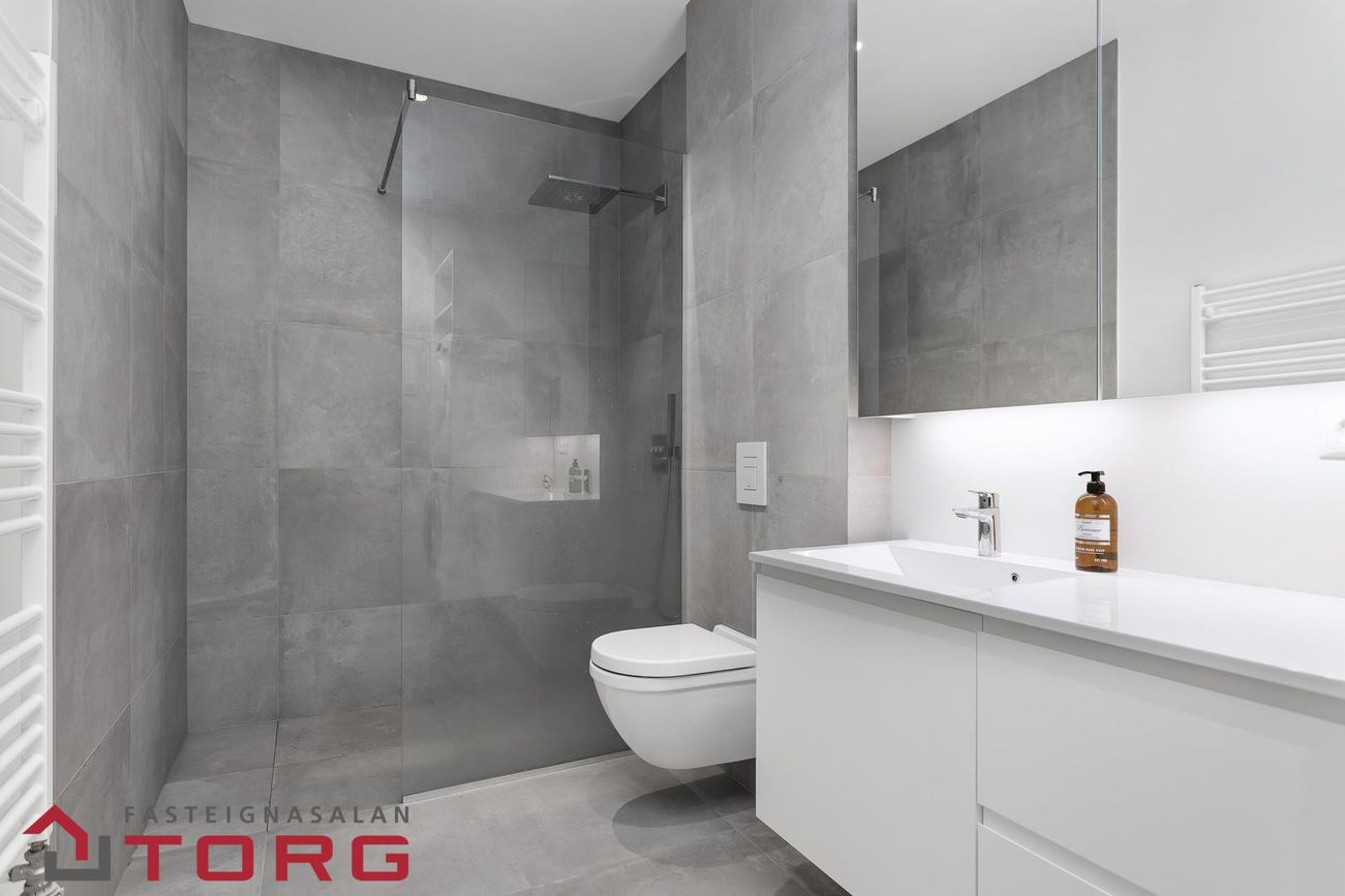 Baðherbergið er með flísalagt gólf ásamt flísalögðum veggi að hluta. Upphengt salerni og handklæðaofn. Sturta er með innfelldum blöndunartækjum og sturtugleri. Baðinnrétting er með skúffum og handlaug og speglaskáp þar fyrir ofan með borð lýsingu. Innrétting þar með aðstöðu og