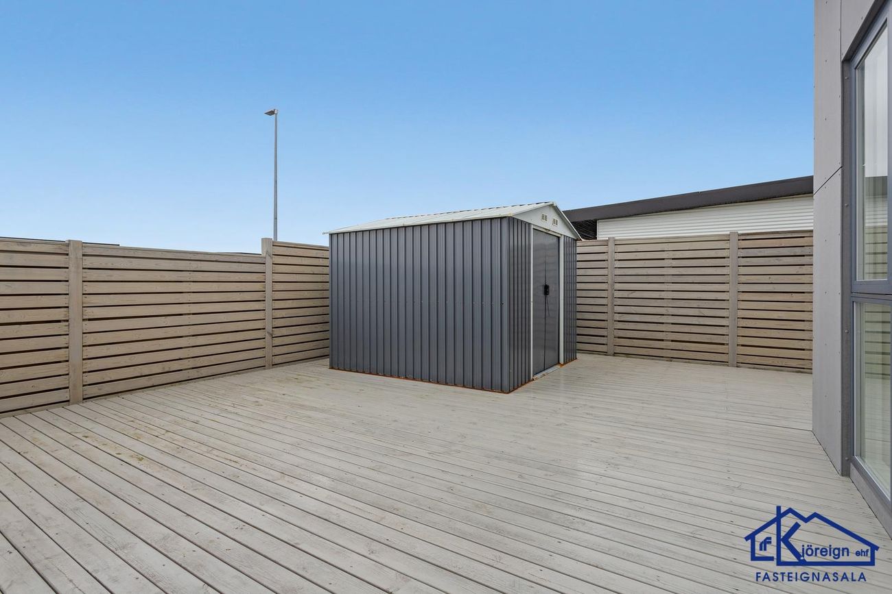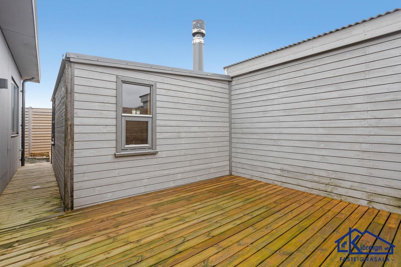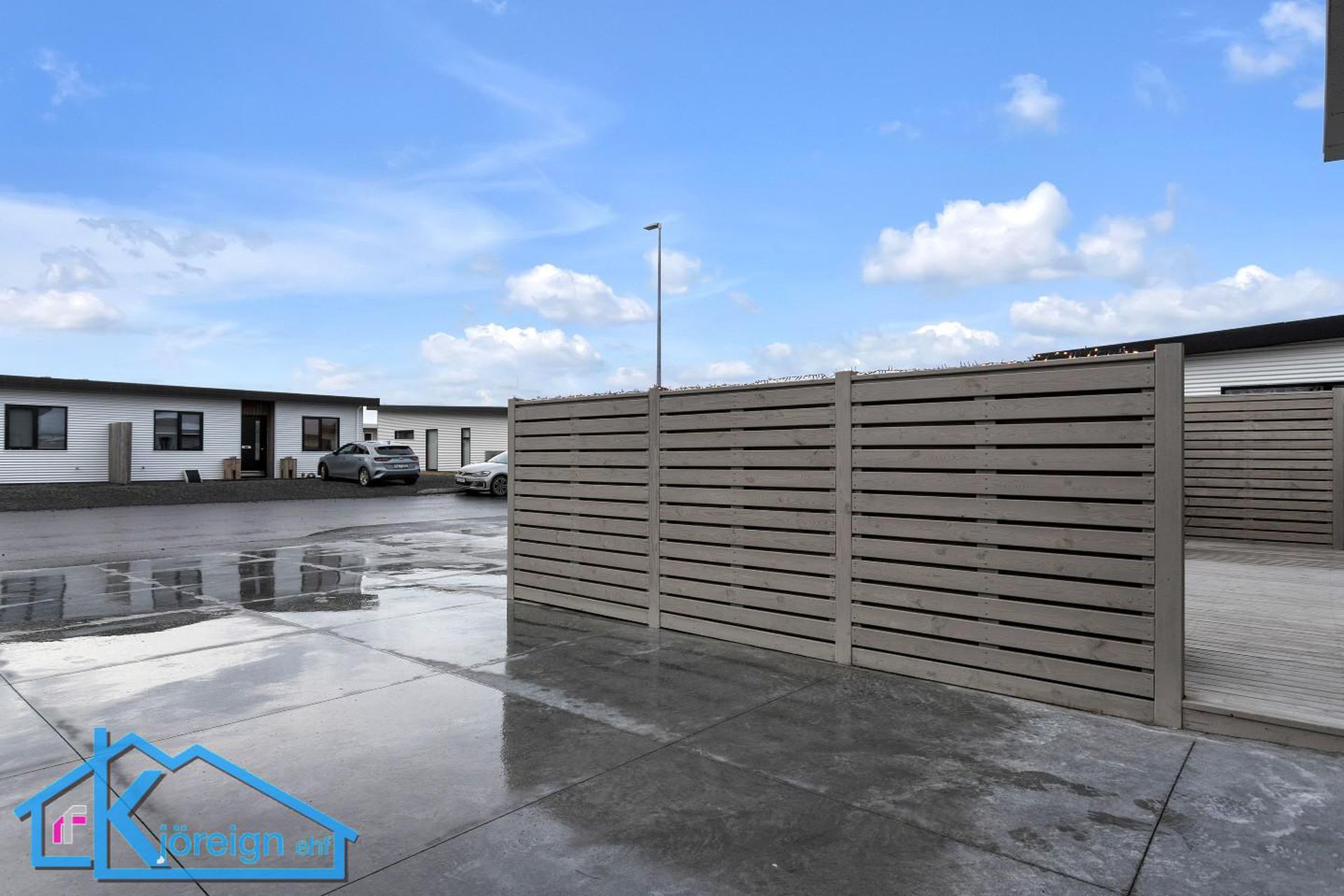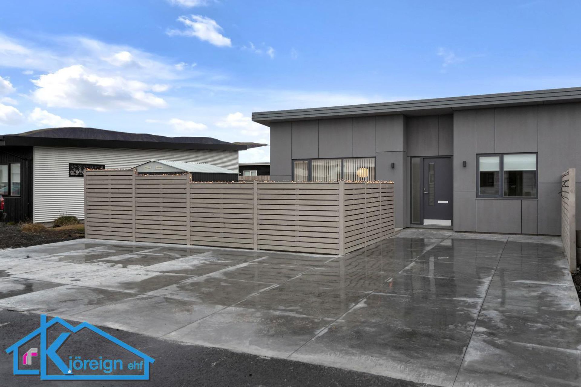 Kjöreign ehf., fasteignasala, Ármúla 21, Reykjavík, sími 533-4040 kynnir glæsilegt nýlegt endaraðhús með þremur rúmgóðum svefnherbergjum á einni hæð við Urriðalæk, Árborg. Birt stærð er 114,4 fm. Lýsing. Forstofa, forstofuherbergi, stofa, eldhús, þvottahús og geymsla, baðherbergi og tvö svefnherbergi. Tvær stakar byggingar á lóðinni. Nánari lýsing. Flísalögð forstofa með skáp. Forstofuherbergi með skáp. Rúmgóð stofa með rennihurð út á sólpall. Eldhús innaf stofunni með góðri innréttingu frá HTH og AEG tækjum. Eldhúsið er með stórri eyju. Rúmgott þvottahús með innréttingu og innaf þvottahúsinu er góð geymsla, rennihurð á milli. Rúmgott barnaherbergi með skáp og gott hjónaherbergi með skáp. Rúmgott þvottahús með innréttingu. Sturta og baðker í baðherberginu og góð innrétting. Útihurð er úr baðherberginu. Harðparket er á gólfum, en gólfflísar á þvottahúsinu. Gólfhiti er í húsinu. Aukin lofthæð og innfelld loftalýsing. Vandað timburhús, klætt að utanverðu með fallegri klæðningu, steinflísar. Lóðin er fullfrágengin. Sólpallar eru ca. 70 fm. Steypt bílaplan. Geymsluskúr úr járni, óeinangraður. Bakvið húsið er 14 fm. timburbygging, einangruð og með gluggum. Ekkert formlegt húsfélag er starfandi.