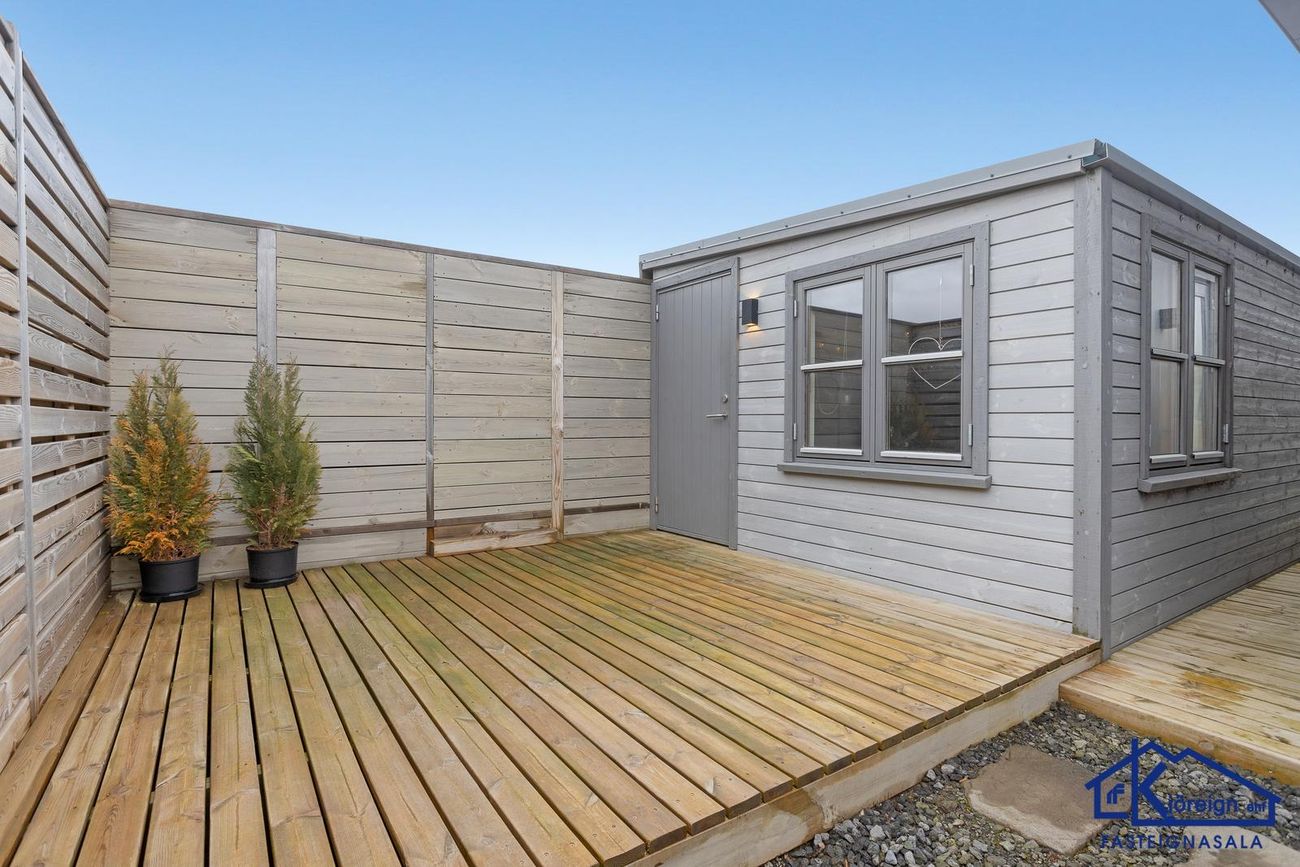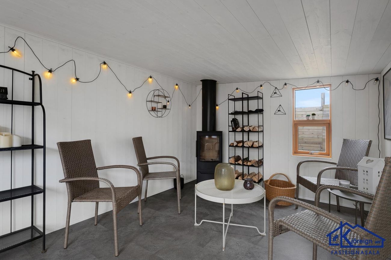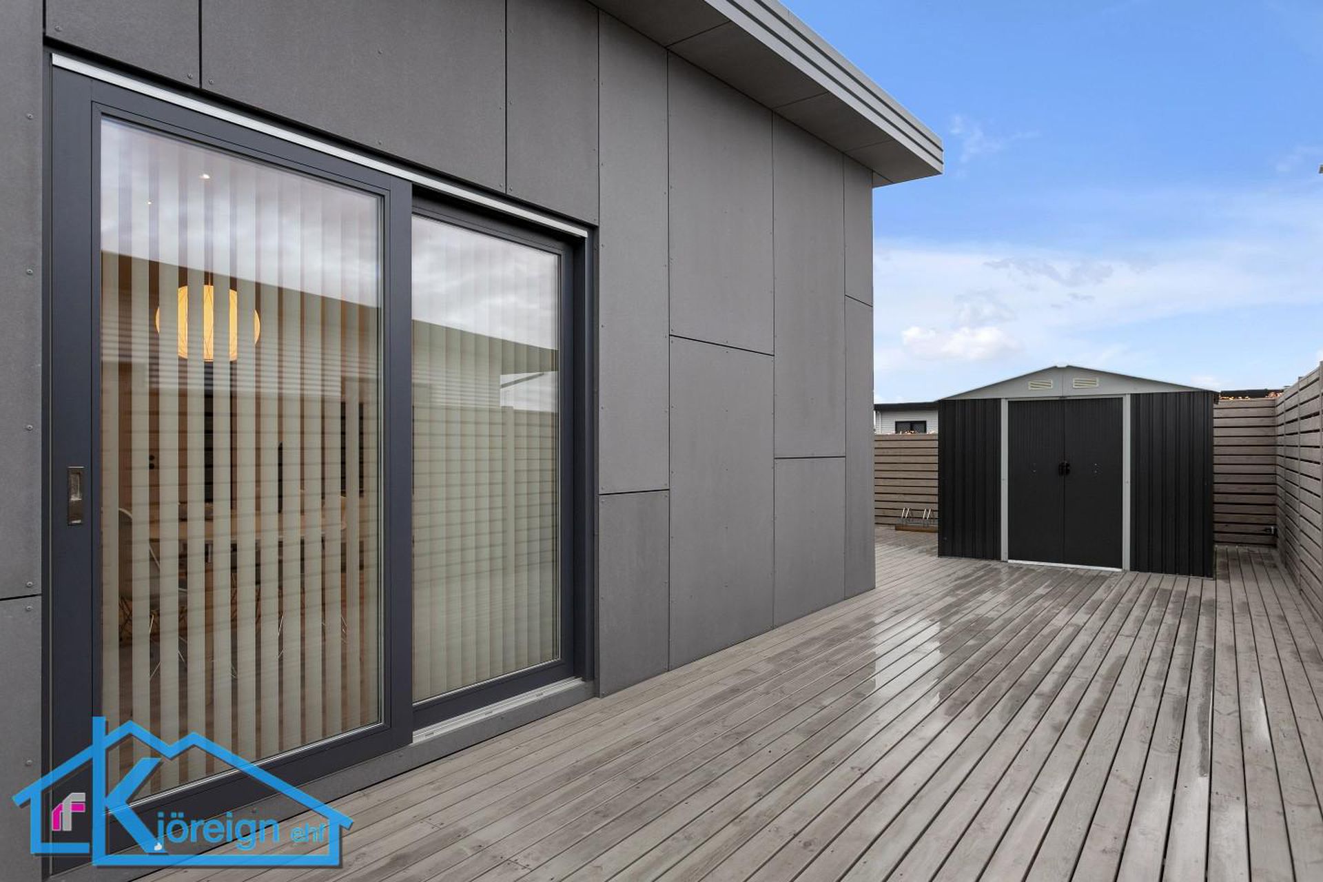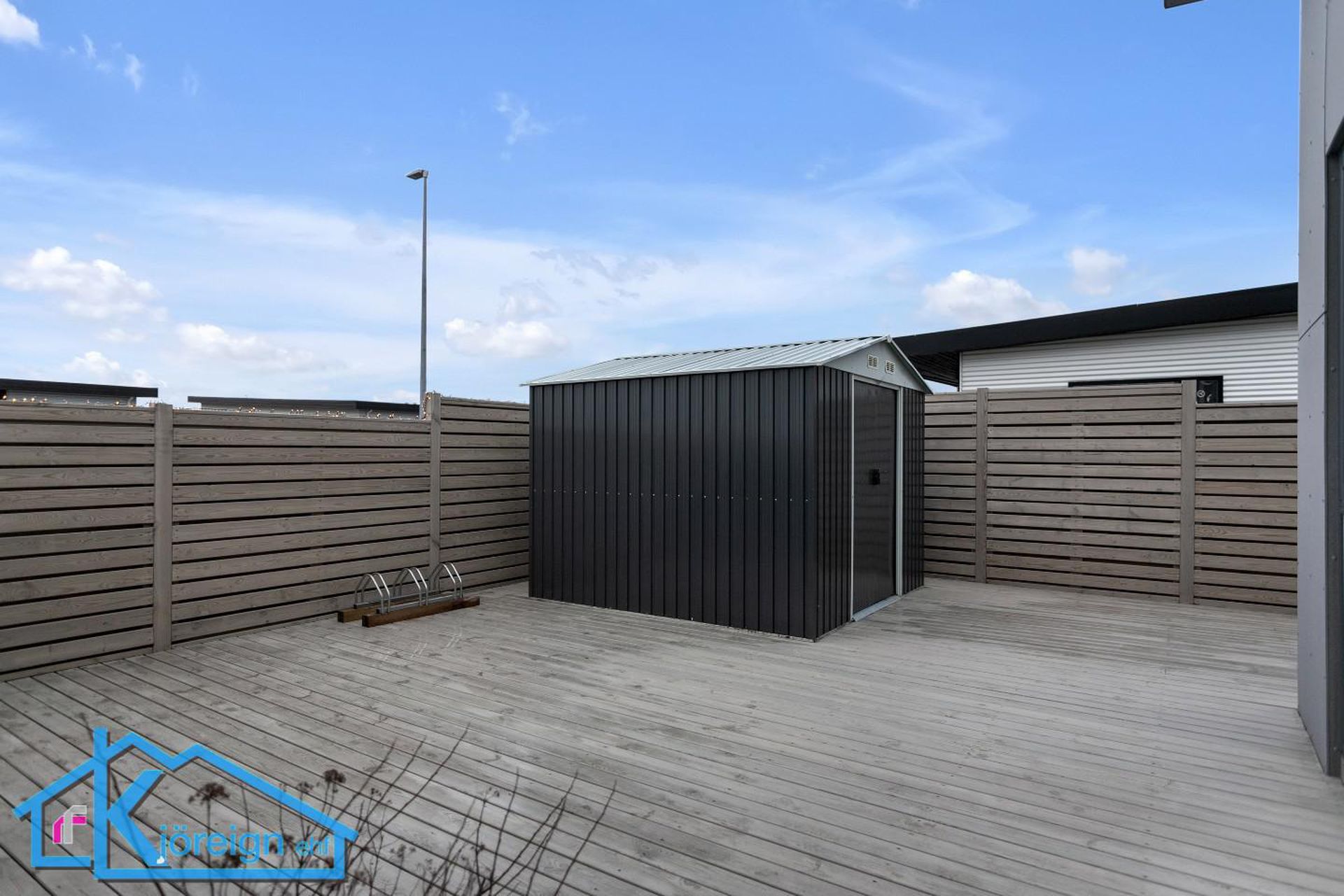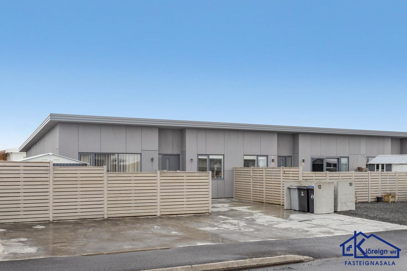 Kjöreign ehf., fasteignasala, Ármúla 21, Reykjavík, sími 533-4040 kynnir glæsilegt nýlegt endaraðhús með þremur rúmgóðum svefnherbergjum á einni hæð við Urriðalæk, Árborg. Birt stærð er 114,4 fm. Lýsing. Forstofa, forstofuherbergi, stofa, eldhús, þvottahús og geymsla, baðherbergi og tvö svefnherbergi. Tvær stakar byggingar á lóðinni. Nánari lýsing. Flísalögð forstofa með skáp. Forstofuherbergi með skáp. Rúmgóð stofa með rennihurð út á sólpall. Eldhús innaf stofunni með góðri innréttingu frá HTH og AEG tækjum. Eldhúsið er með stórri eyju. Rúmgott þvottahús með innréttingu og innaf þvottahúsinu er góð geymsla, rennihurð á milli. Rúmgott barnaherbergi með skáp og gott hjónaherbergi með skáp. Rúmgott þvottahús með innréttingu. Sturta og baðker í baðherberginu og góð innrétting. Útihurð er úr baðherberginu. Harðparket er á gólfum, en gólfflísar á þvottahúsinu. Gólfhiti er í húsinu. Aukin lofthæð og innfelld loftalýsing. Vandað timburhús, klætt að utanverðu með fallegri klæðningu, steinflísar. Lóðin er fullfrágengin. Sólpallar eru ca. 70 fm. Steypt bílaplan. Geymsluskúr úr járni, óeinangraður. Bakvið húsið er 14 fm. timburbygging, einangruð og með gluggum. Ekkert formlegt húsfélag er starfandi.