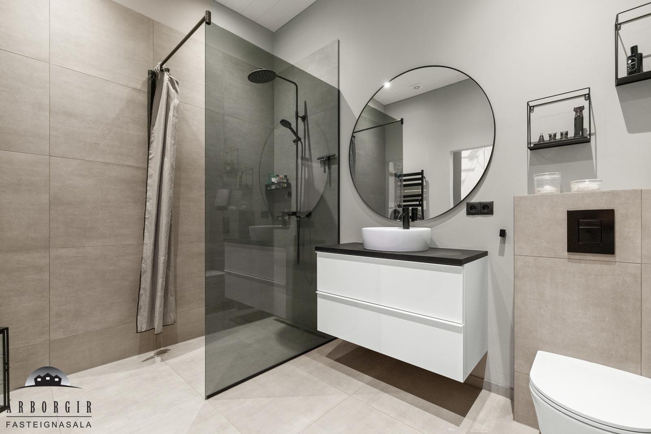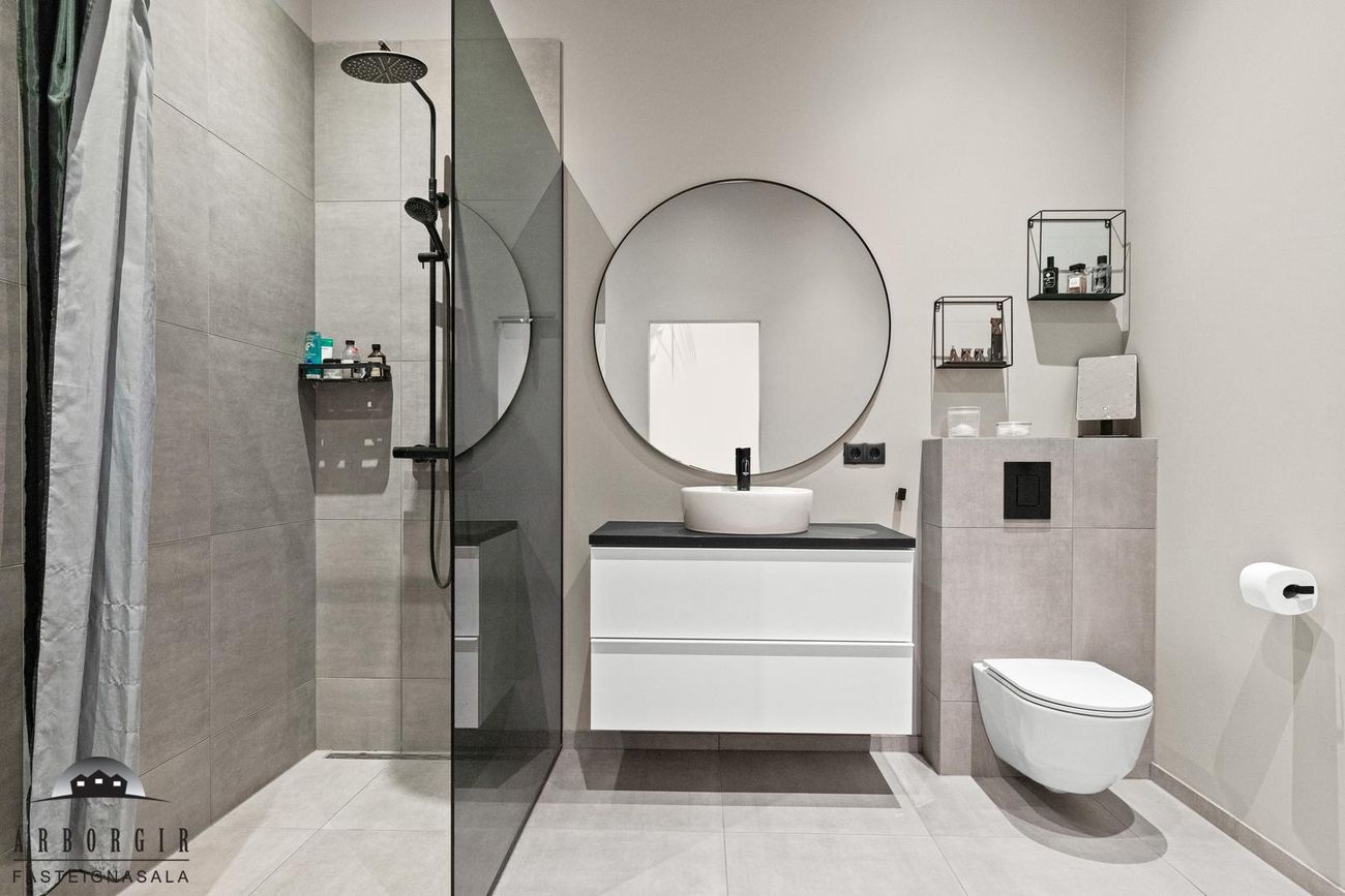 Baðherbergi er flísalagt og þar er gólfsturta og góð innrétting.