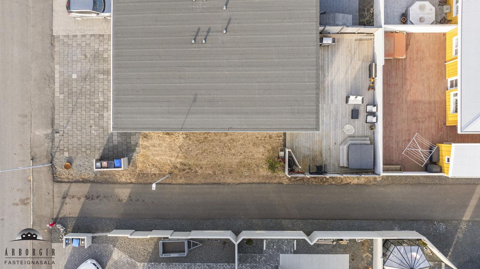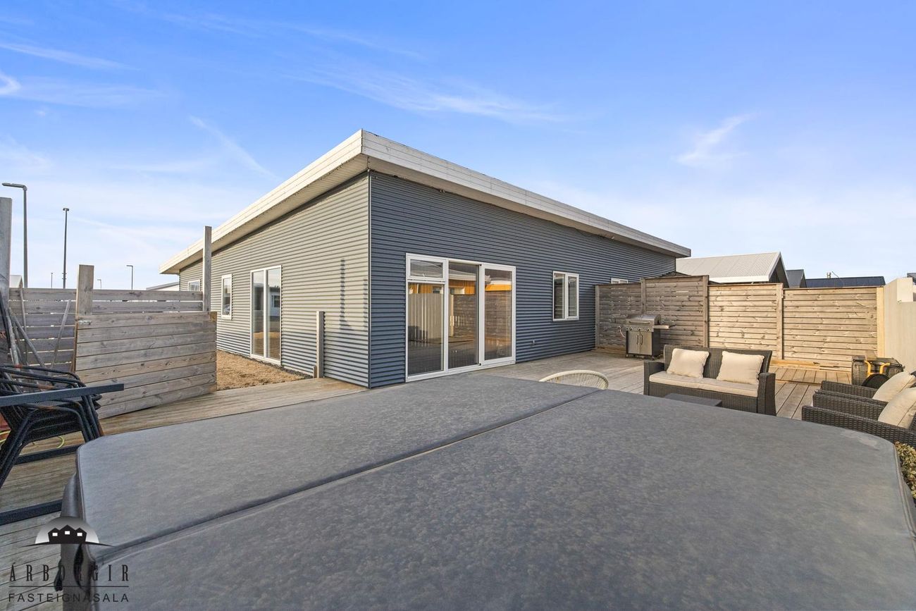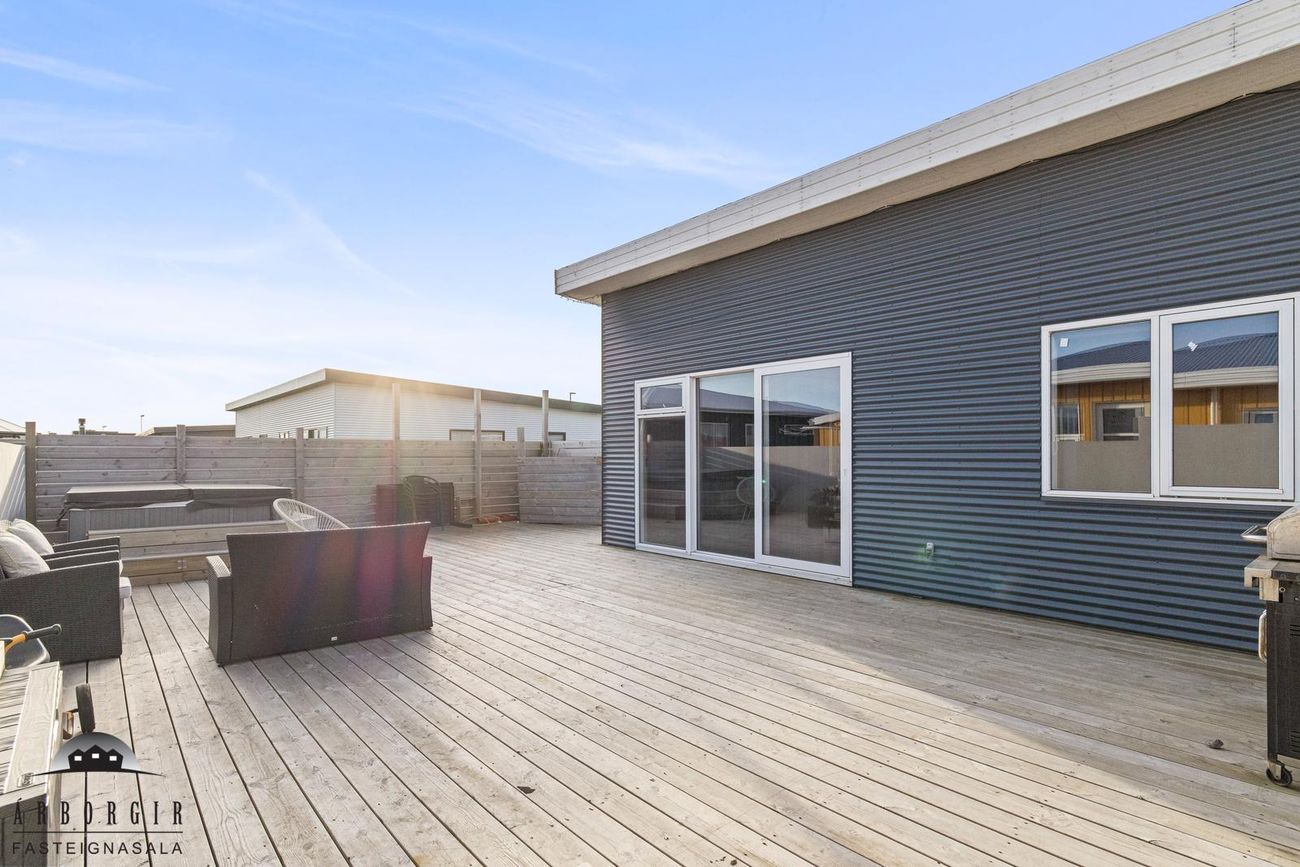 Stór pallur með skjólveggjum og heitum potti er á baklóð, innkeyrsla er hellulögð.