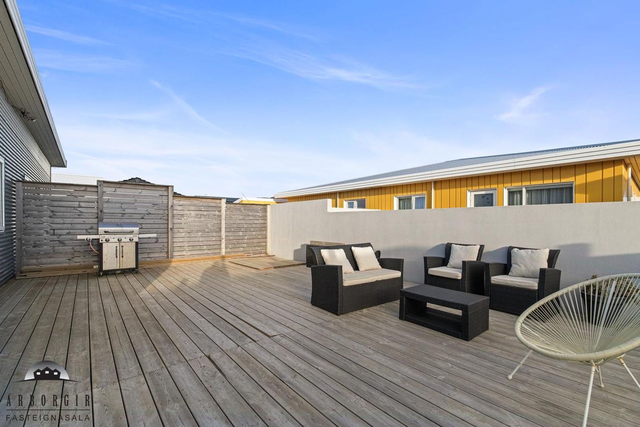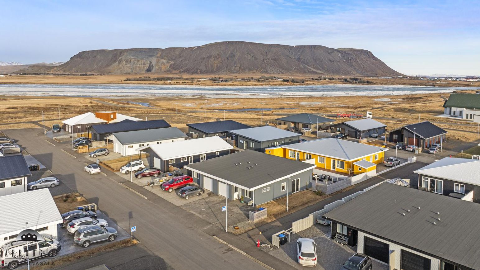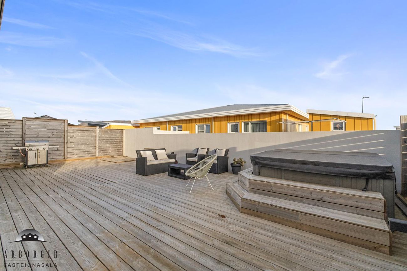 Stór pallur með skjólveggjum og heitum potti er á baklóð, innkeyrsla er hellulögð.