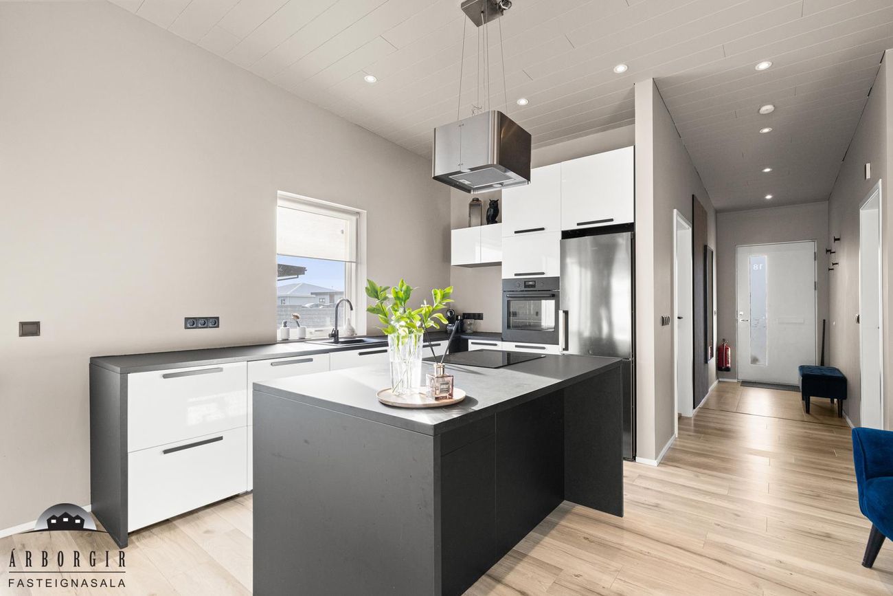 Stofa og eldhús eru í opnu parketlögðu rými, snyrtileg innrétting er í eldhúsi en í stofu er útgengt á sólpall á baklóð.