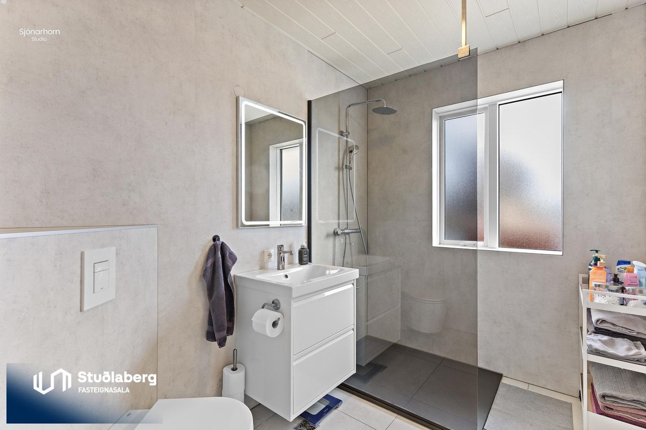Baðherbergi hefur flísar á gólfi og á veggjum, þar er upphengt salerni, góð sturtuaðstaða og góð innrétting.