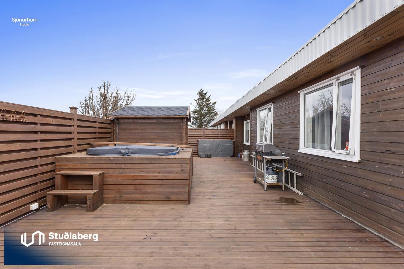 Stofa er rúmgóð og þar eru flísar á gólfi, útgengt er frá stofu á afgirta verönd með heitum potti.