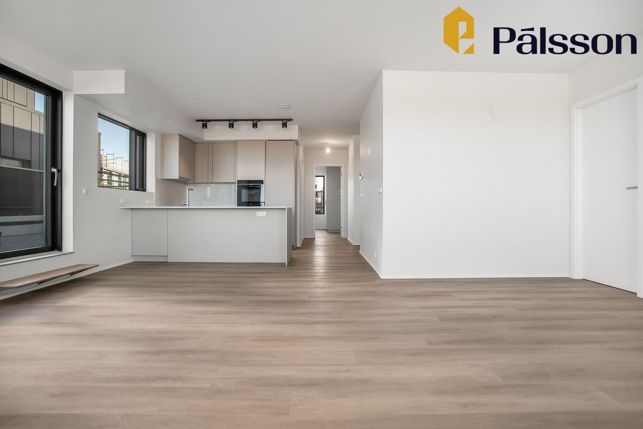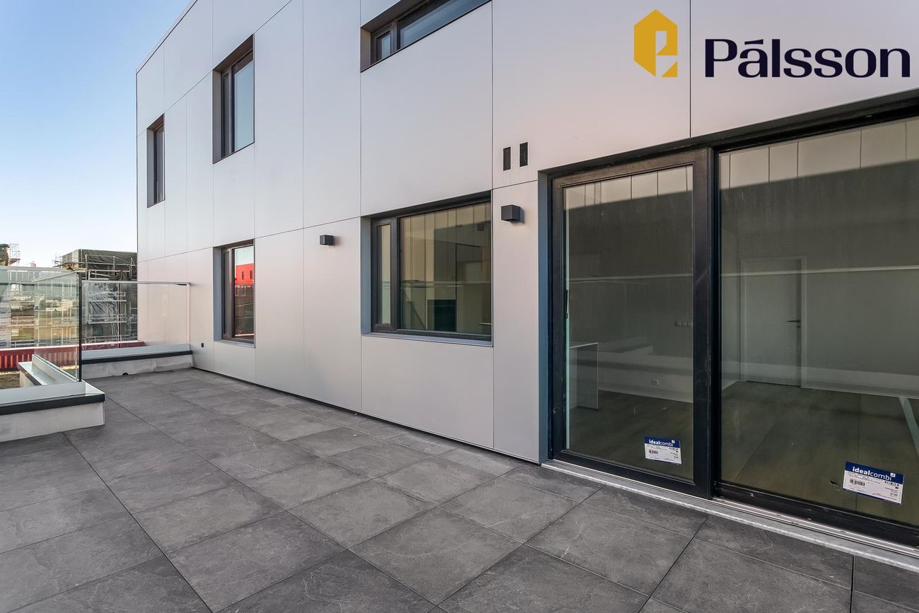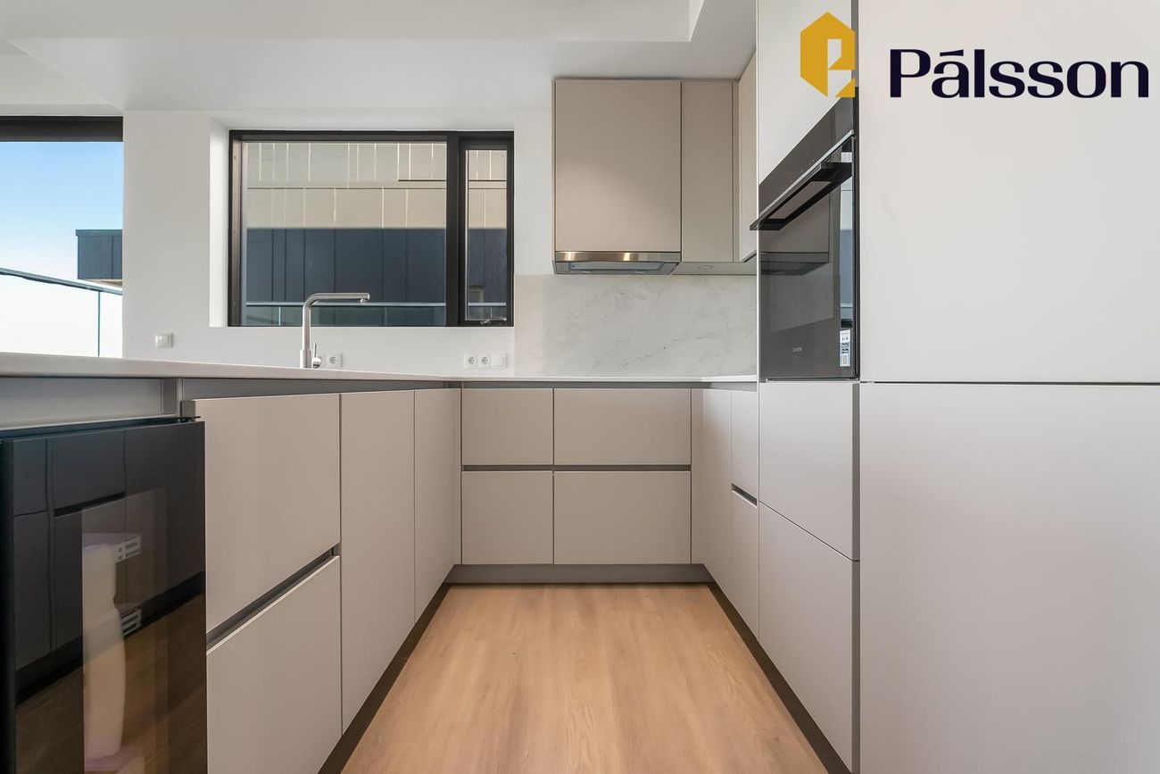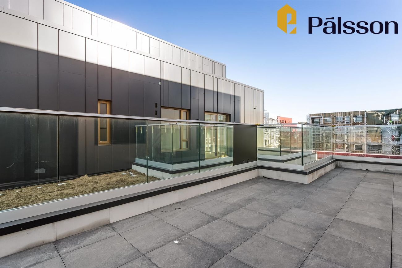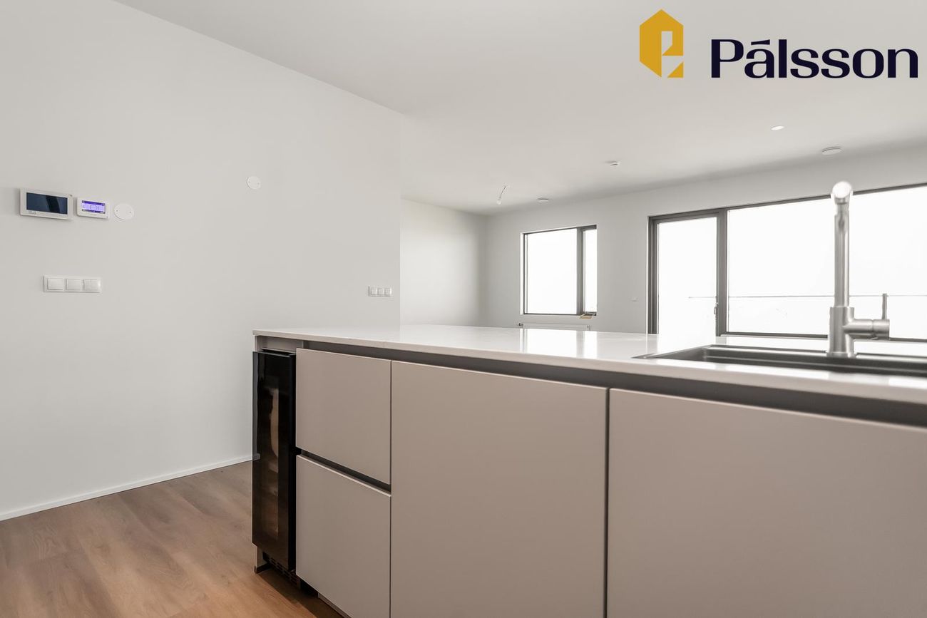Íbúðin skiptist í anddyri, eldhús og stofu/borðstofu í opnu rými með útgengi á vestursvalir og rúmgóðar þaksvalir, fjögur svefnherbergi, baðherbergi og þvottaherbergi. Íbúðin afhendist með leirlitum sérsmíðuðum innréttingum frá Nobilia/GKS með inngreiptum höldum, gæðaraftækjum frá Siemens og Witt í hæsta gæðaflokki, hágæða ítölskum blöndunartækjum frá Mariner Rubinetterie og sterku og vönduðu gólfefni frá Álfaborg. Íbúðin er útbúin sér loftræstikerfi með varmaendurvinnslu. Innréttingarþema íbúðar er Mjöll 3.Nánari lýsing: