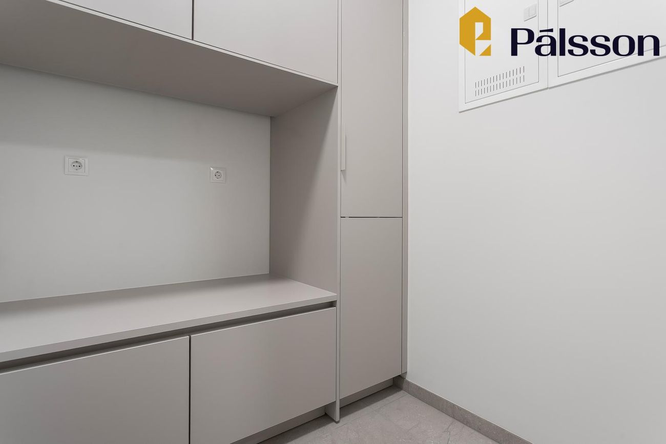 með ljósum innréttingum og tengi fyrir þvottavél og þurrkara í vinnuhæð.