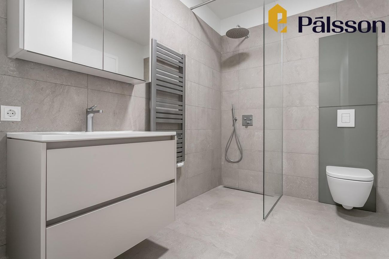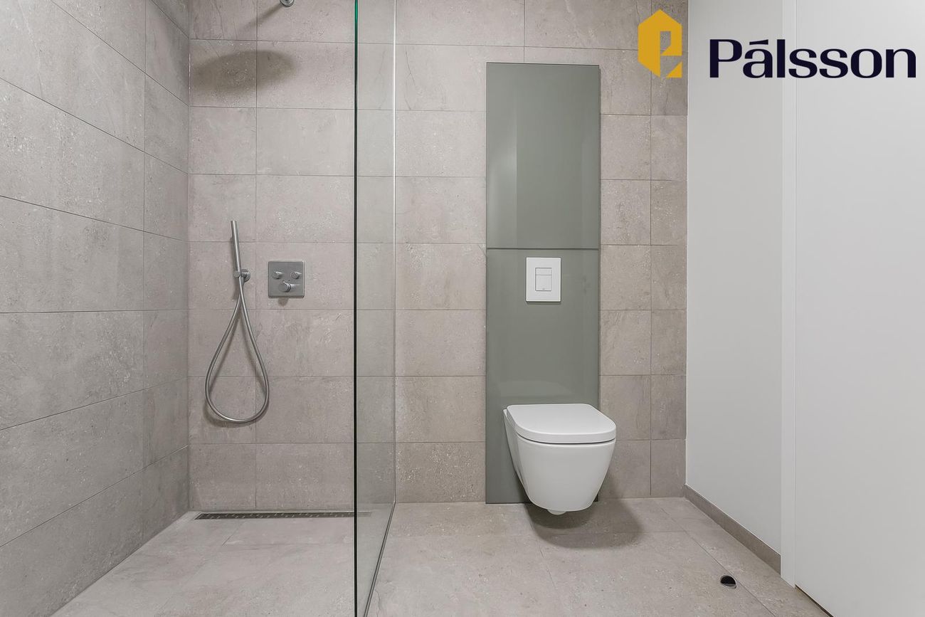Baðherbergi er með “walk-in” sturtu með hertu gleri, handklæðaofni og upphengdu salerni. Leirljósar steinflísar á gólfi og veggjum, leirlituð innrétting og speglaskápur með lýsingu. Blöndunartæki úr burstuðu krómi.