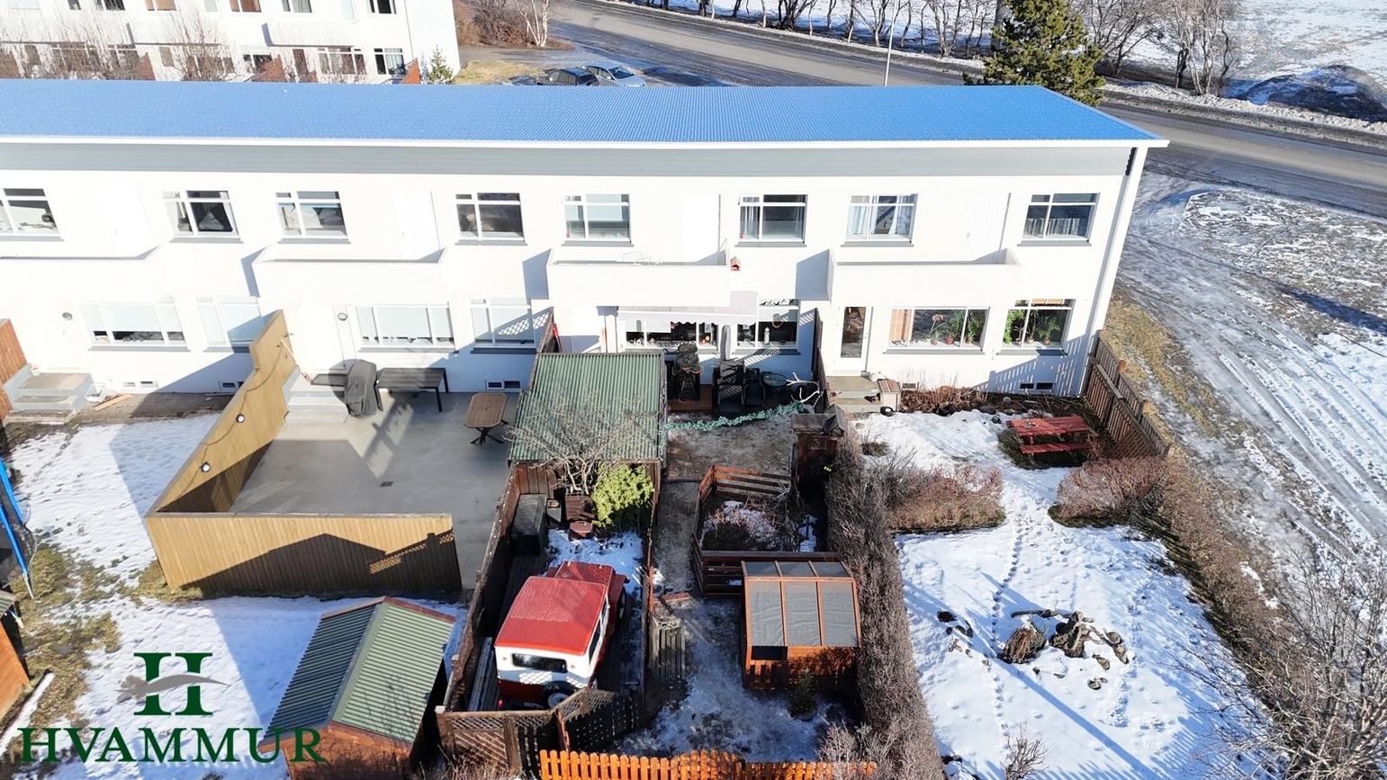 Garðurinn er snyrtilegur. Framan við húsið er malbikuð stétt sem liggur meðfram öllu raðhúsi og í henni er snjóbræðsla. Sólpallur, garðskúr og grillhýsi/skýli er vestan við húsið og þar er lóðin afgirt.