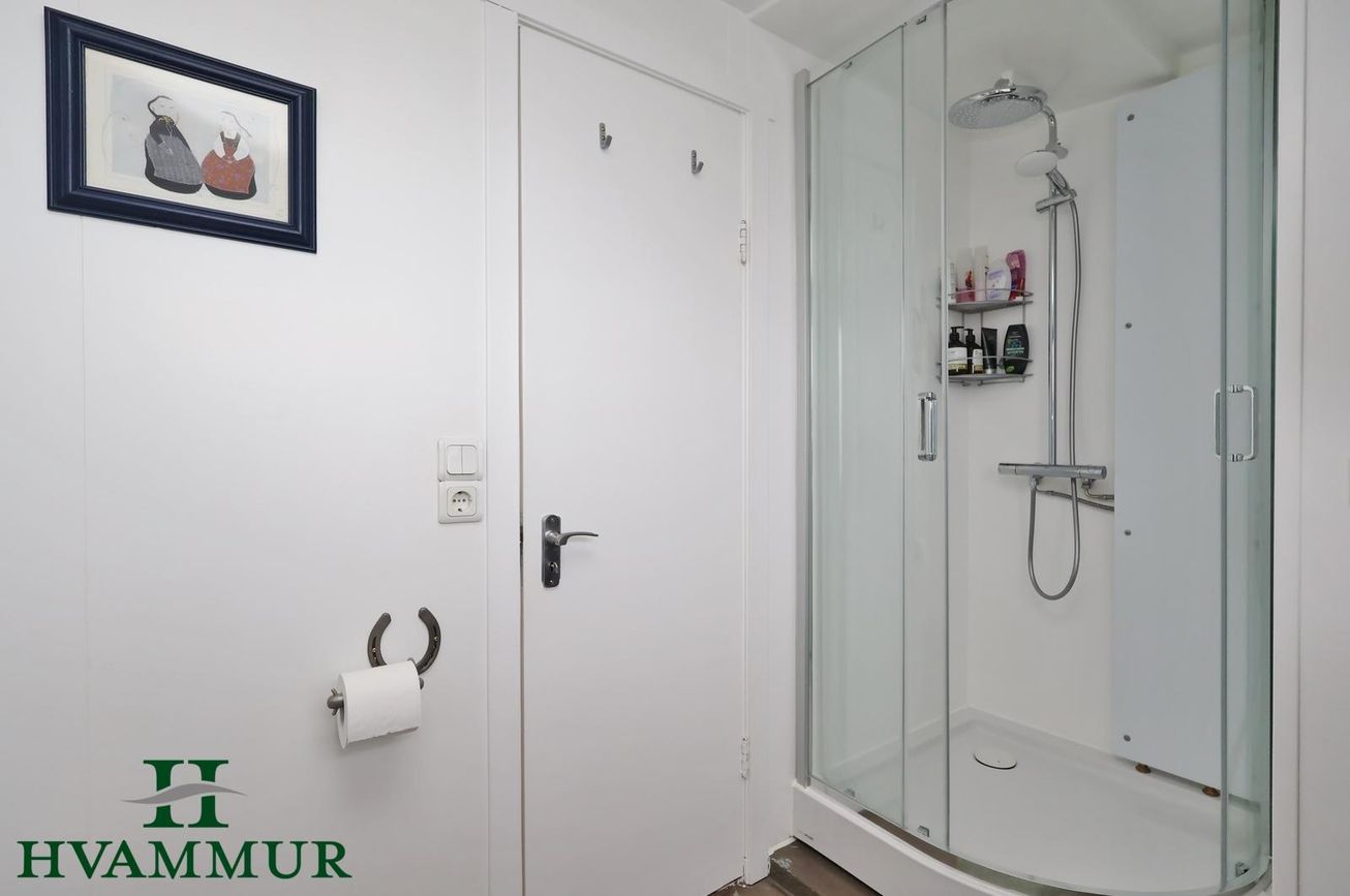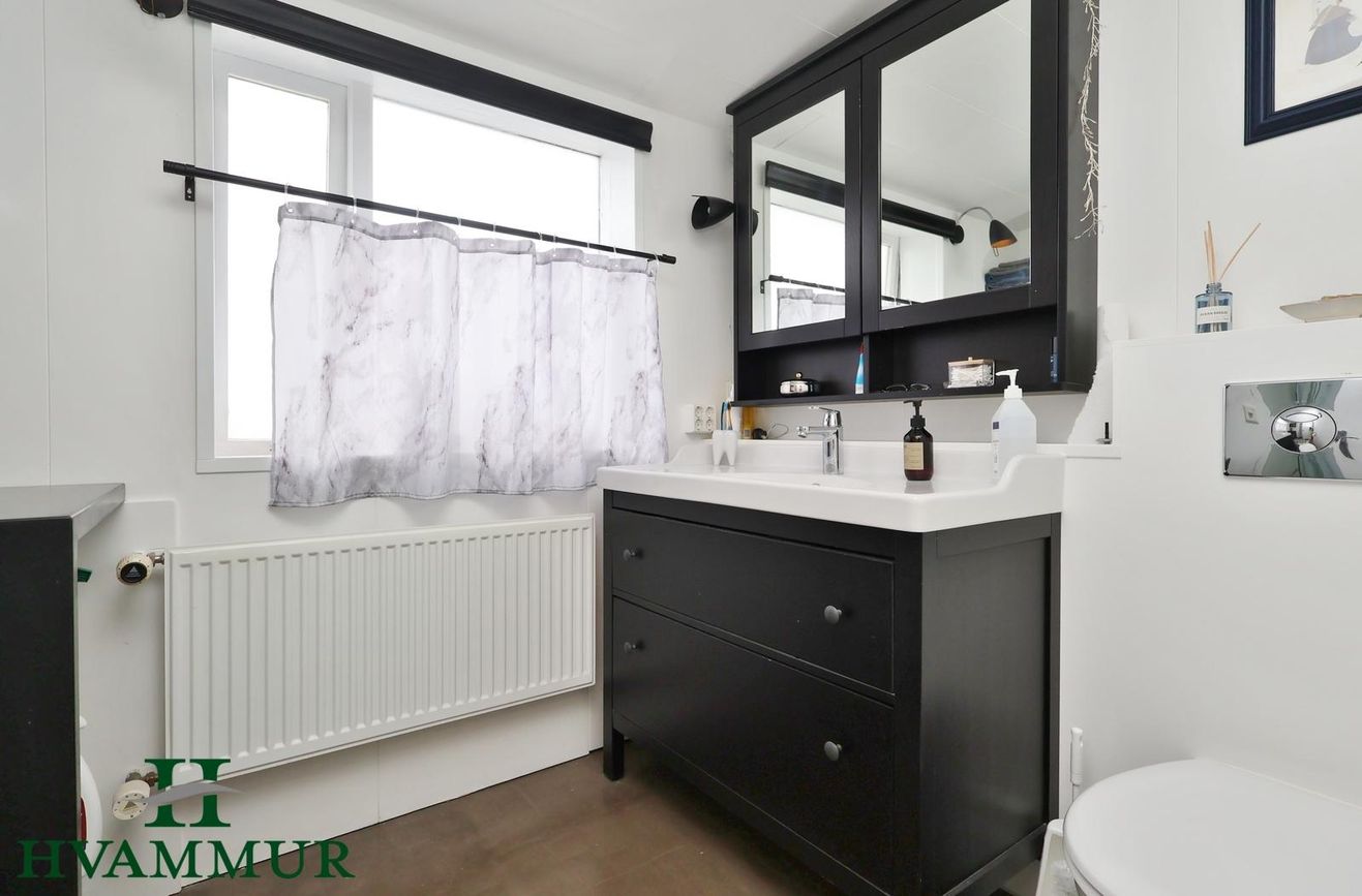 Baðherbergi á efri hæð var allt tekið í gegn fyrir nokkrum árum. Dökk viðarinnrétting og sturtuklefi, upphengd wc og opnanlegur gluggi. Í kjallara er lítil snyrting.