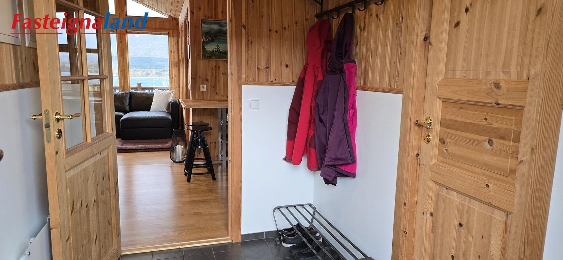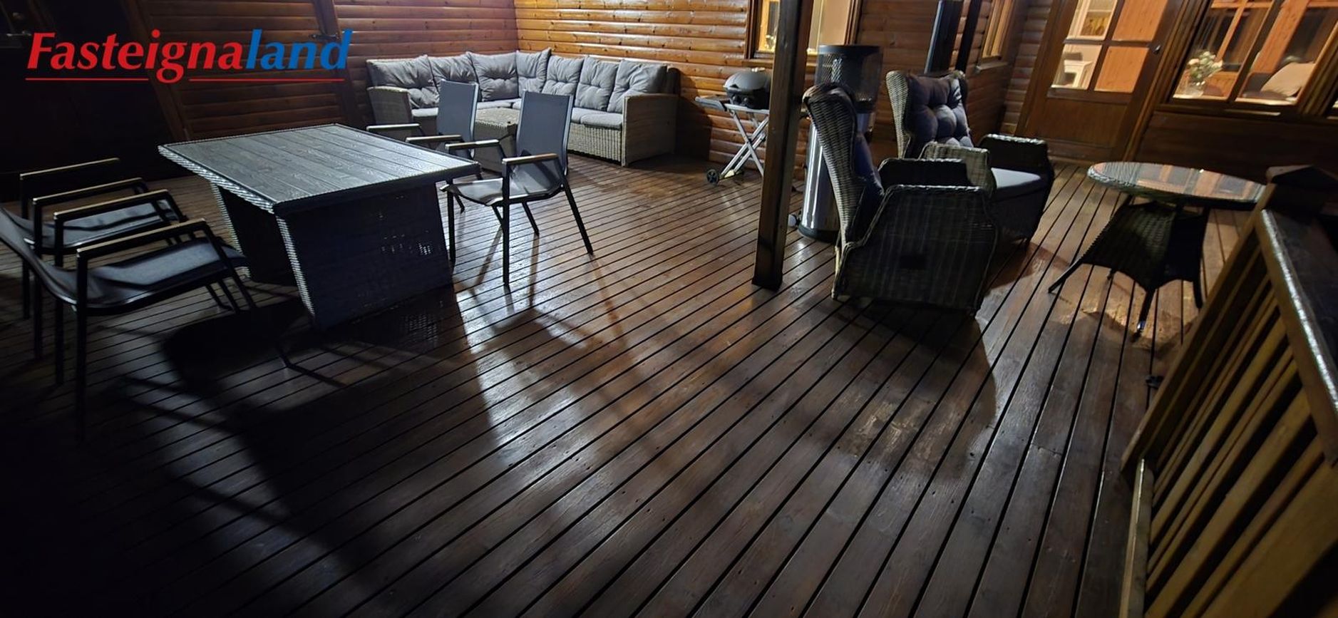 Stofa: Parket á gólfi og með útgang út á stóra timburverönd. Góð lofthæð.
