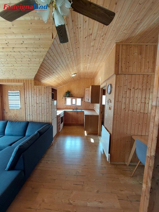Stofa: Parket á gólfi og með útgang út á stóra timburverönd. Góð lofthæð.