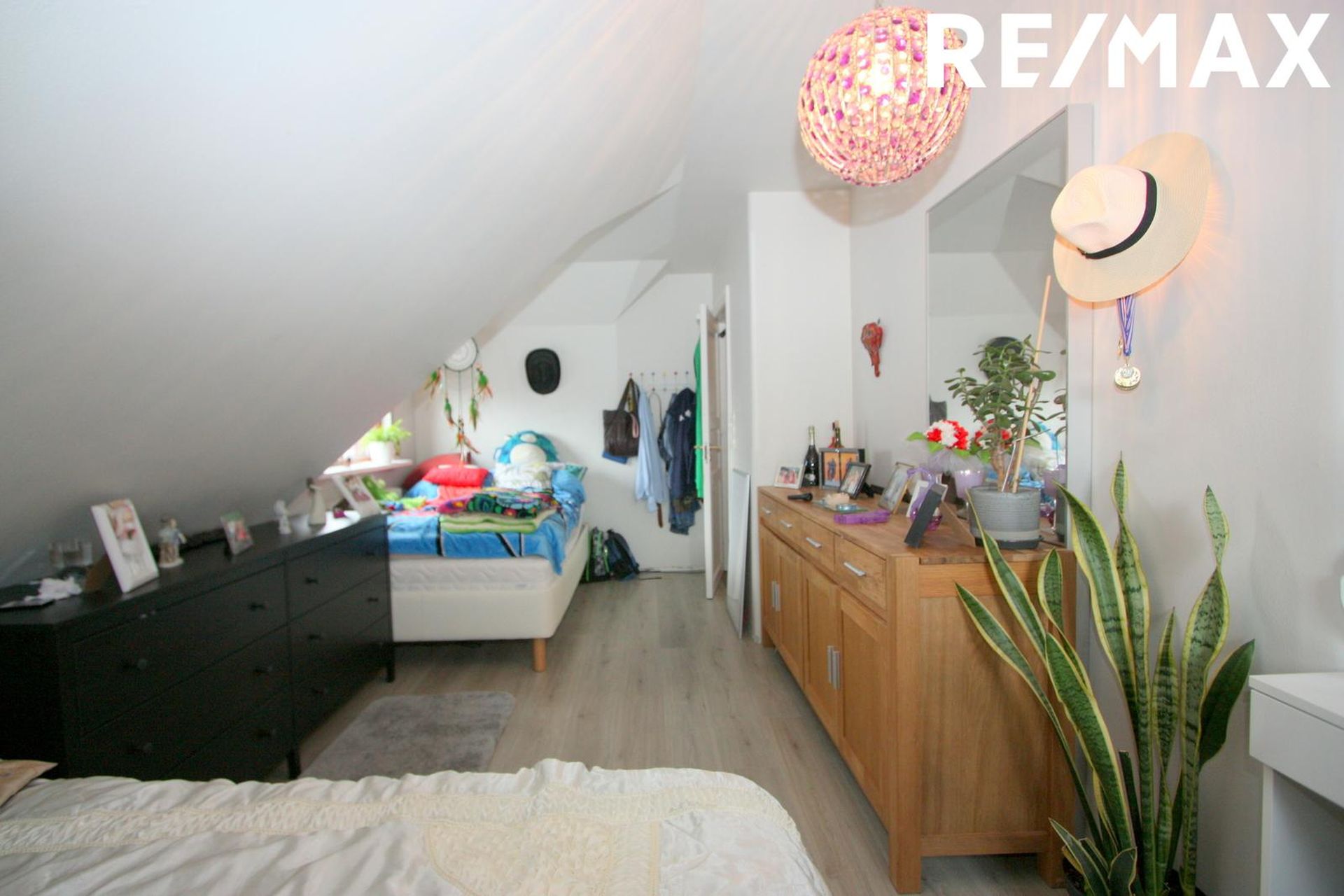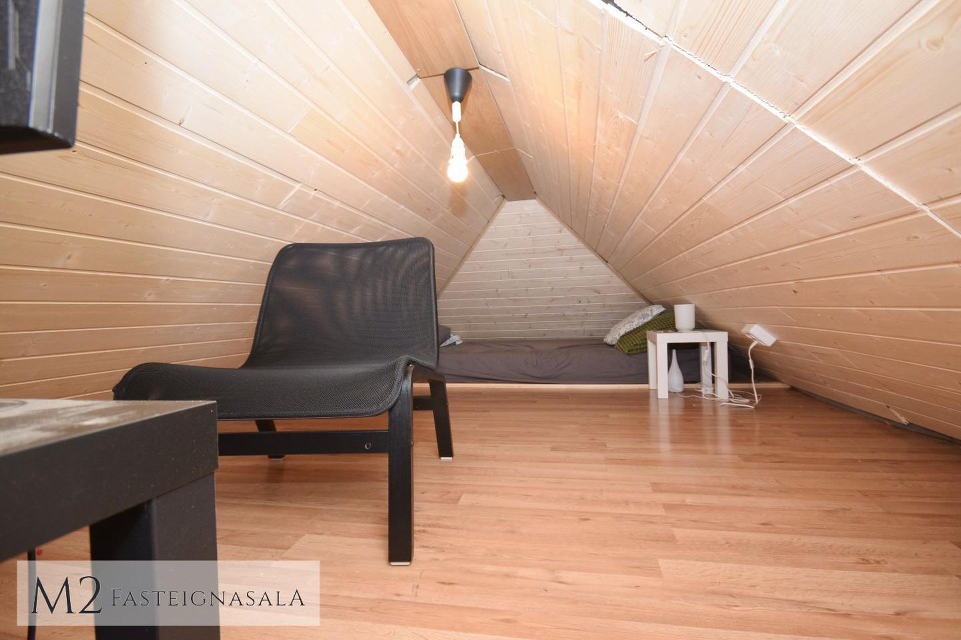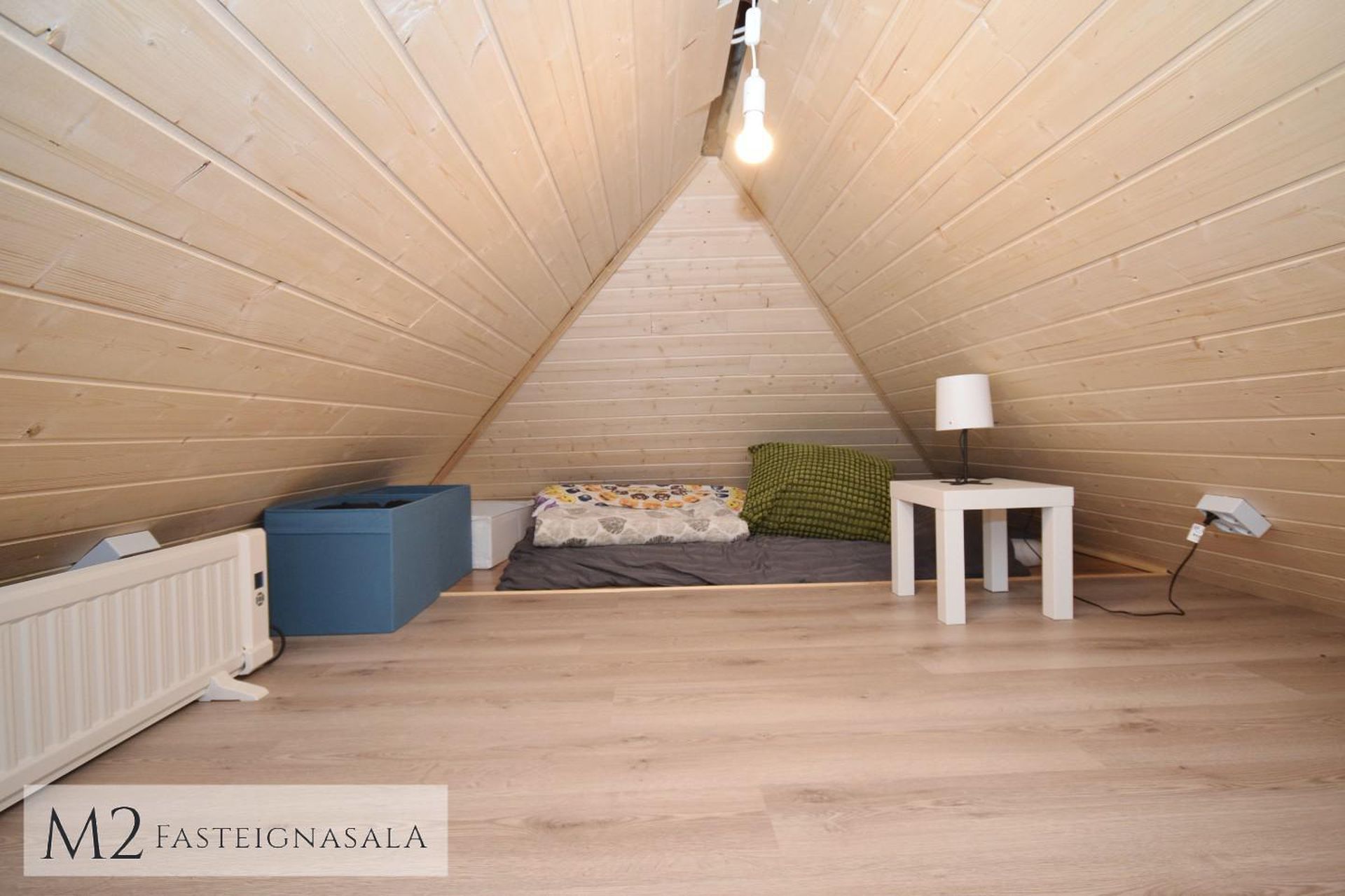 geymsluloft með lítilli lofthæð, plastparketi á gólfi og hefur verið klætt með panel í loft og veggi.