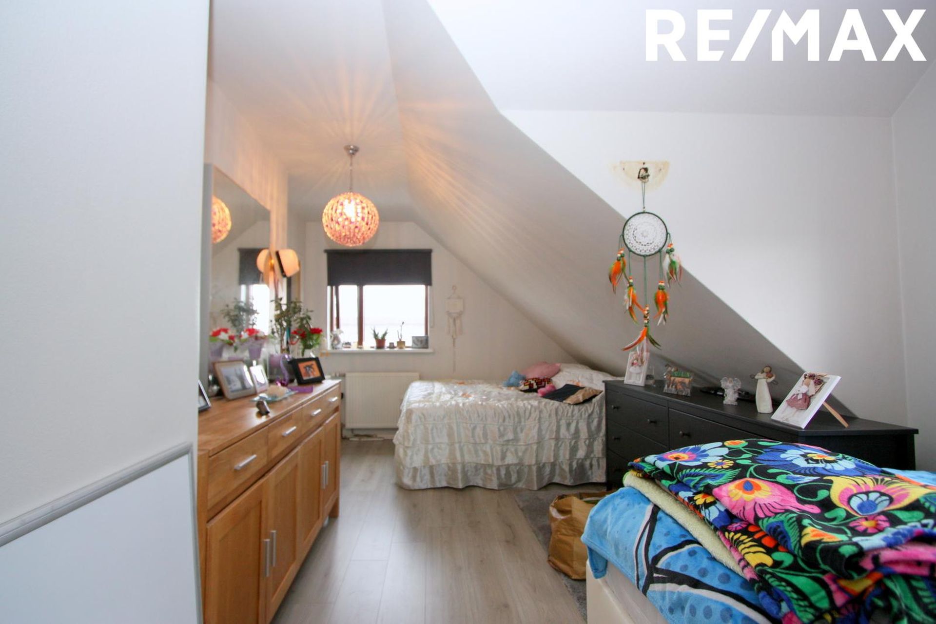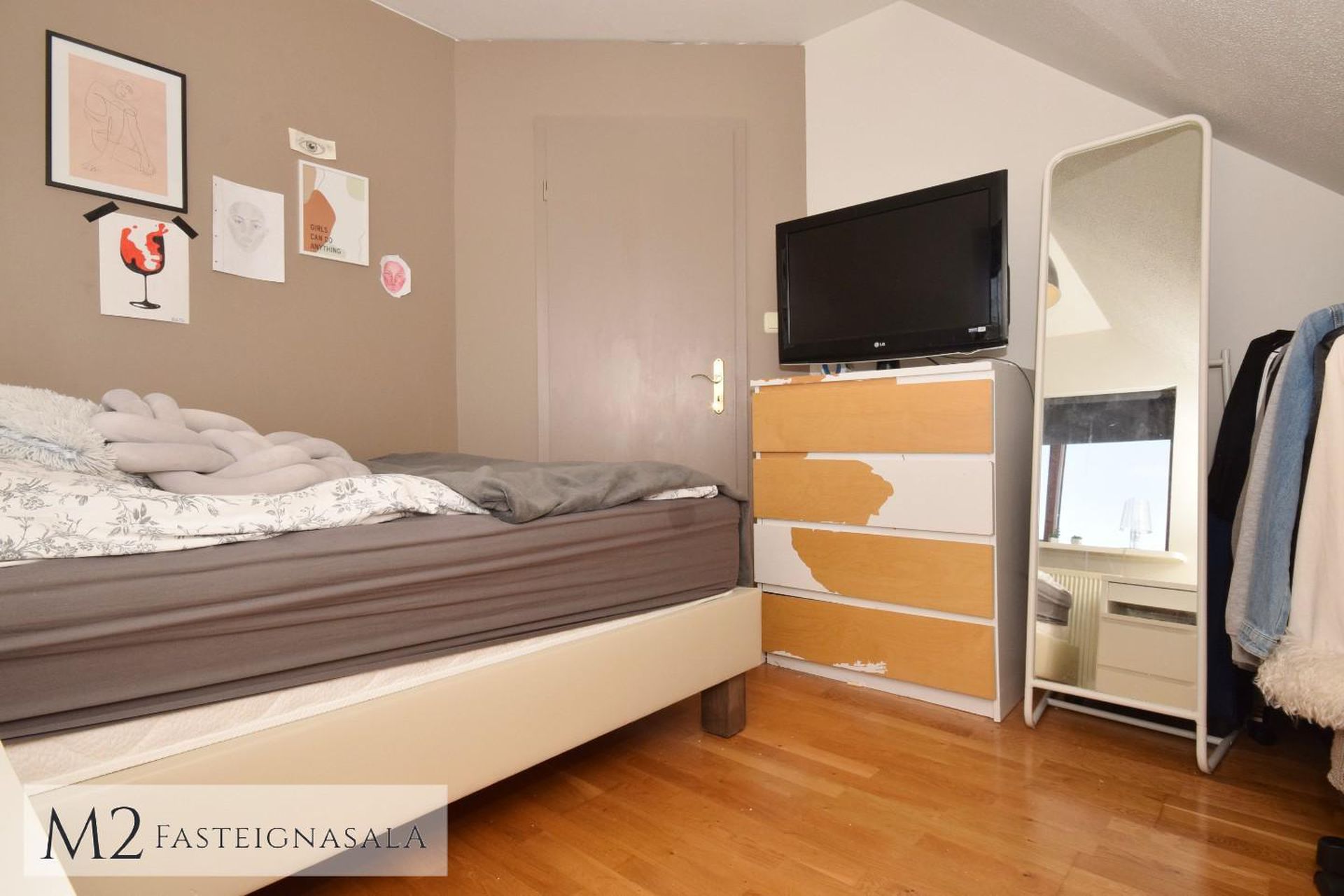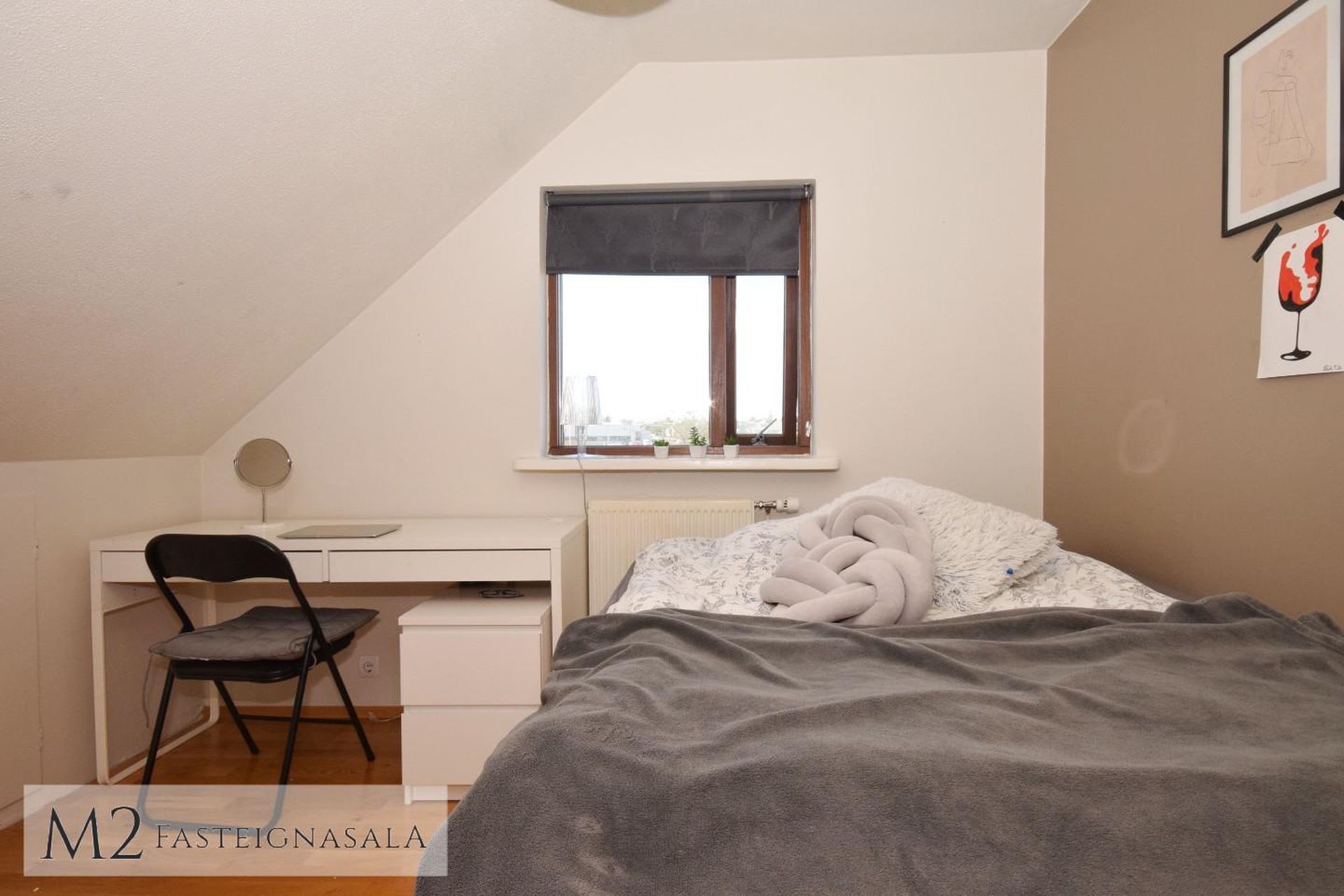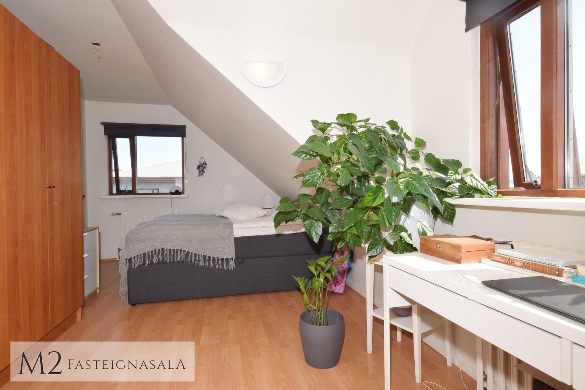 Svefnherbergin eru tvö, bæði með ágætu harðparketi á gólfum, stærra herbergið með