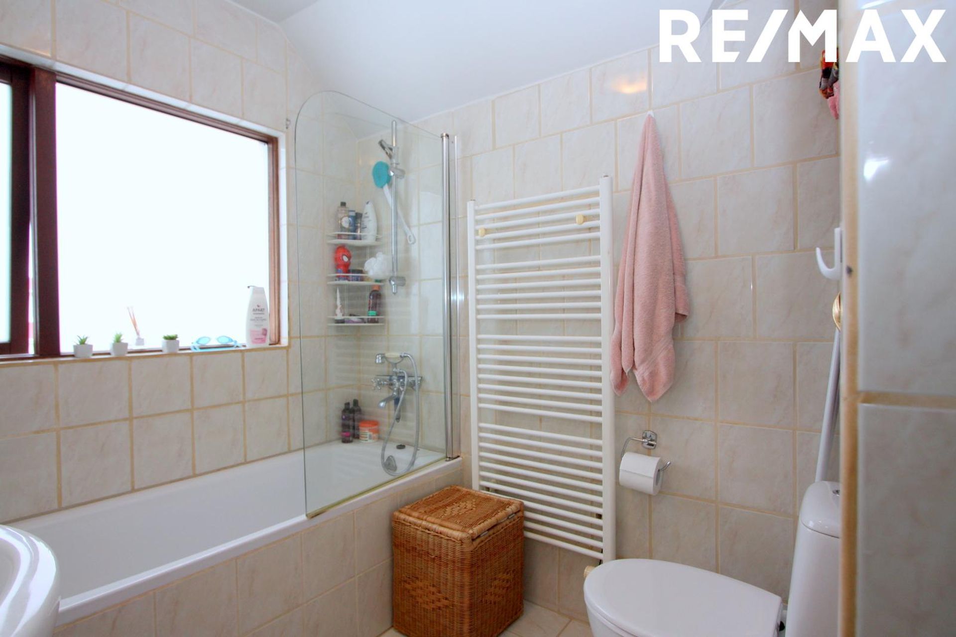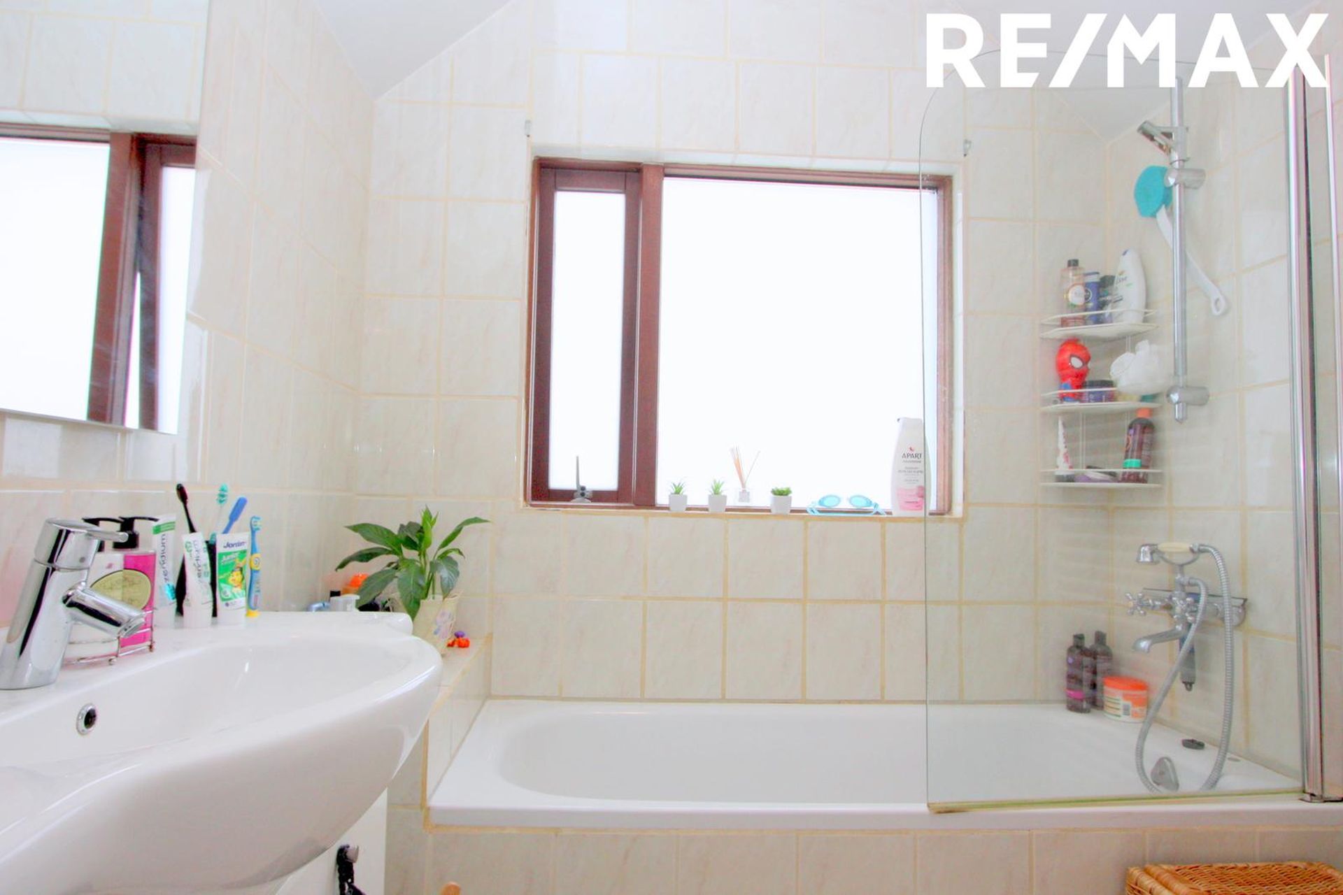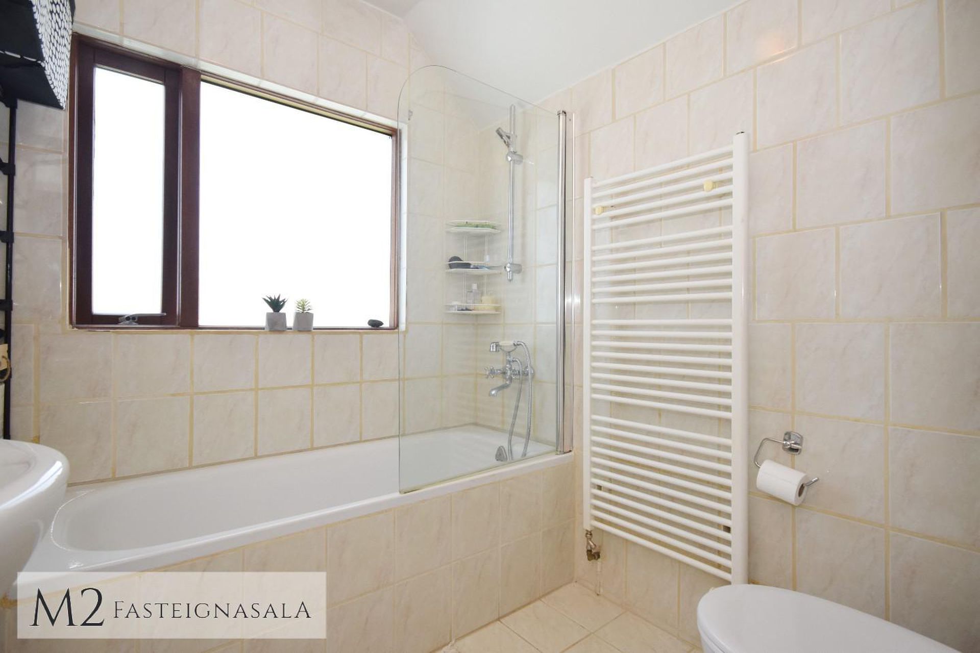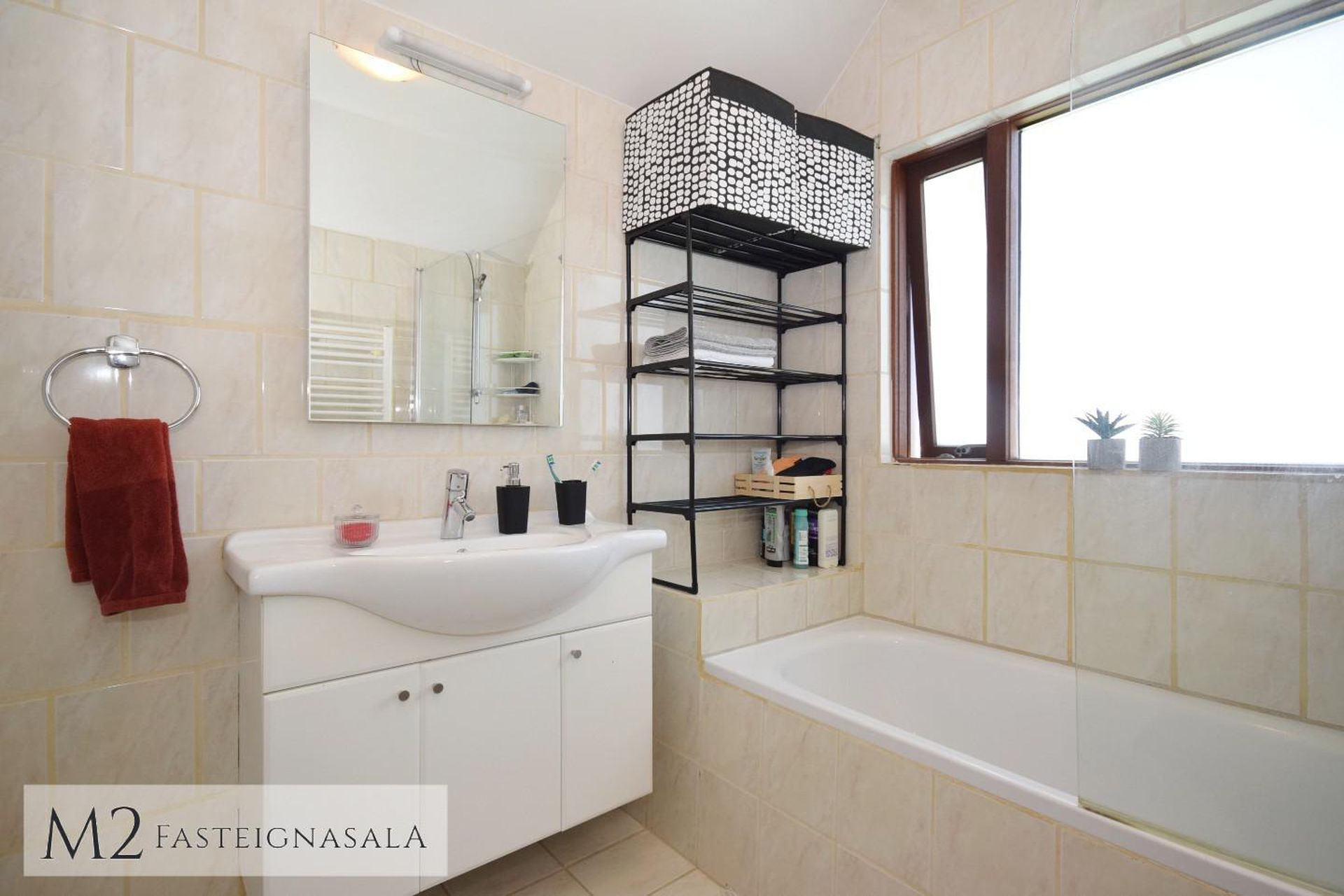 Baðherbergi er með flísum á gólfi og veggjum að hluta, baðkari með sturtuaðstöðu, og hvítri vaskinnréttingu.