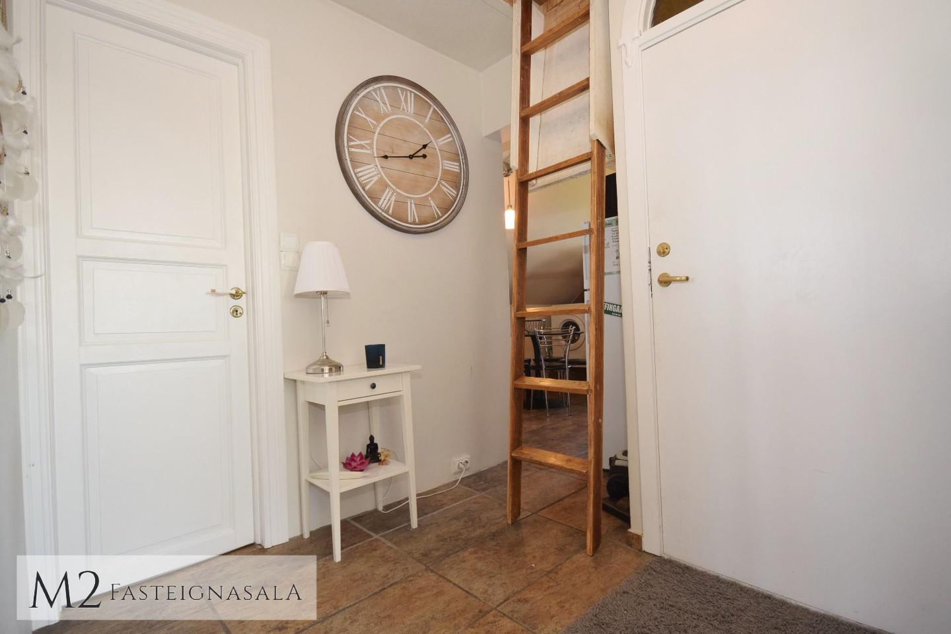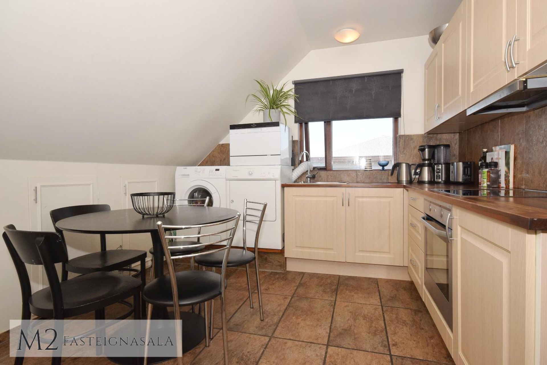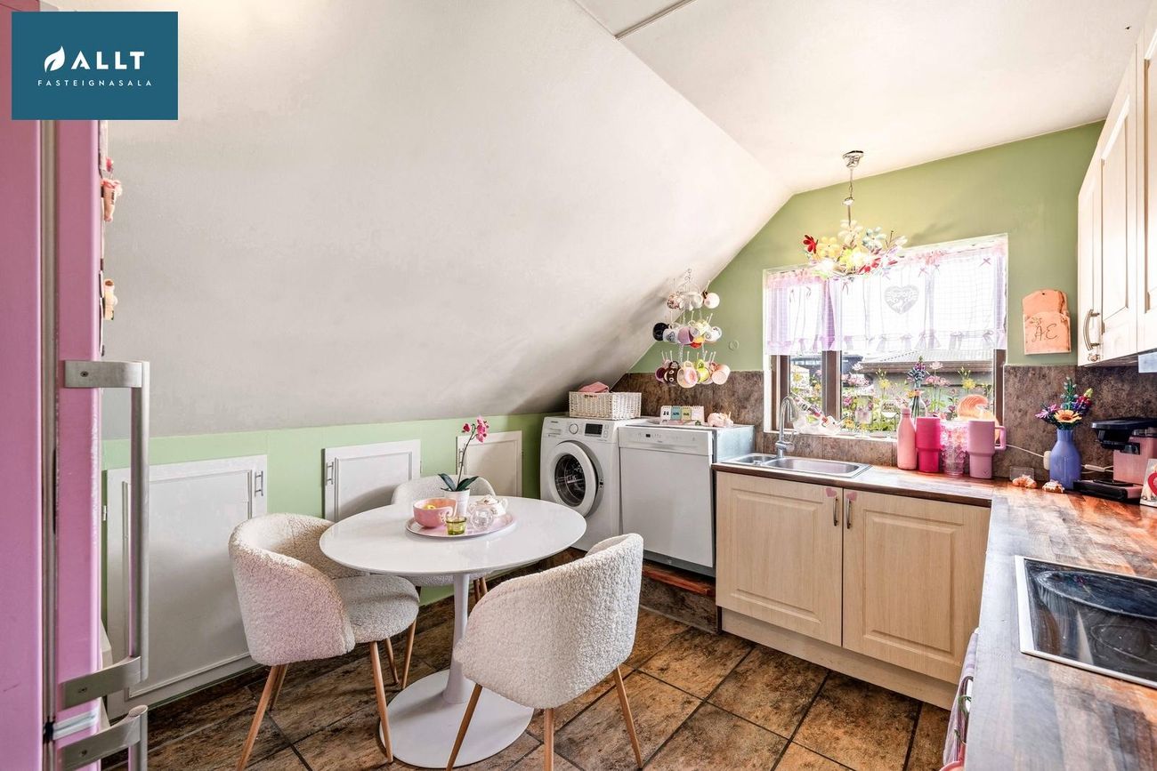 borðkrókur. Tengi fyrir þvottavél er við enda innréttingar. Fellistigi á holi liggur upp á