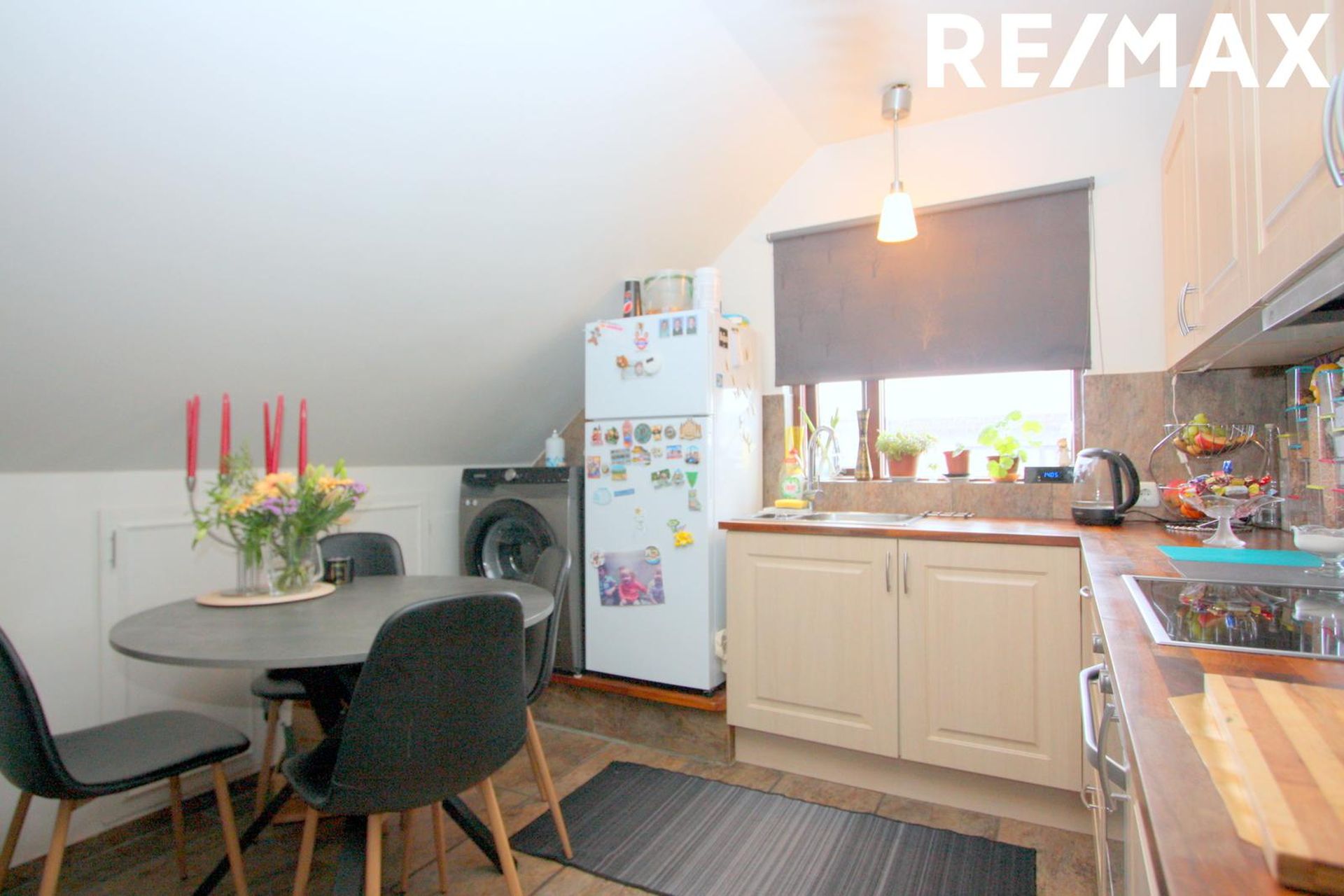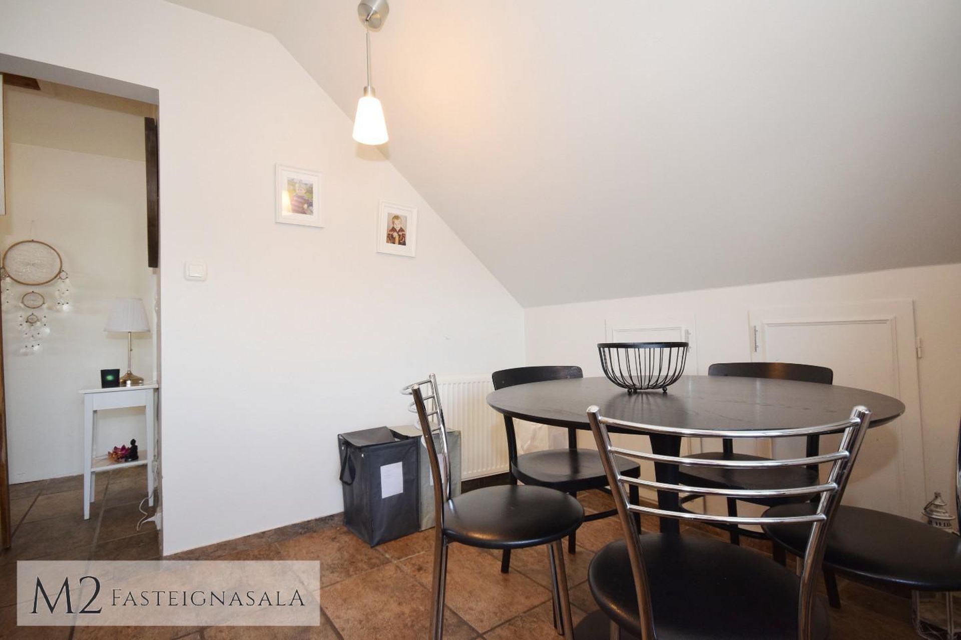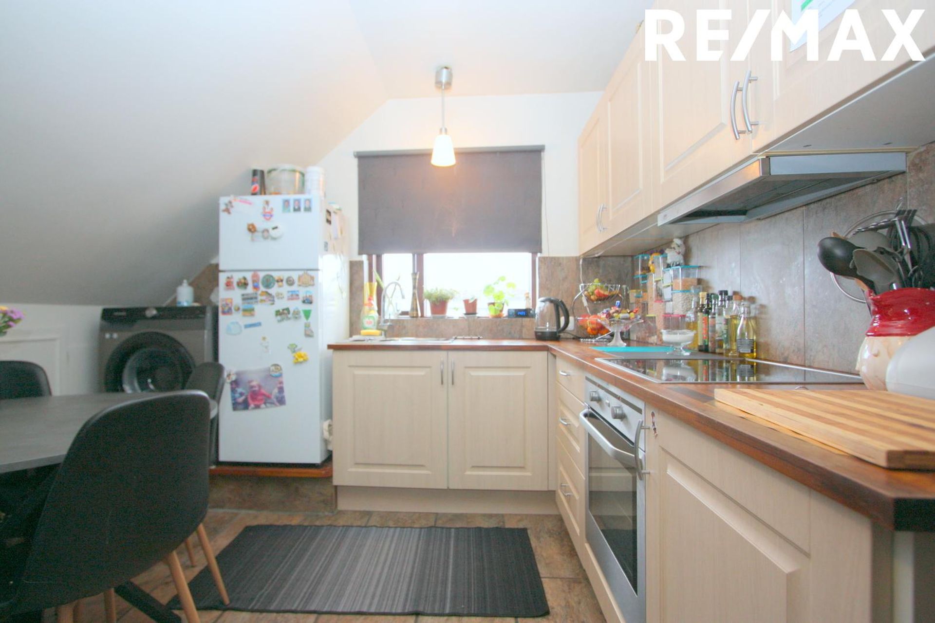 borðkrókur. Tengi fyrir þvottavél er við enda innréttingar. Fellistigi á holi liggur upp á