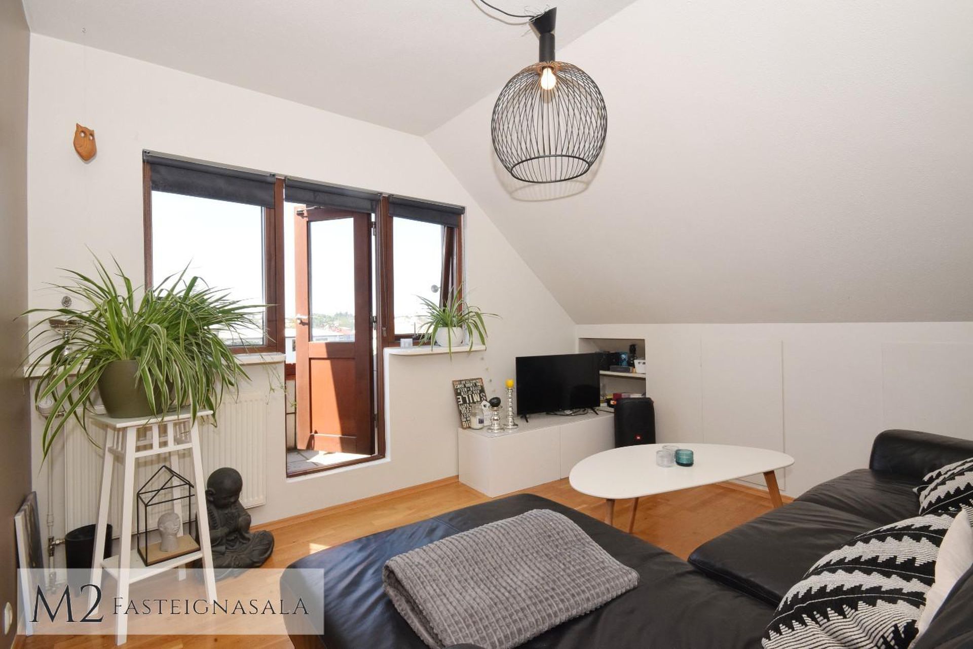 Stofa er með nýlegu harðparketi á gólfi, úr stofu er gengið út á flísalagðar