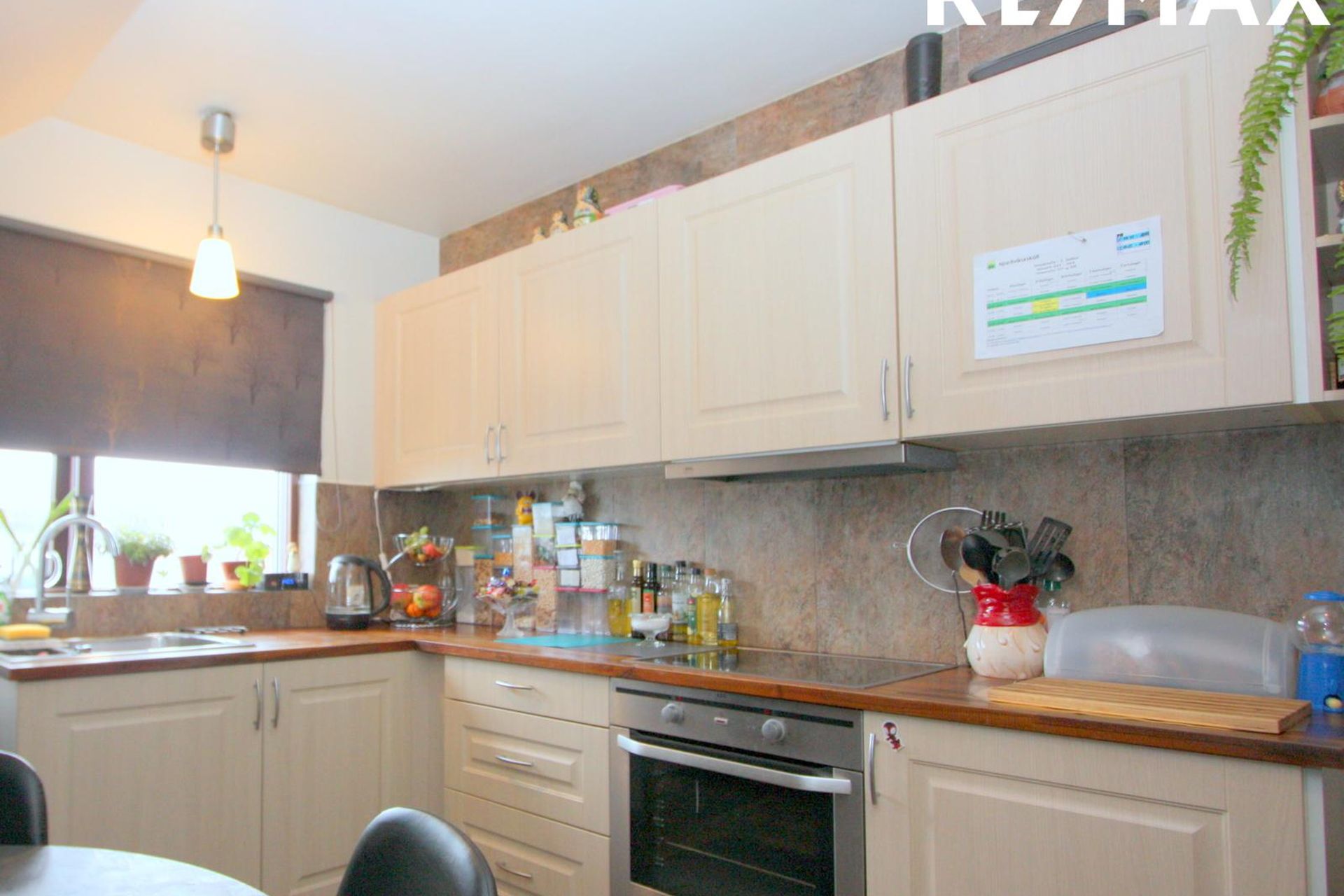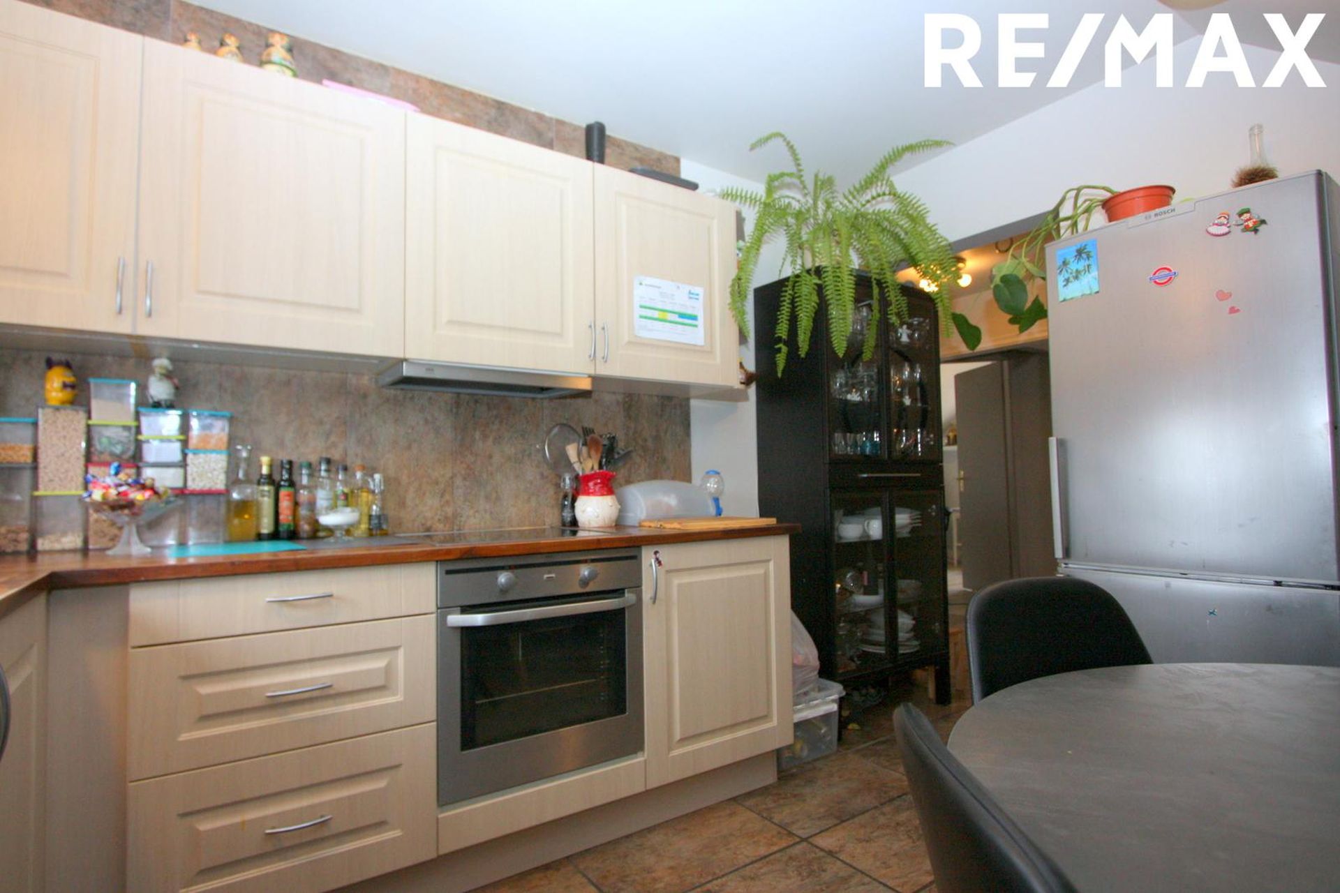 Eldhús er með ljósri innréttingu og góðau skápaplássi, flísar á milli efri og neðri skápa, bökunarofn með helluborði, flísar á gólfi og