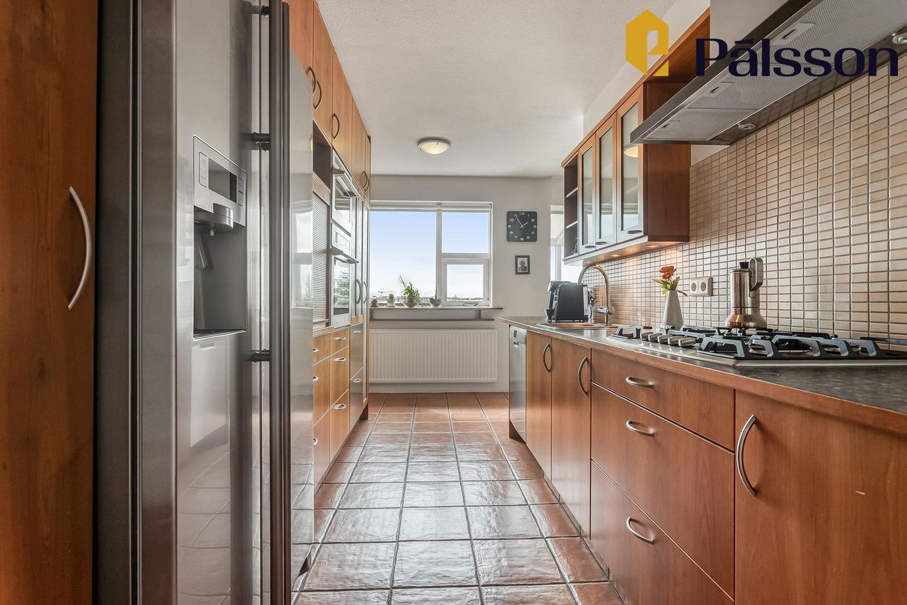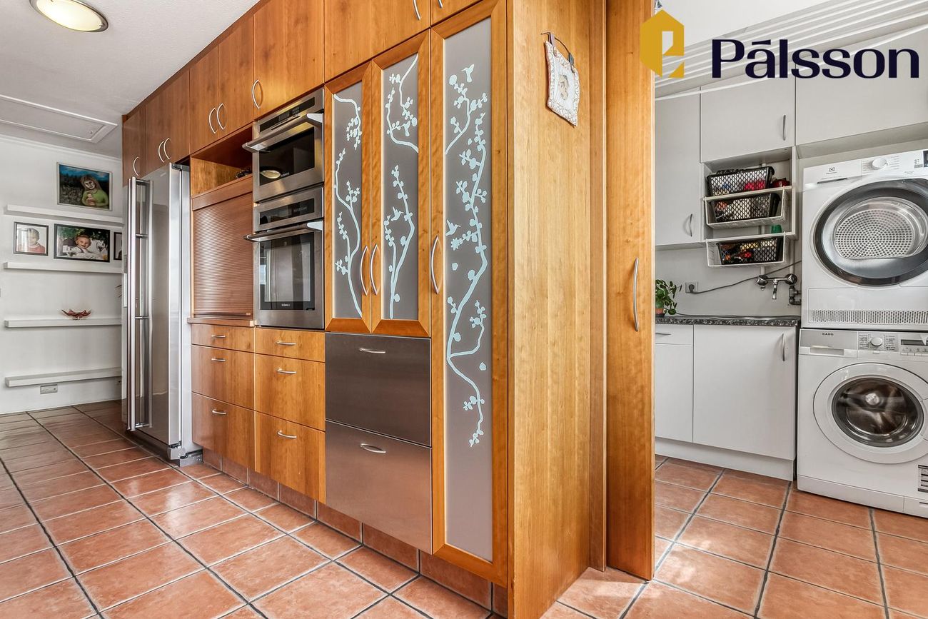 Þvottavél og þurrkari í þvottahúsi. Eldhúsið með góðri innréttingu.